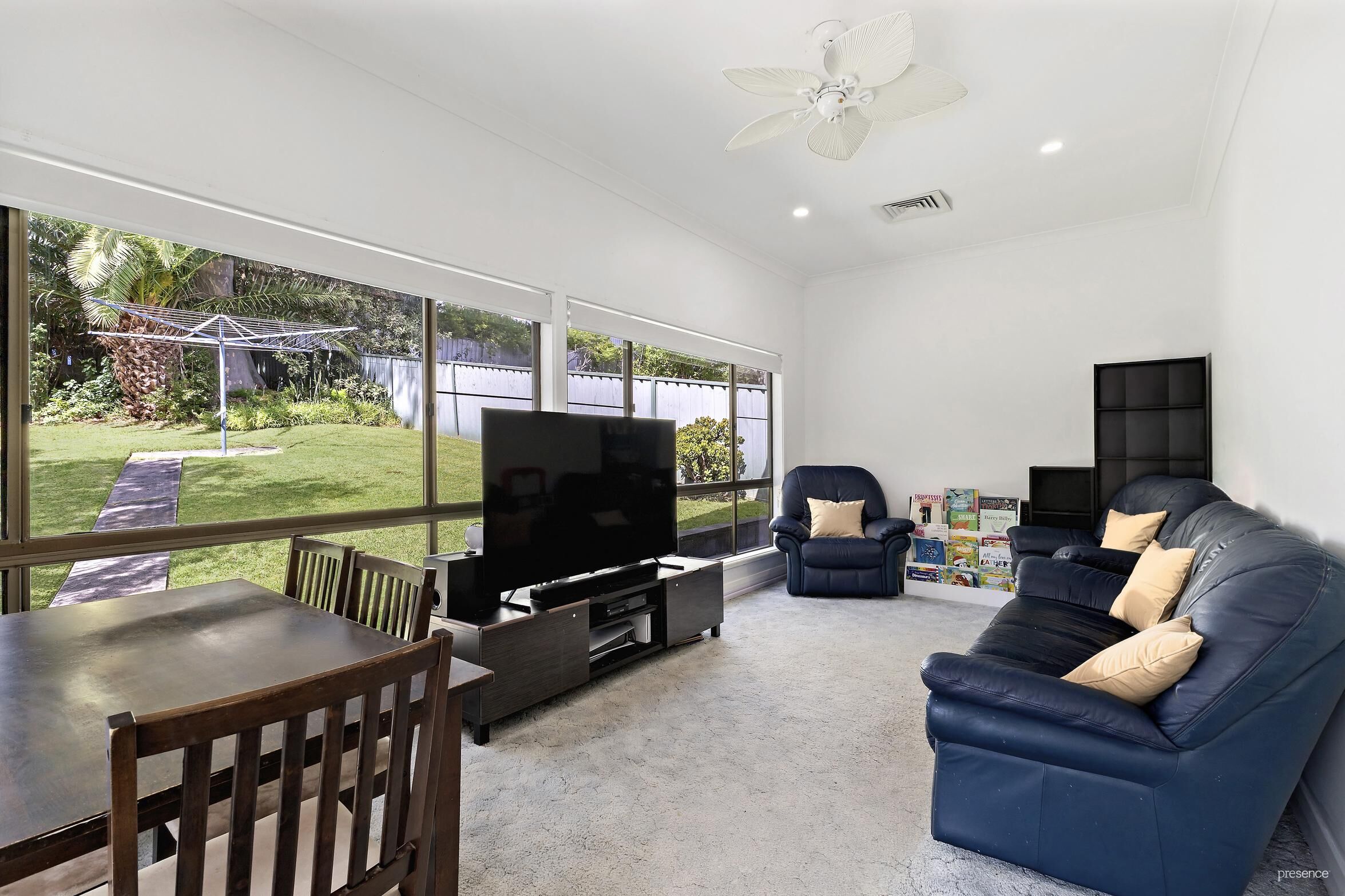 At the rear, the layout opens into a more relaxed, connected space. Open plan living and the kitchen connect effortlessly, anchored by large picture windows that draw your attention straight out to the private, leafy backyard. It’s a setup that allows you to be at the kitchen bench prepping dinner, stretched out on the lounge, or hosting friends, all while keeping an easy eye on the kids outside. The greenery softens everything, giving the space a calm, settled feel.
