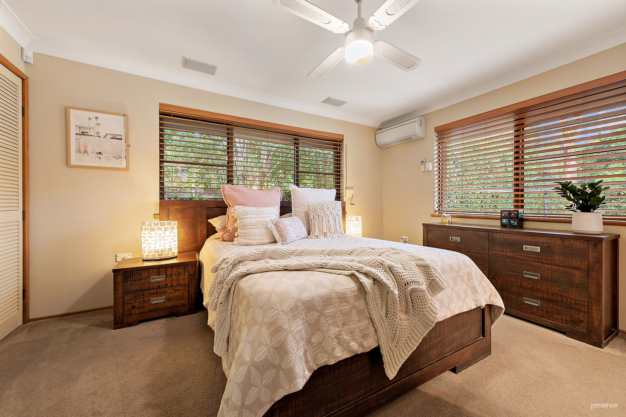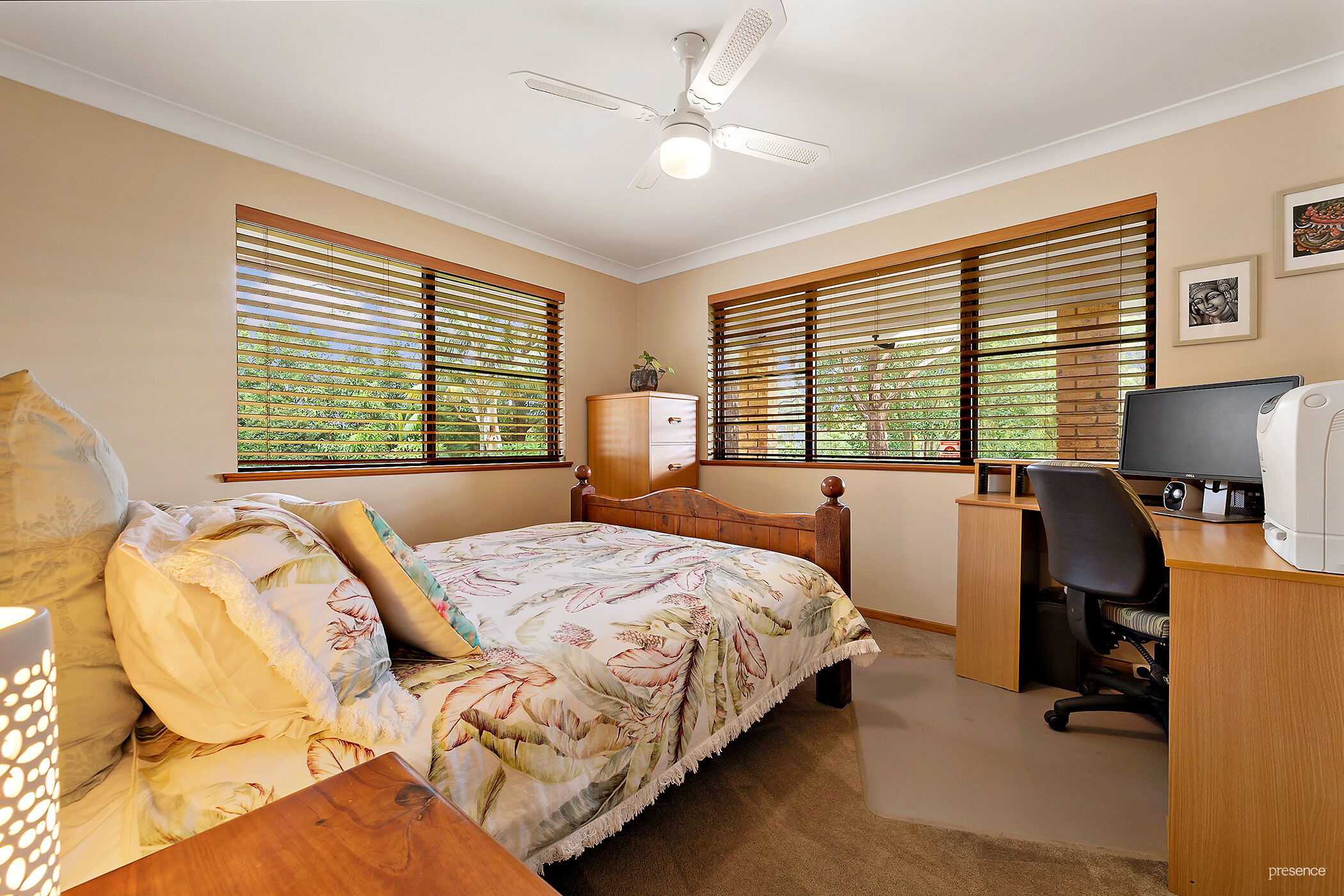 • 3 good-sized bedrooms, all with carpet, ceiling fans, built-in robes and leafy views; the main bedroom includes air conditioning, double robes and an ensuite with shower, toilet and vanity