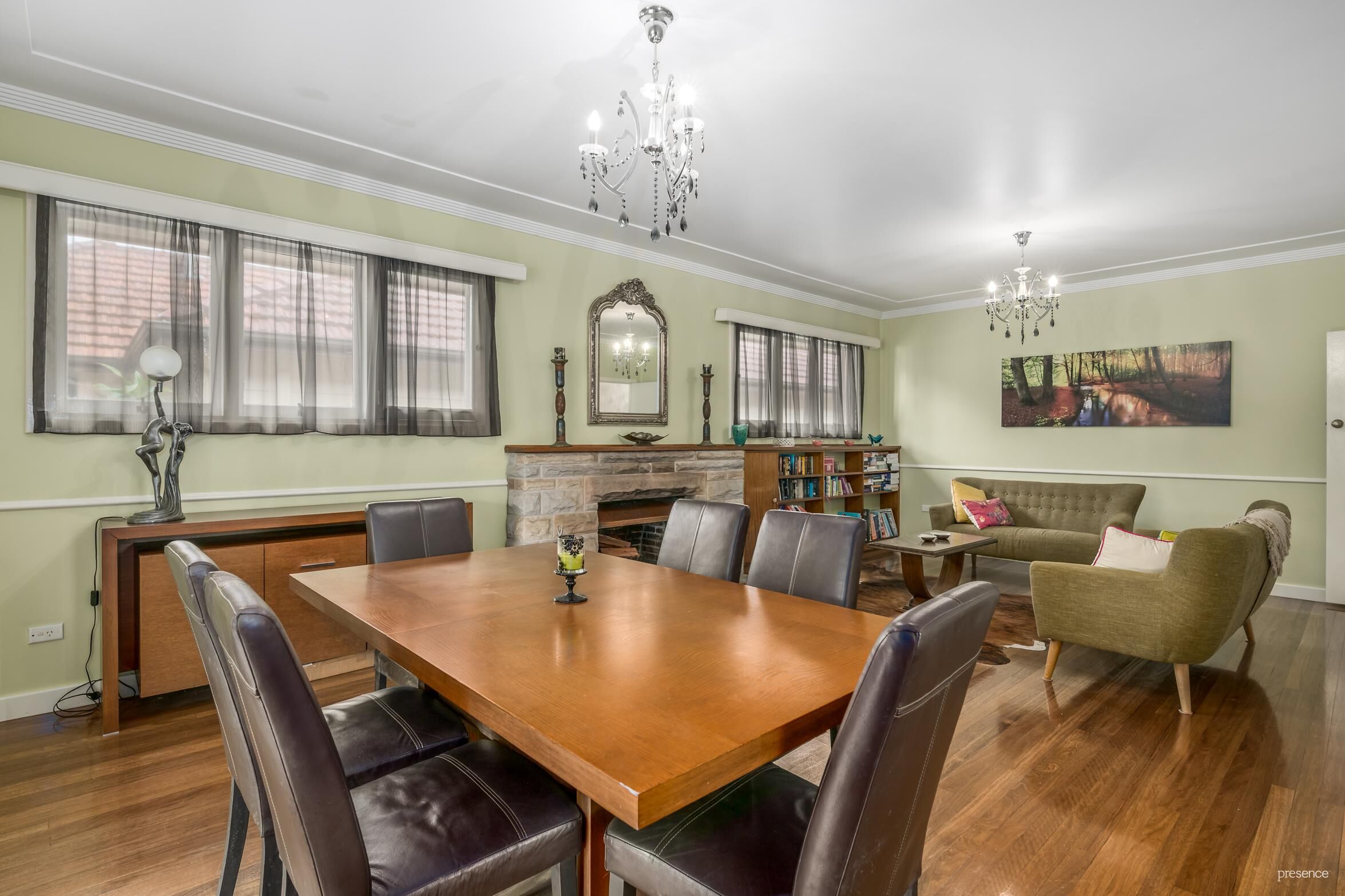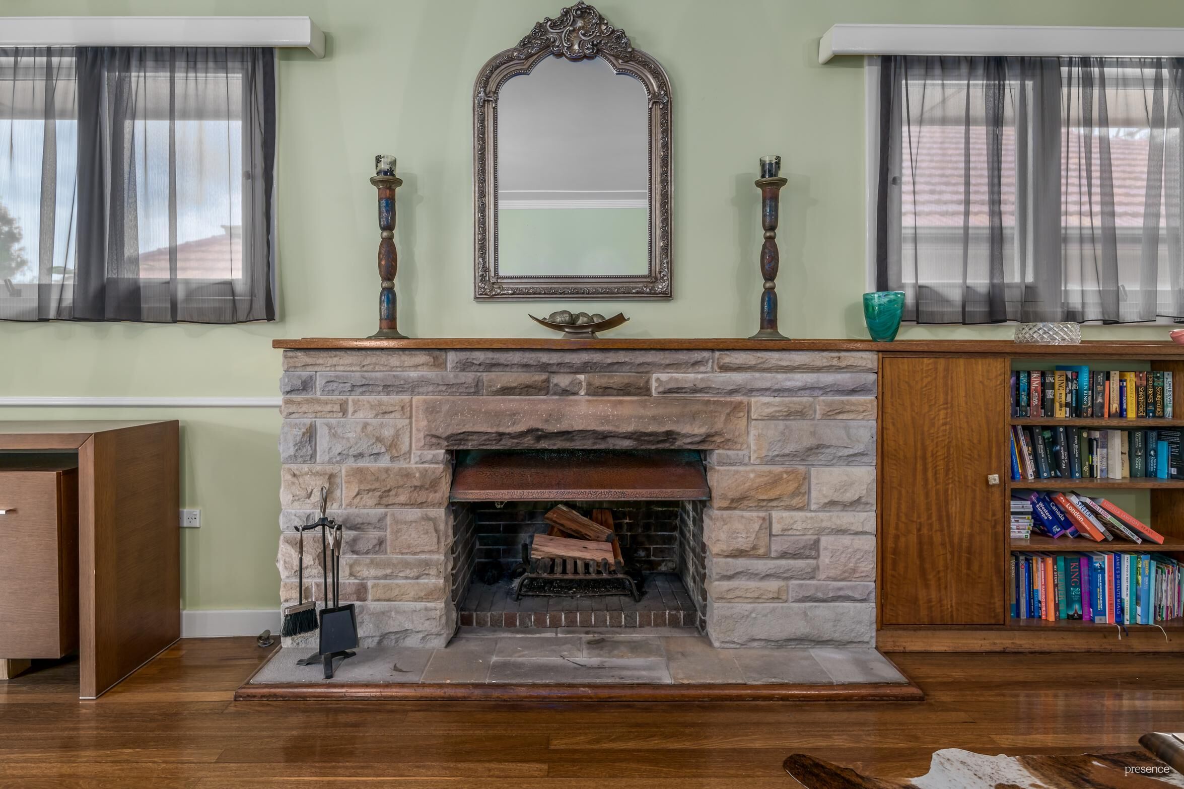 – Formal lounge and dining with wood fireplace, original shelves and woodbox