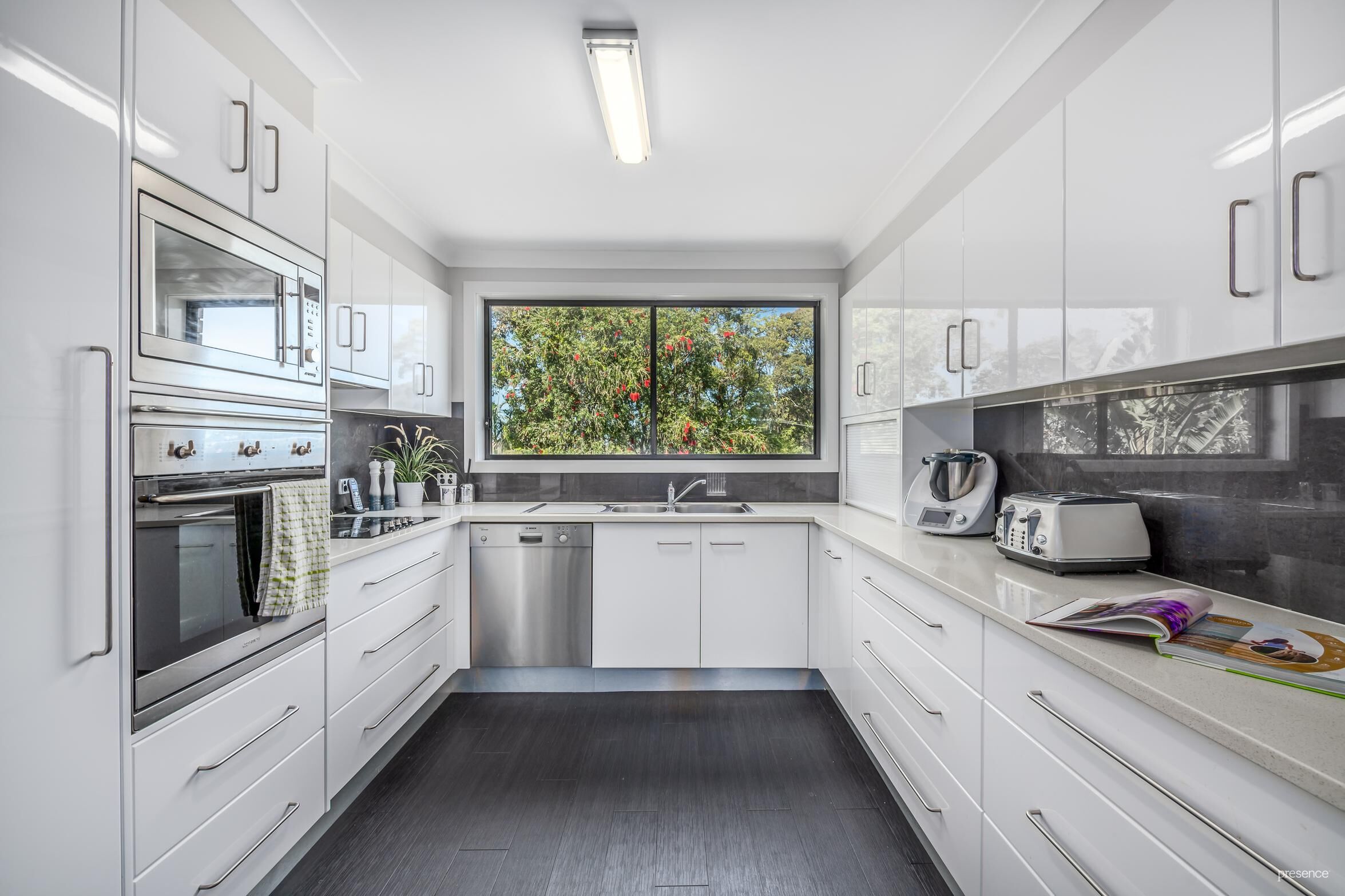 – Caesarstone kitchen with Bosch dishwasher, electric cooktop, breakfast bar and leafy outlook