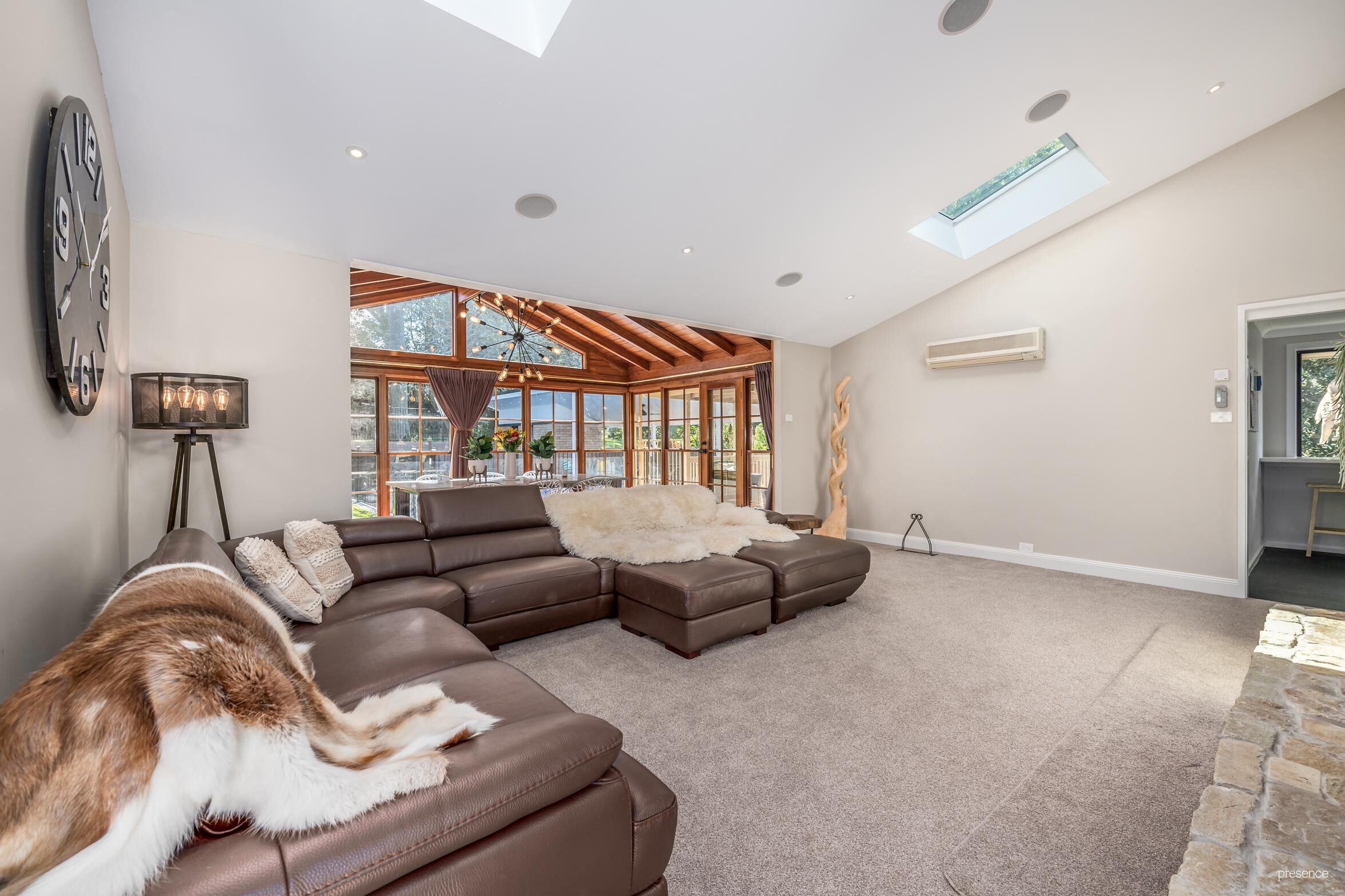 Set back from the street introduced by established front gardens, step inside to an open plan layout and a canvas of plush new carpet and neutral décor. Cathedral ceilings and sky lights enhance the sense of space and air conditioning and a stone fireplace provide seasonal comfort. The kitchen sits to one side featuring stone benchtops, a breakfast bar and quality appliances while the dining room connects via two sets of French doors to the alfresco entertaining areas. There are five bedrooms in total including a spacious parent’s retreat that includes an ensuite, walk-in robe and access to the front verandah. Downstairs offers even more room with internal access from the double garage and a couple of multi-purpose spaces that teenagers will love.