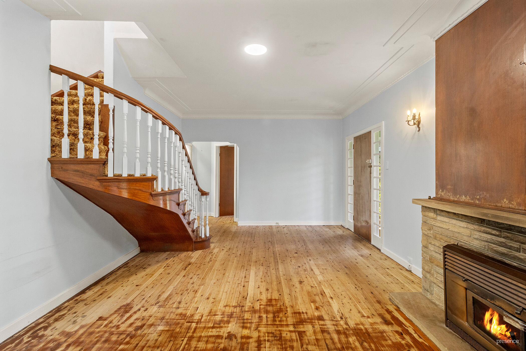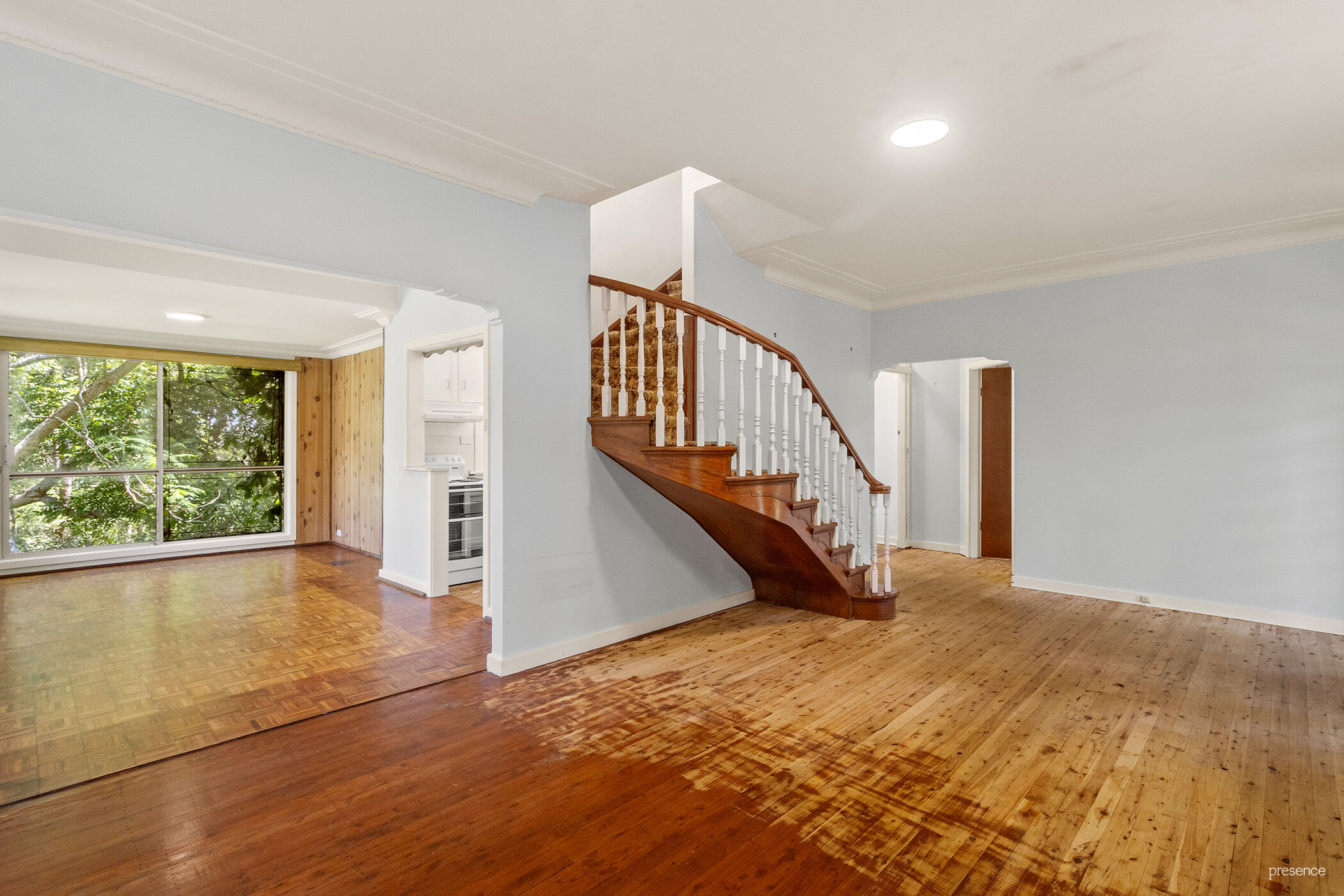Step inside and you’ll find tall plaster-crowned ceilings and warm timber floors that guide you through an open-plan living and dining area. There’s history in every detail here, from the ornate curved timber staircase to the quarter-pane sash windows that let in peaceful views of your leafy block.