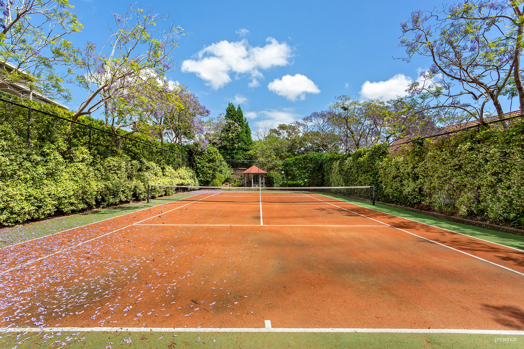 – Full sized tennis court with all-weather surface, mesh fencing and modern quartz halide lighting.