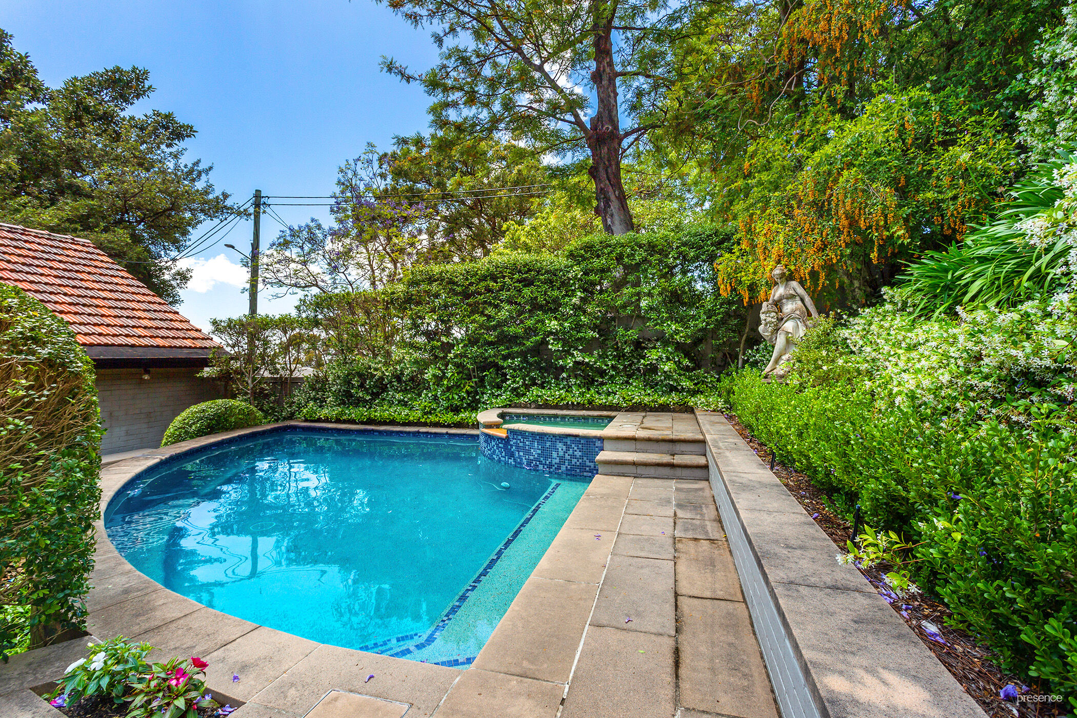 – Architect designed pool and spa with gas heater and Chemigem automatic chlorinator.