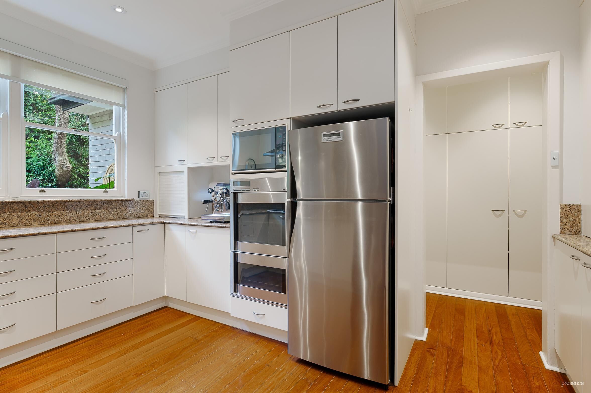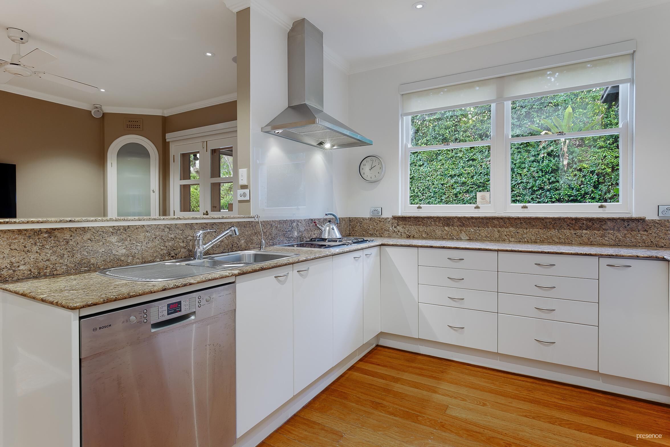 Beautiful natural light, timber floors and French doors make a stunning statement in an open plan living zone that integrates a granite-topped kitchen featuring an abundance of cleverly arranged storage options, quality appliances and a butler’s pantry. A warming winter fireplace is a beautiful focal point in the formal lounge and dining room.