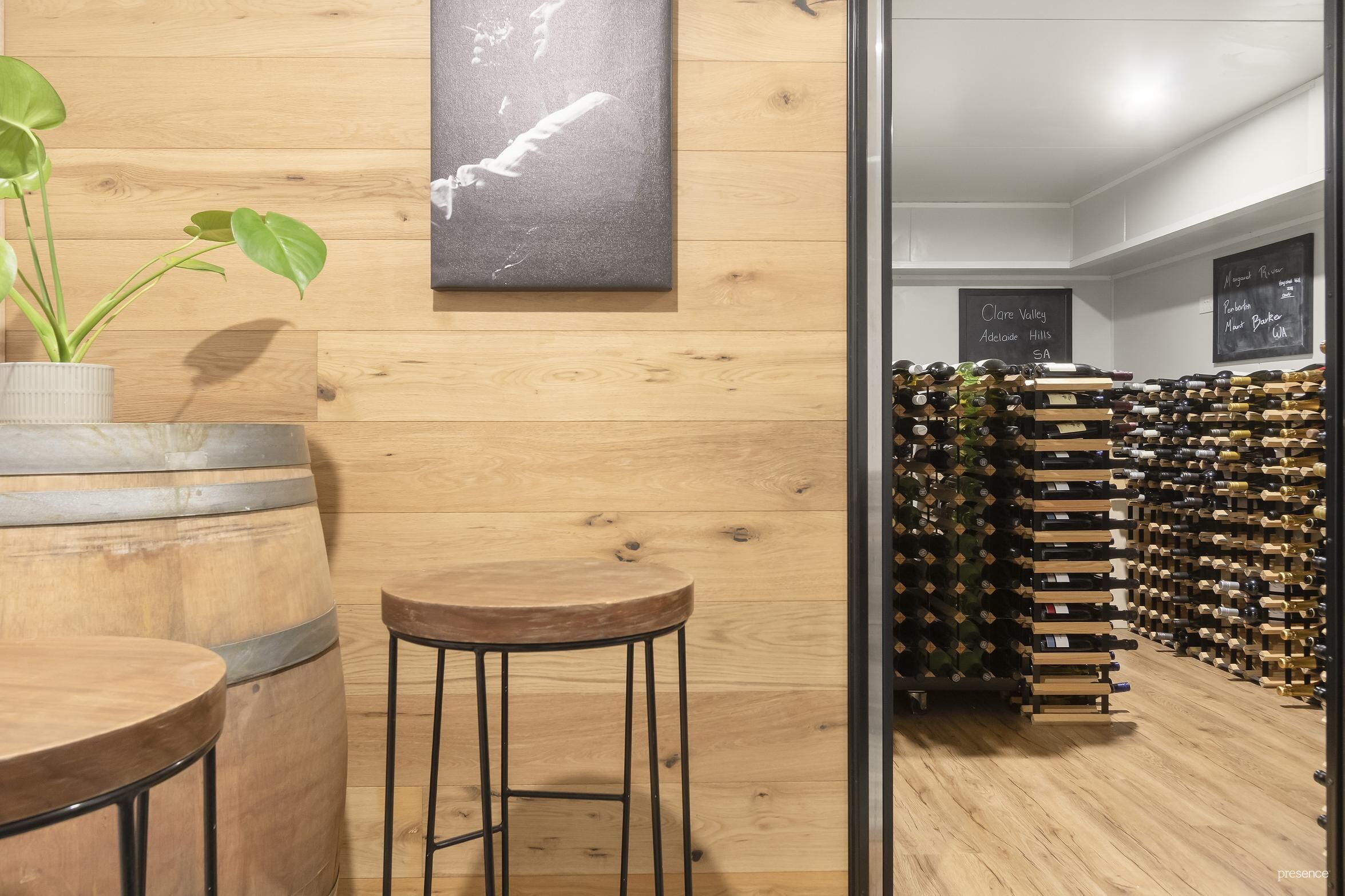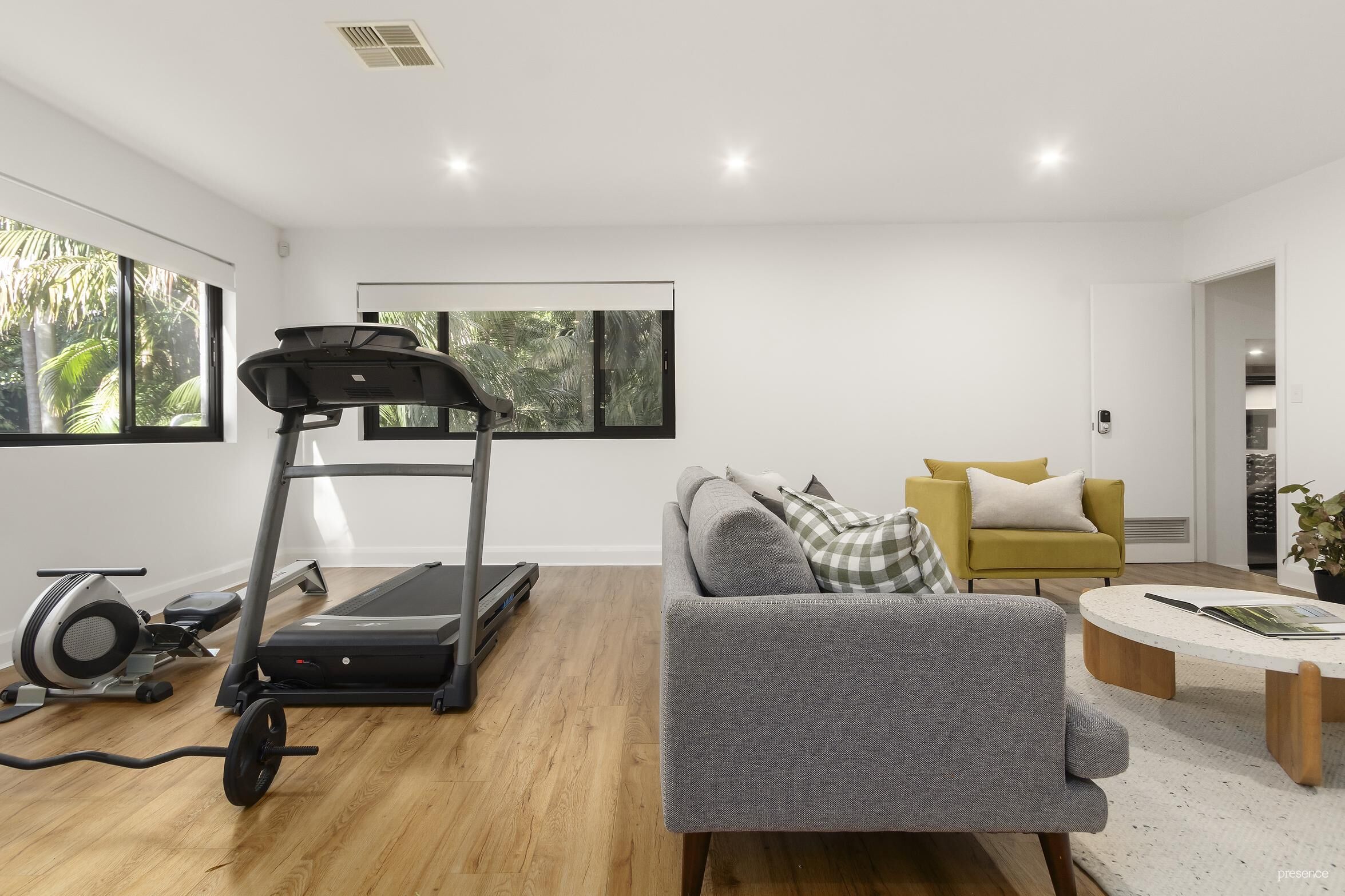 The split-level design boasts four bedrooms, three bathrooms, a home office area, spacious rumpus room, and a temperature controlled wine cellar. The central floor unveils an expansive open-plan living area seamlessly integrated with a stunning island kitchen and butler’s pantry. Purposefully arranged, the formal dining space, master ensuite, and media room converge to direct attention toward the captivating tapestry of adjacent tropical gardens.