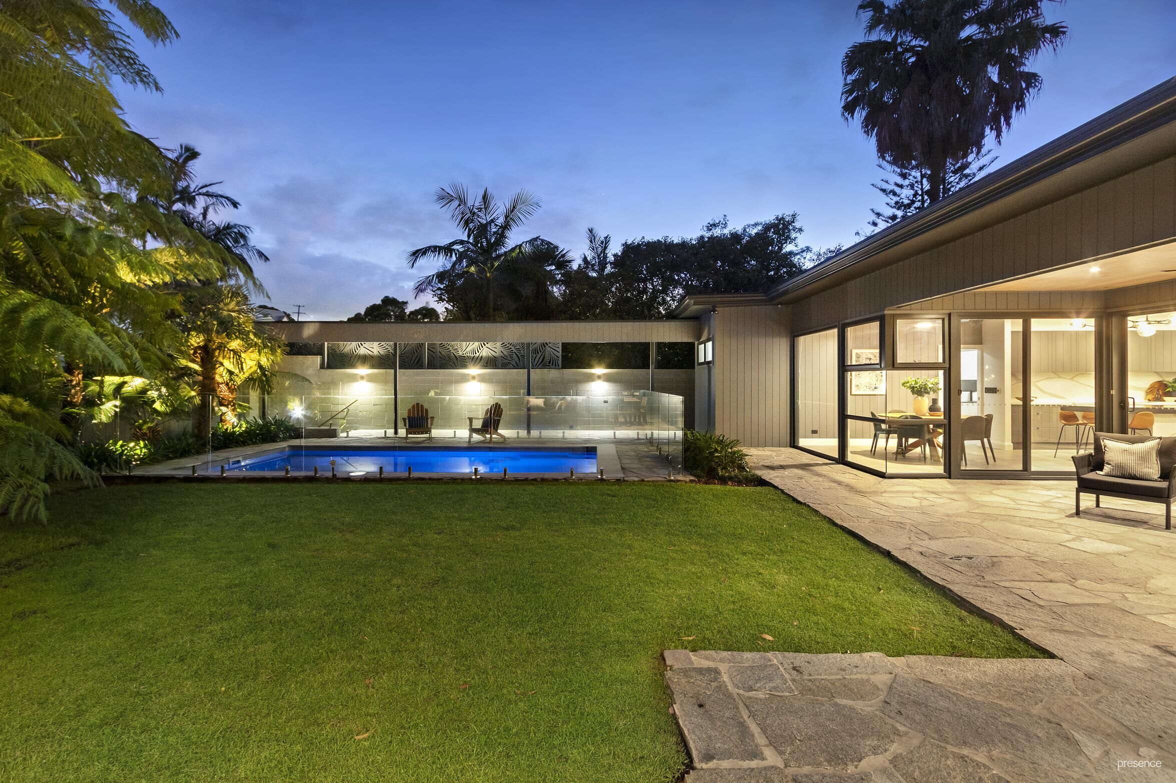 On arrival at the residence, you’ll discover an architectural ode to Californian Desert Modernism. Tall palm trees sway gracefully above, complementing flat, unobtrusive roof lines, a sunken dining room, and a single-level indoor-outdoor living space seamlessly connecting to a 7.5m swimming pool, and a barbecue entertaining area, creating an oasis of luxury.