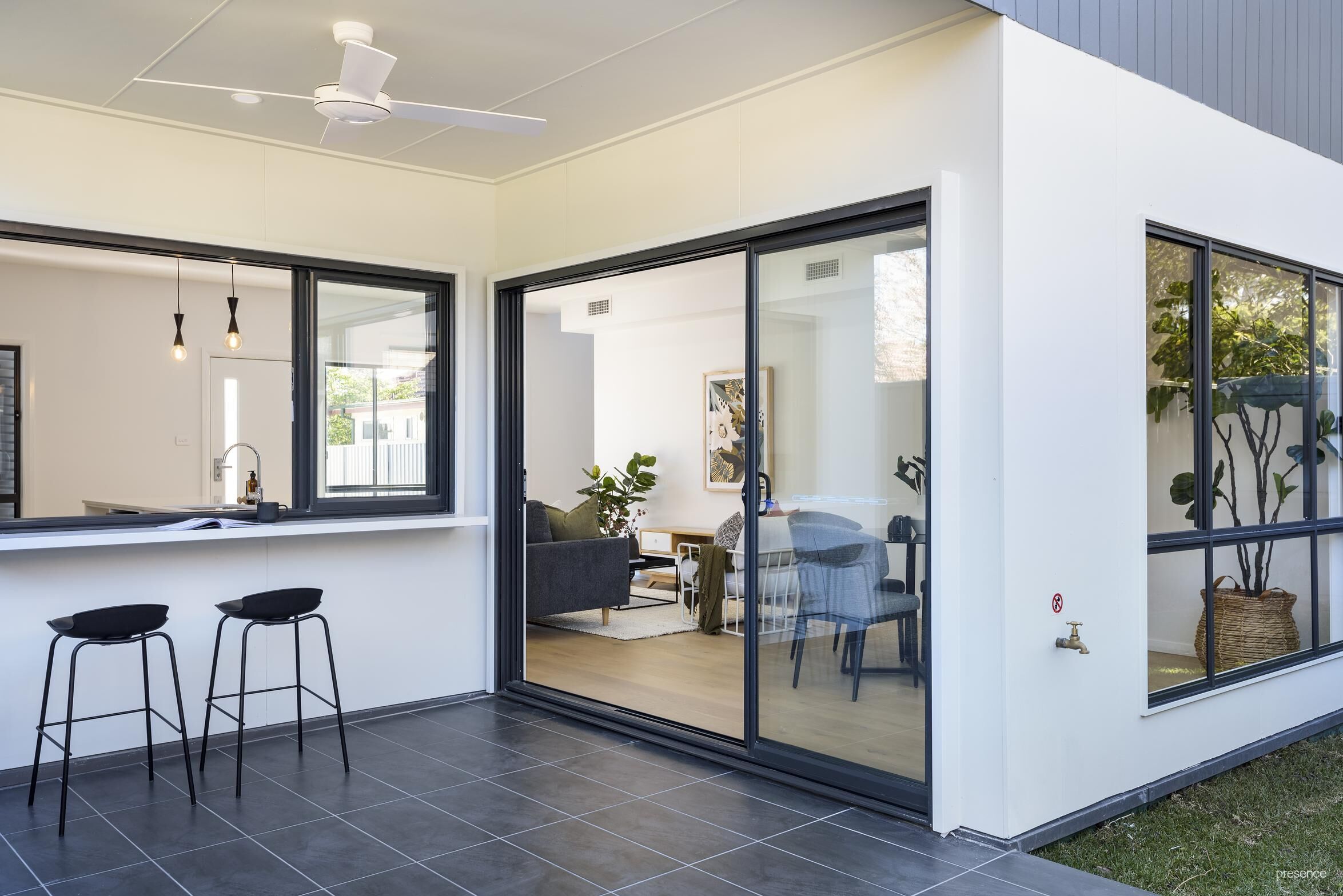 Servery bar connects kitchen to tiled alfresco entertaining area with ceiling fan