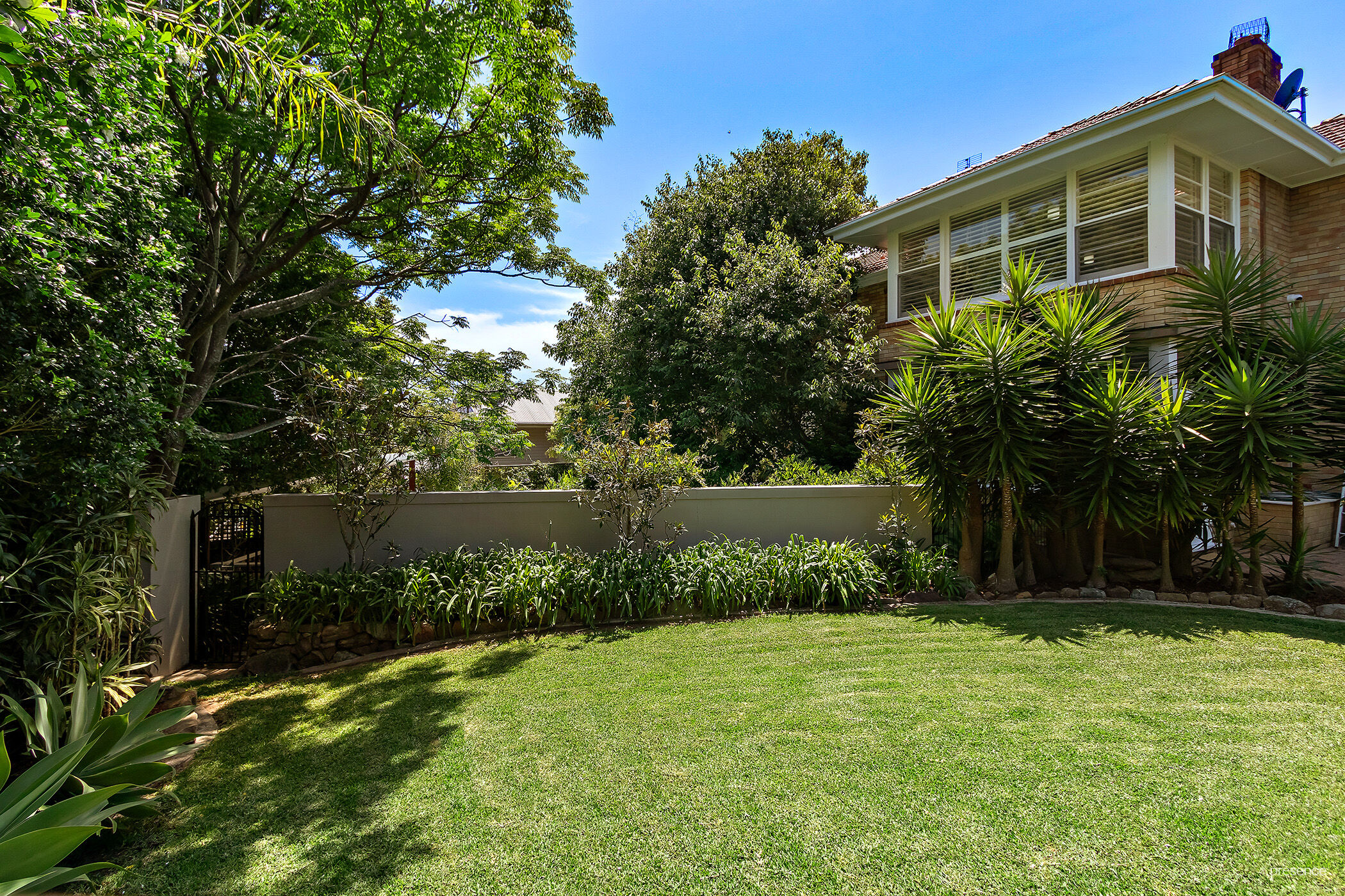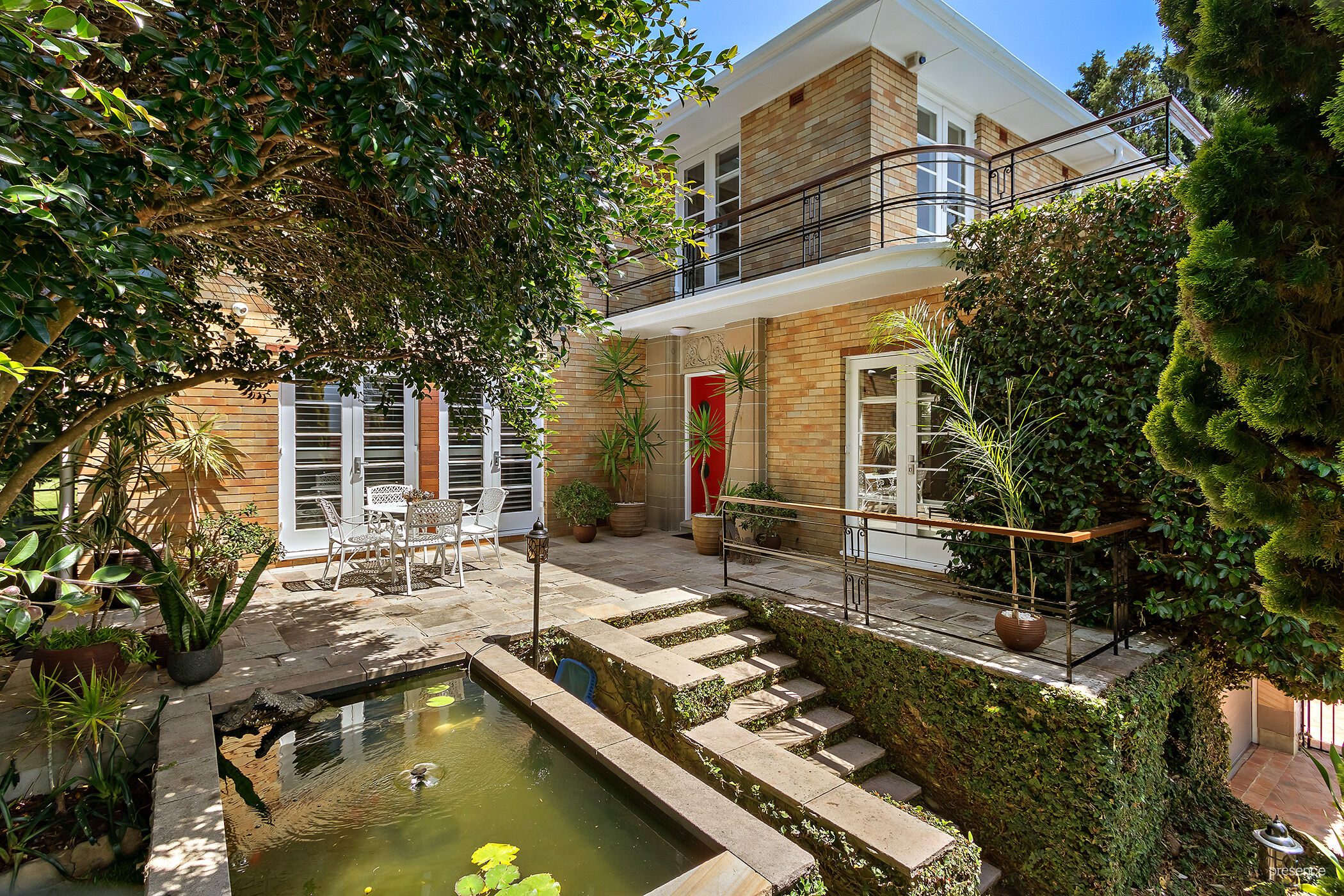 The grand staircase is the centrepiece of this residence and harks back to the home’s art deco heritage, but you will also be captivated by the high ceilings and clever use of windows that capture beautiful views of the established gardens and city skyline. Once upstairs, you will find a massive master suite with built-in robe, window seat and access to a large terrace, as well as an updated ensuite with full-size bathtub. Two additional generous bedrooms with built-in robes and plantation shutters, and another bathroom, complete the top floor. Entertainers will love the “man cave” on the ground floor, complete with kitchen and wine cellar, which leads out to the leafy alfresco sandstone terrace for the ultimate in poolside socialising or relaxing.