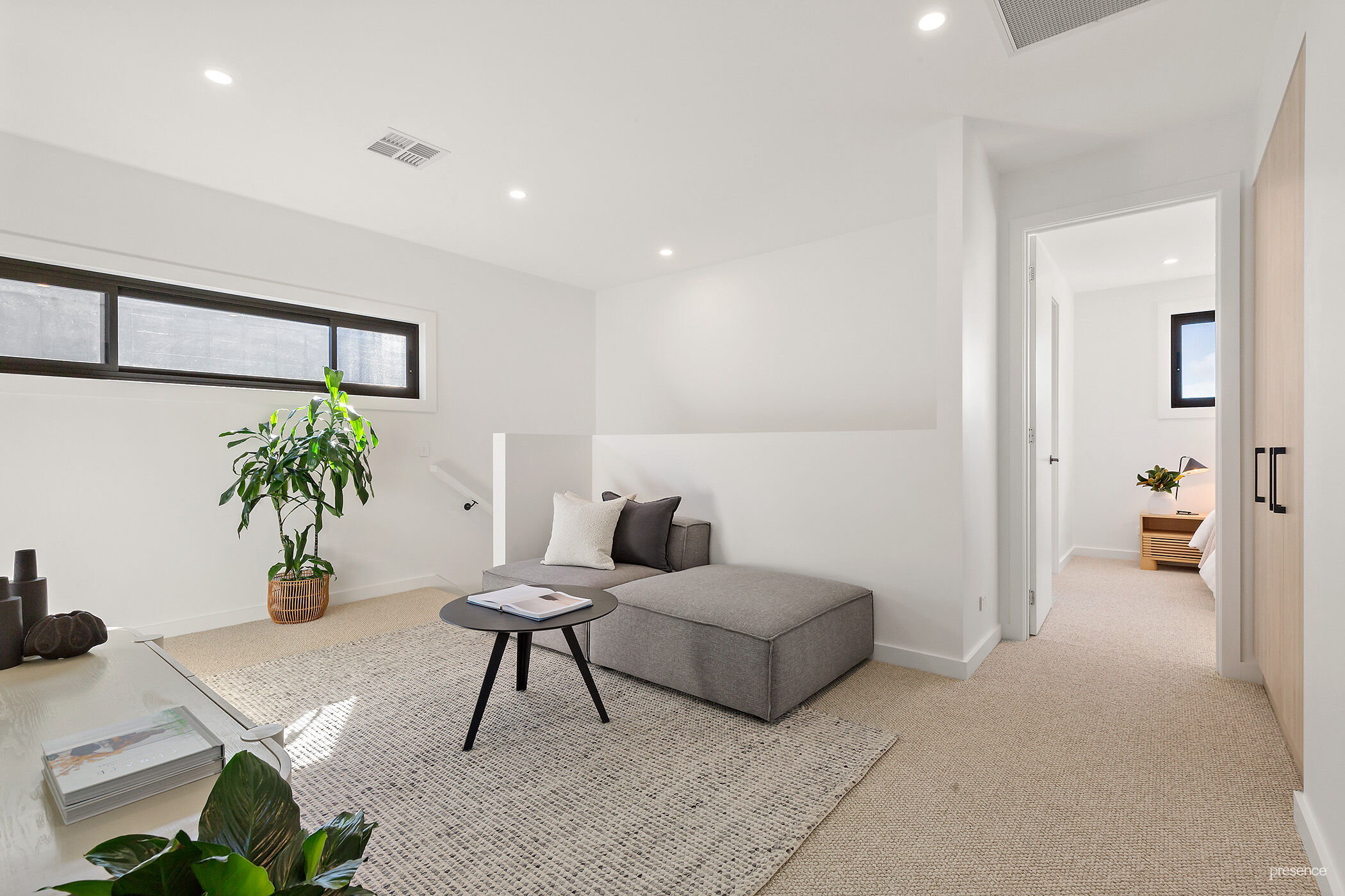 Upstairs, the sense of refined luxury continues. Three further bedrooms include a sumptuous master suite with walk-in robe and a hotel-inspired ensuite, complete with a freestanding bath, rain shower, and twin sinks. The main bathroom echoes this attention to detail with floor-to-ceiling tiling, a freestanding bath, and separate shower. Tucked away from the bustle of the main living zones, a cosy upstairs living area offers a private haven for quiet relaxation or play. Completing this sublime home is the added bonus of a remote-access garage and off-street parking for an additional vehicle.
