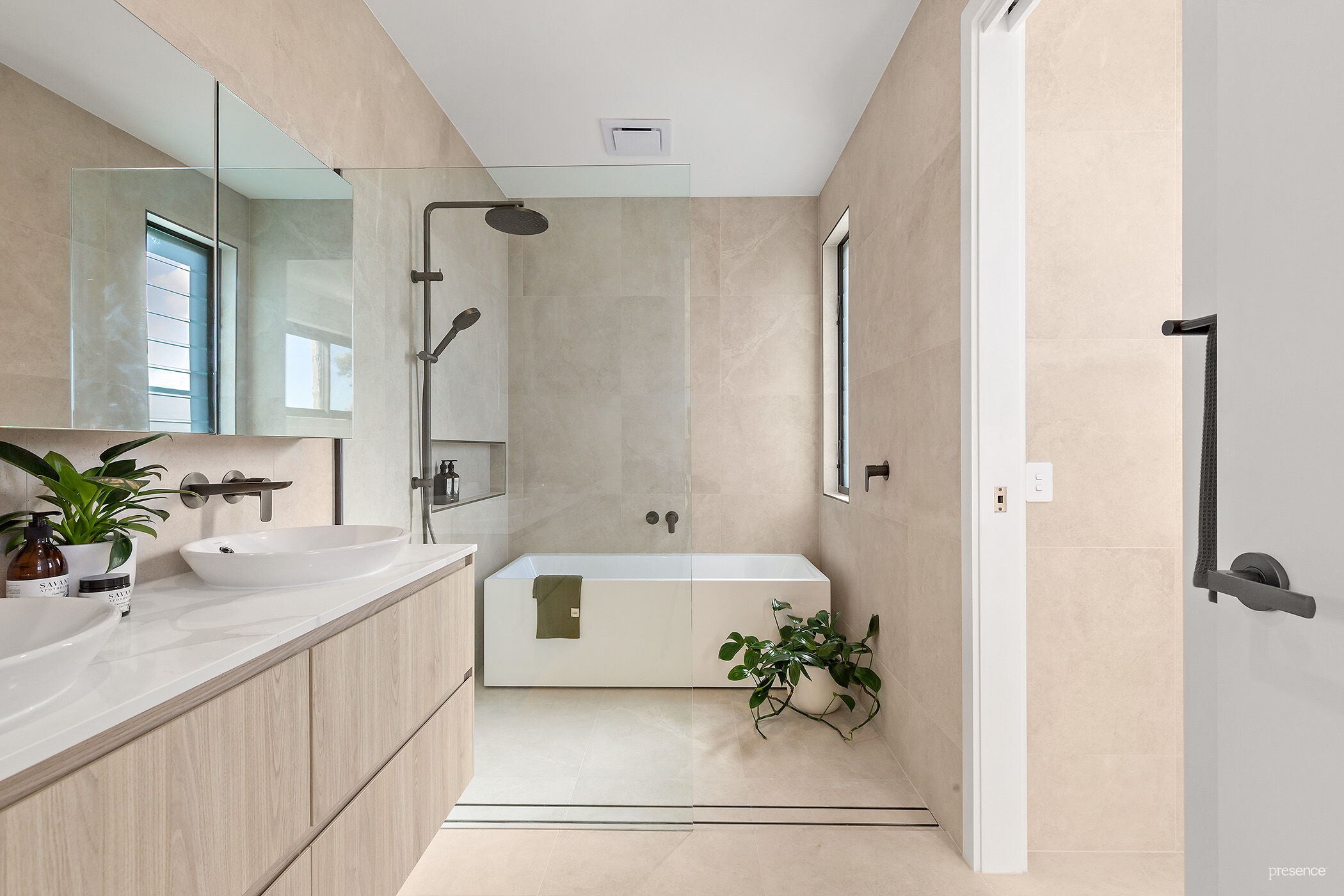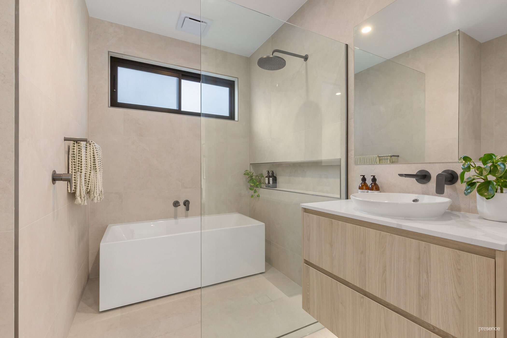 – Three elegant designer bathrooms, all with floor-to-ceiling tiling, including a luxe master ensuite with freestanding bath, shower, and dual vanity; a stylish ground-floor ensuite; and a main bathroom with separate bath and shower.