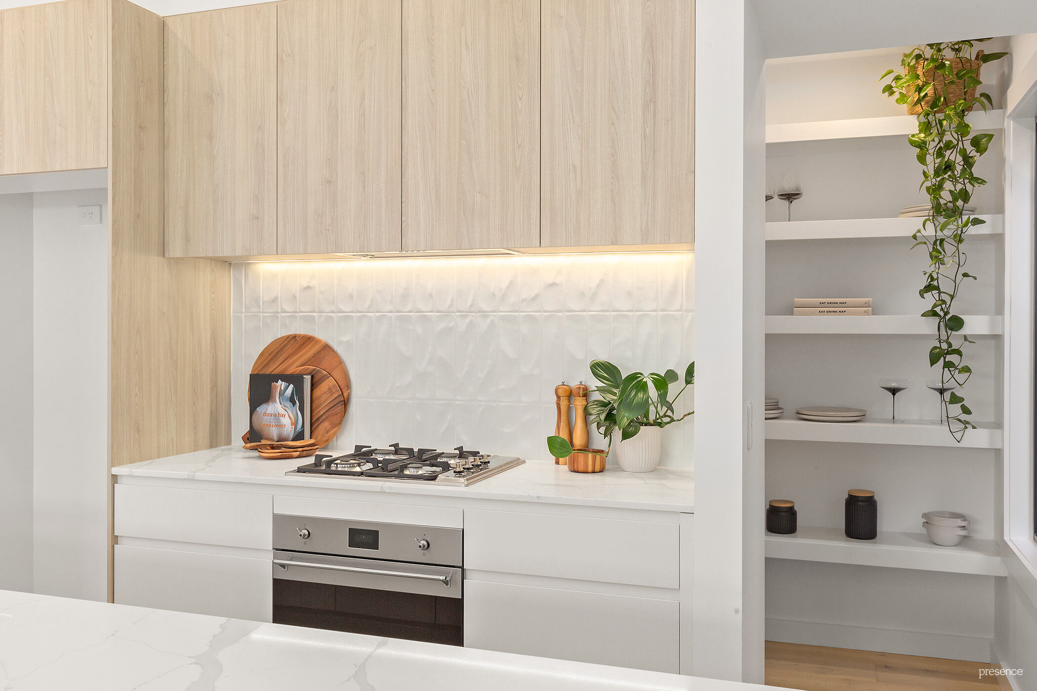 – Sleek designer kitchen featuring stone benchtops, premium Smeg appliances, a butler’s pantry, and extensive storage.