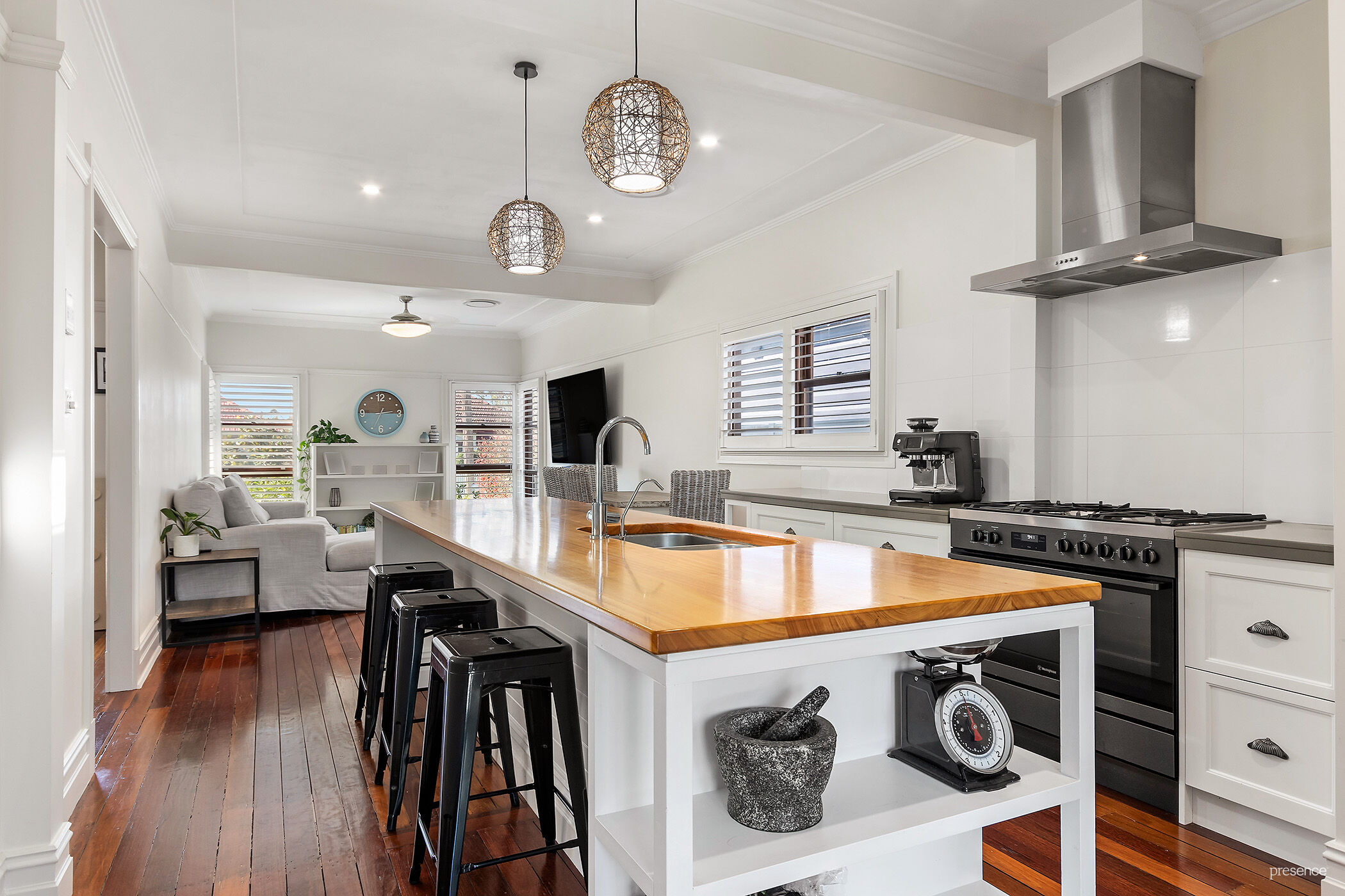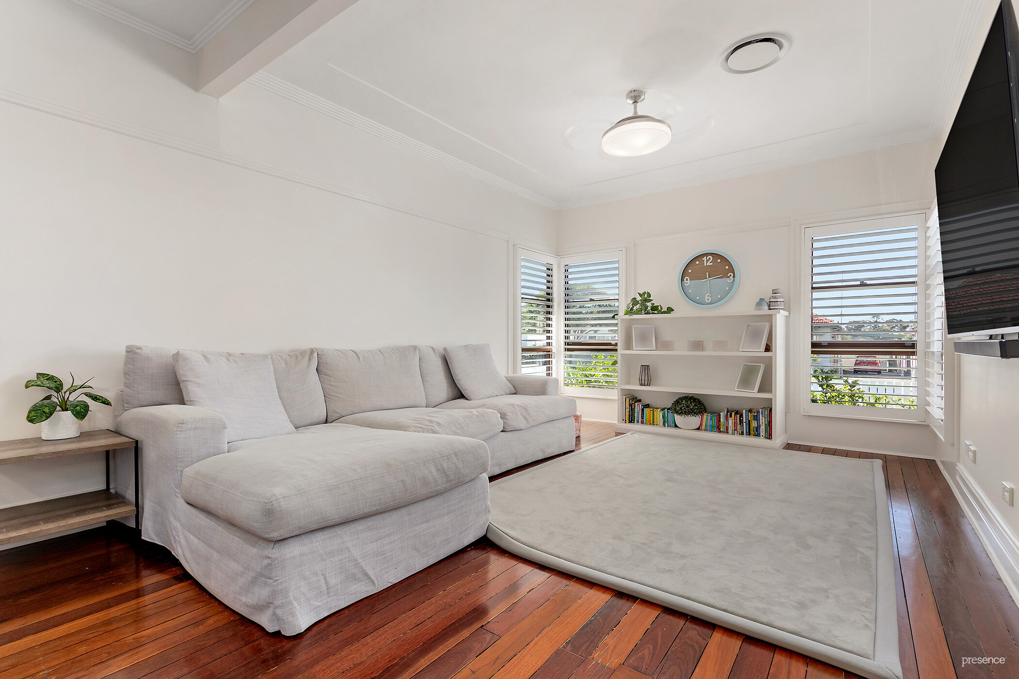 – Light-filled, open plan living and dining zone with plantation shutters