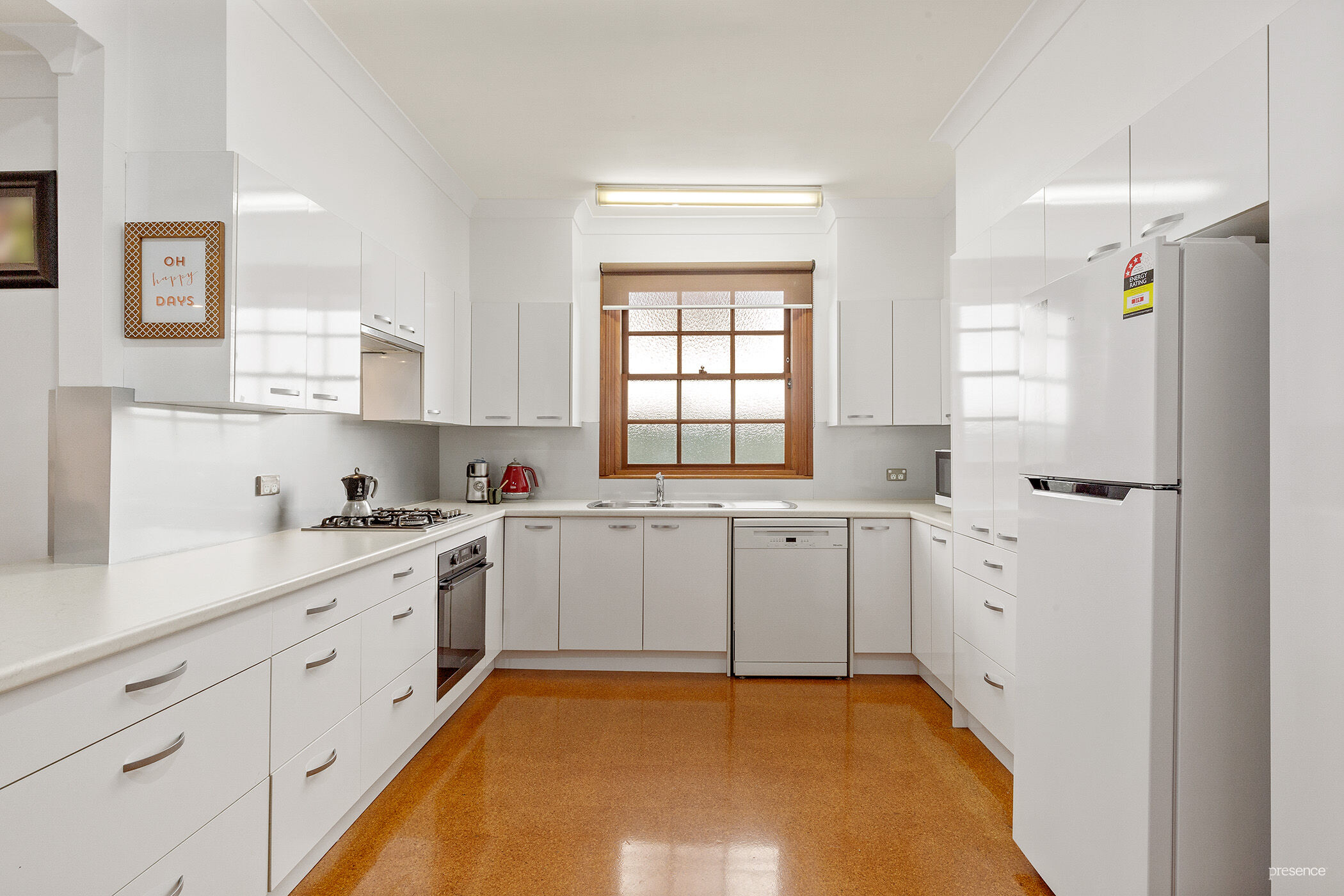 – Large central kitchen, gas cooktop, under bench oven, dishwasher