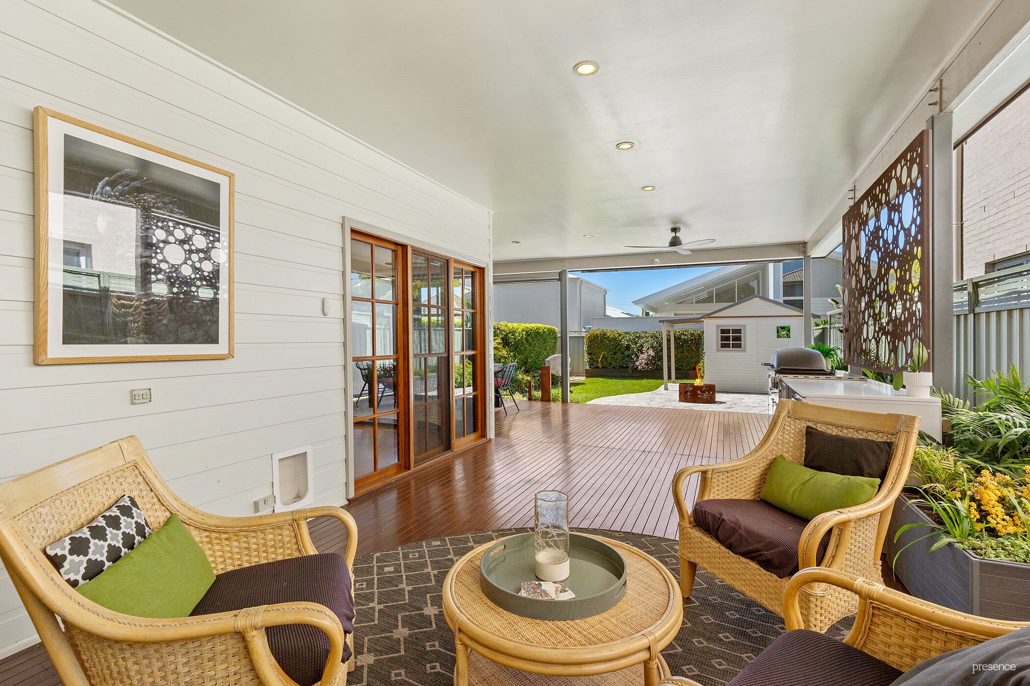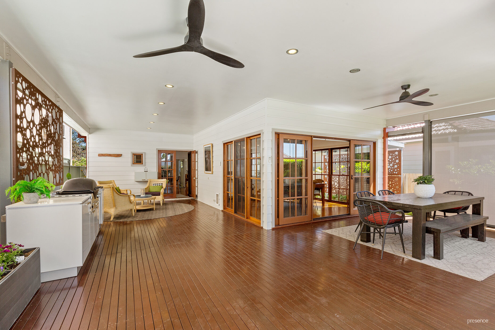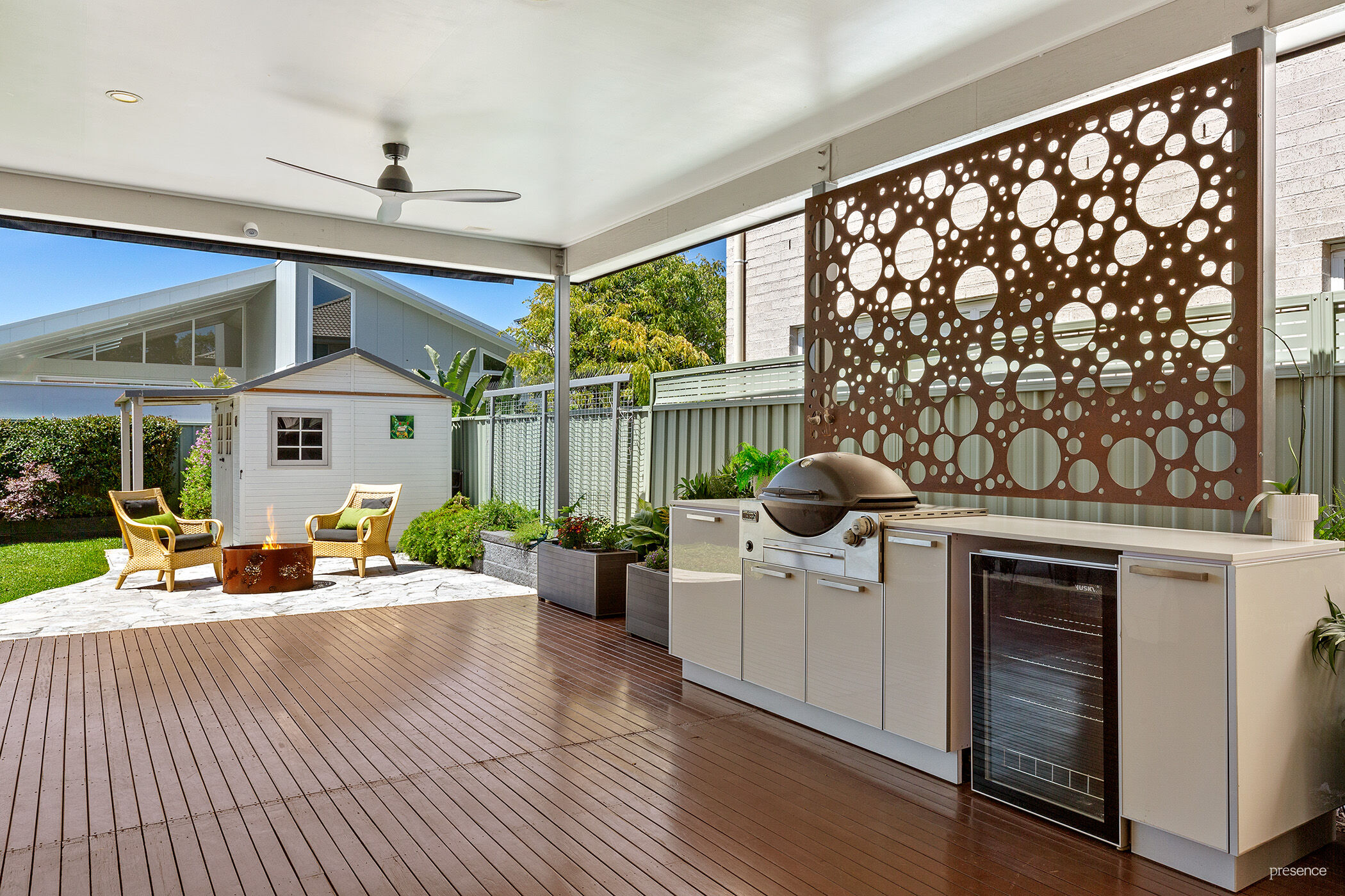 – Entertaining deck with Ziptrak blinds, wind out awning, barbecue and bar fridge