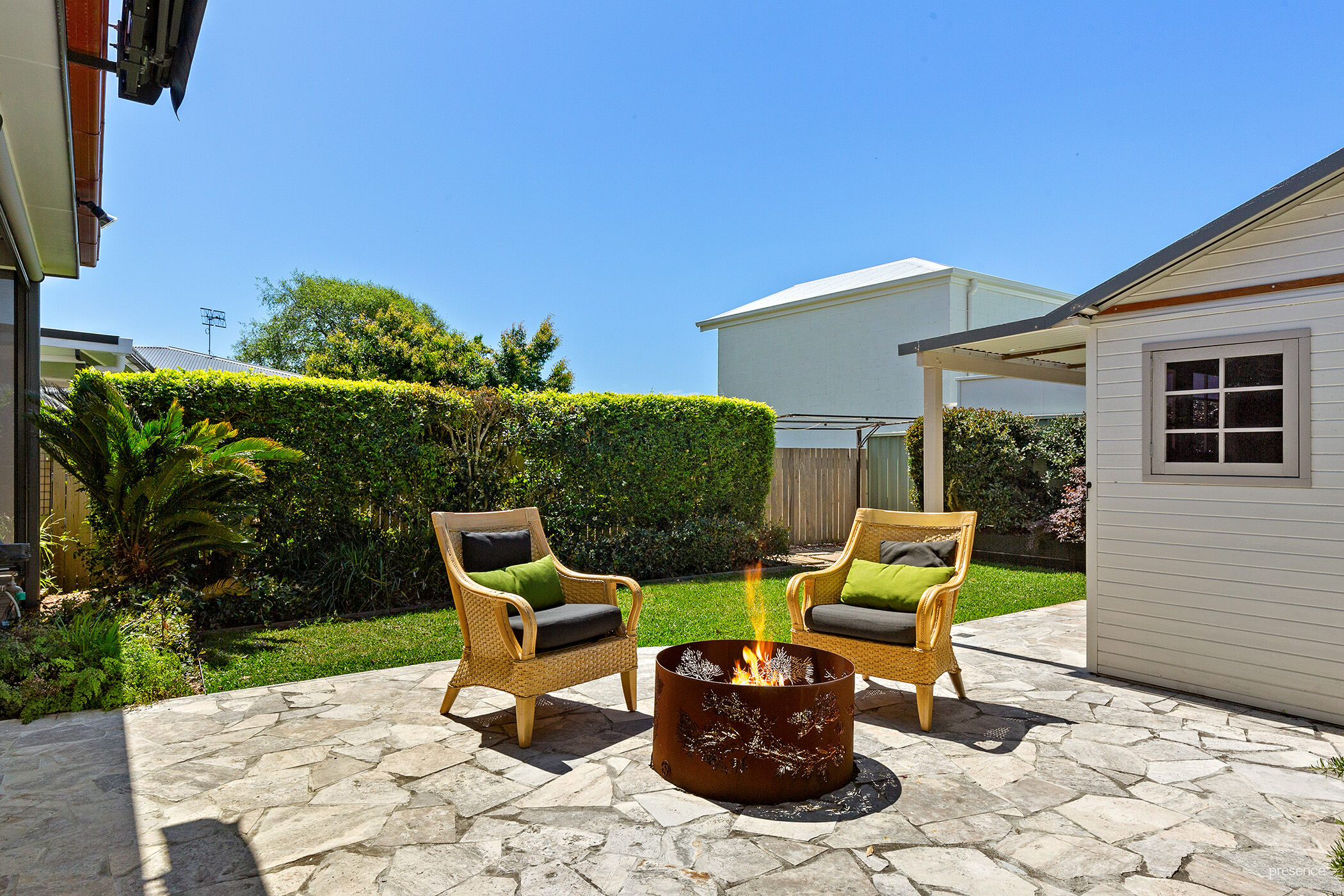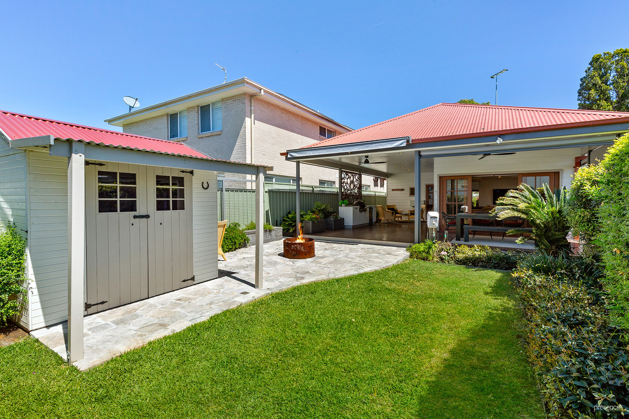 – Private low maintenance backyard with garden shed