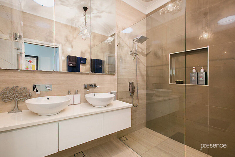 • Stunning fully tiled bathroom with frameless glass rain shower