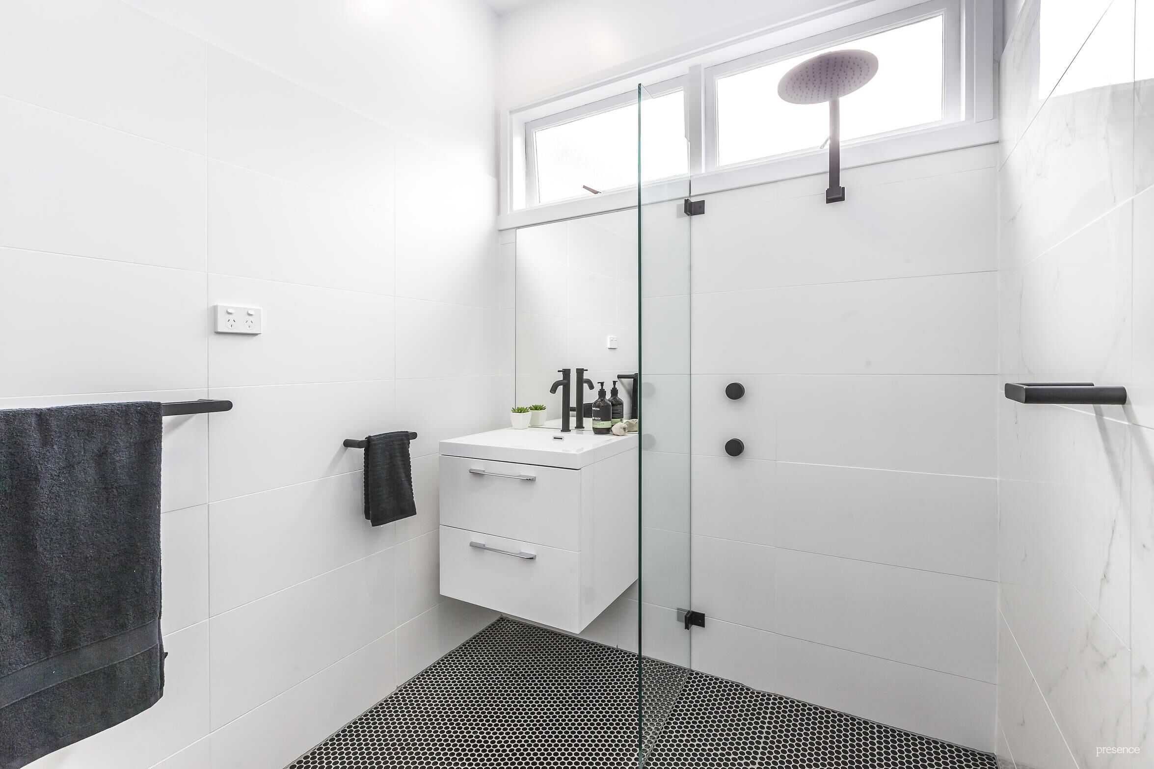 – Contemporary bathroom with frameless shower, wall-hung vanity & black tapware