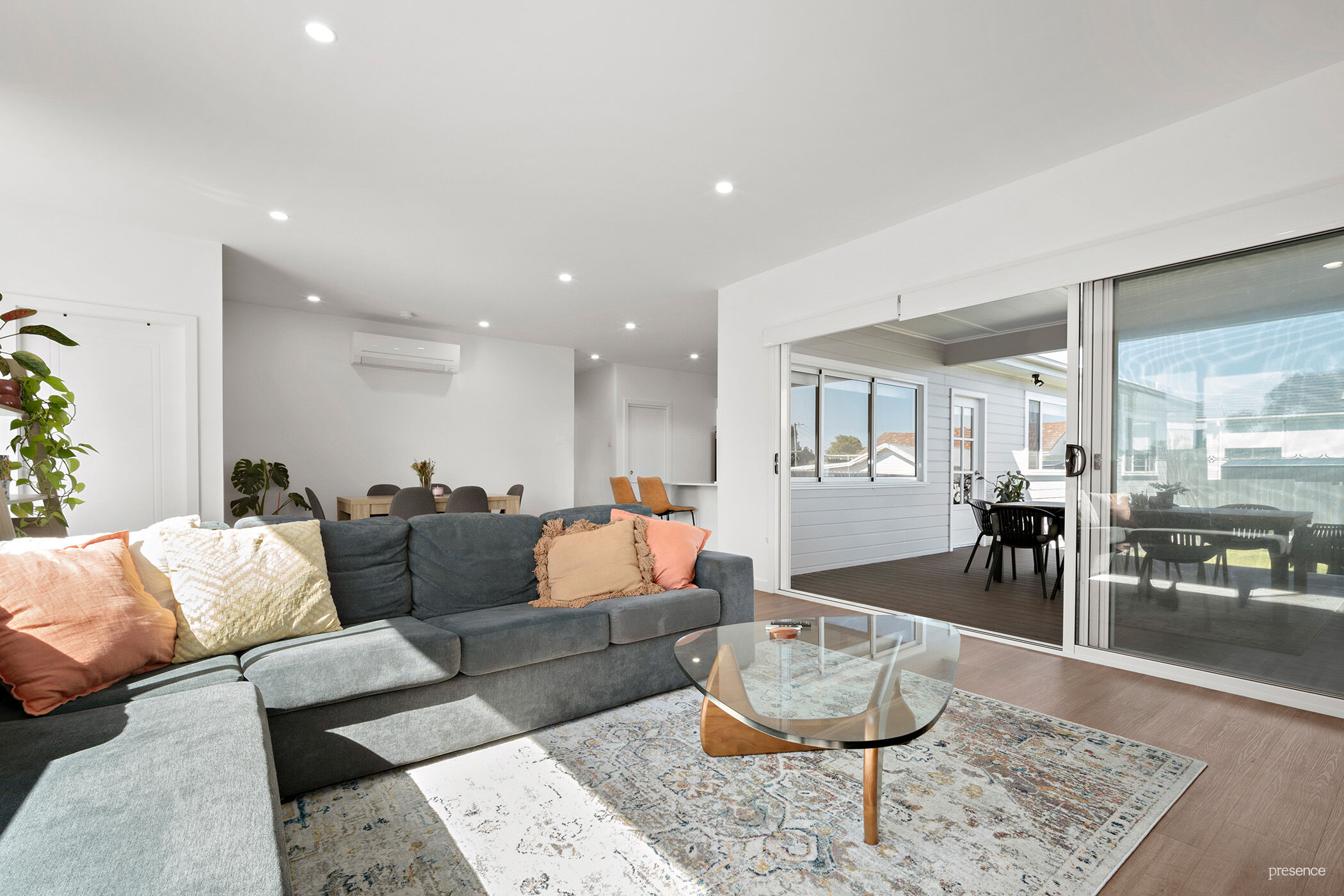 The heart of the home, the open plan living and dining area seamlessly extends outdoors to an inviting alfresco area, perfect for entertaining.