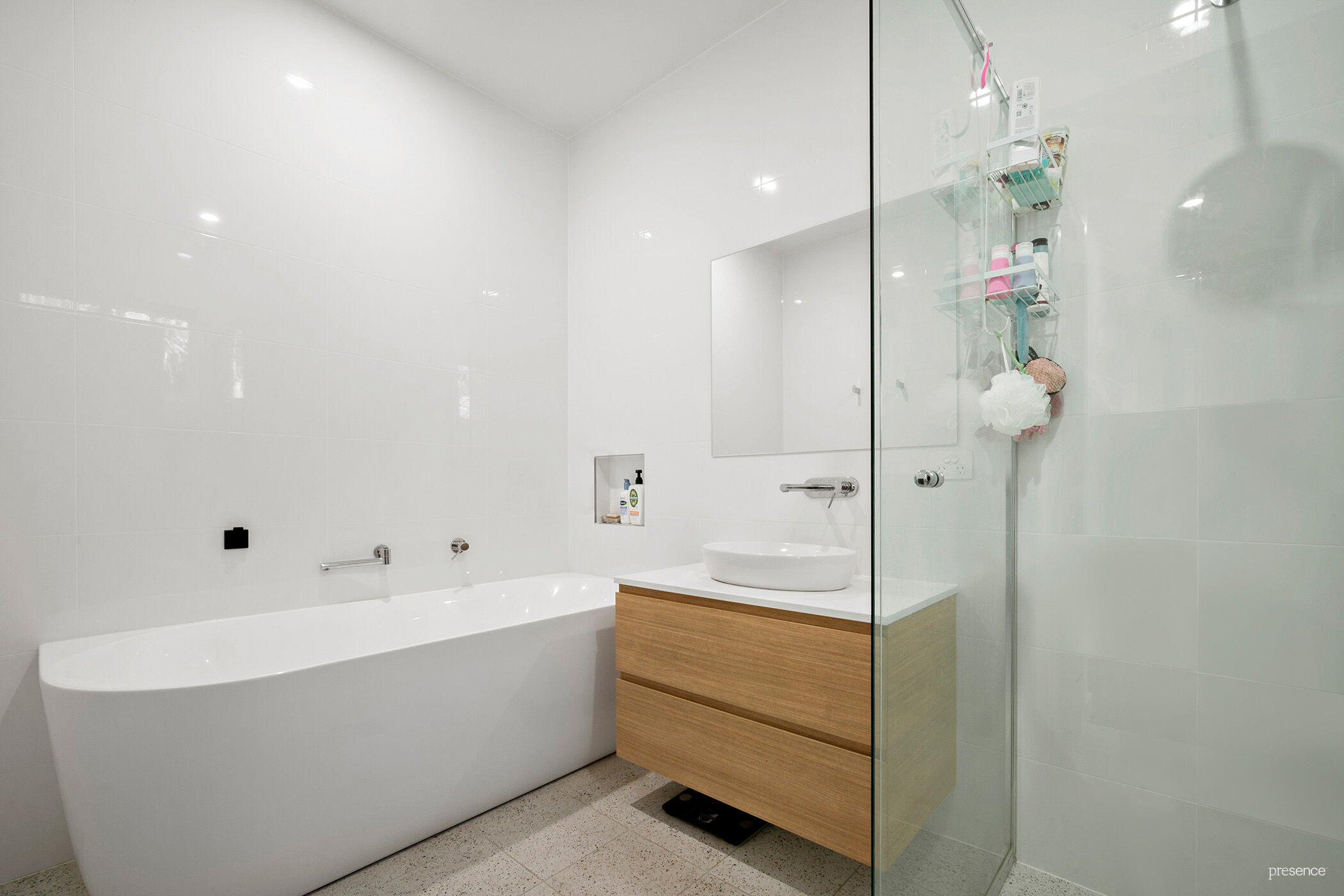 – Stylish main bathroom with large tub and sleek timber vanity
