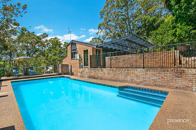 Timber floorboards lead the way around the tiered living spaces that flaunt a modernist architectural design with vaulted ceilings, clerestory windows and great cross-ventilation. The kitchen and dining area is set at the back of the home. Complete with stone benches and induction cooktop it steps out to the saltwater pool, paved alfresco and terraced gardens that are enveloped by a pleasant covering of trees and will invite beautiful sunshine and bird song into your days. Three bedrooms are secluded away from the living areas for maximum privacy and serviced by a three-way family bathroom and master ensuite. A fourth bedroom on the lower level with ensuite is sure to catch the eye of teenagers as well as offering superb versatility as guest or self-contained accommodation. A separate studio/office, freestanding garage and 5kw solar electricity panels completes the package.