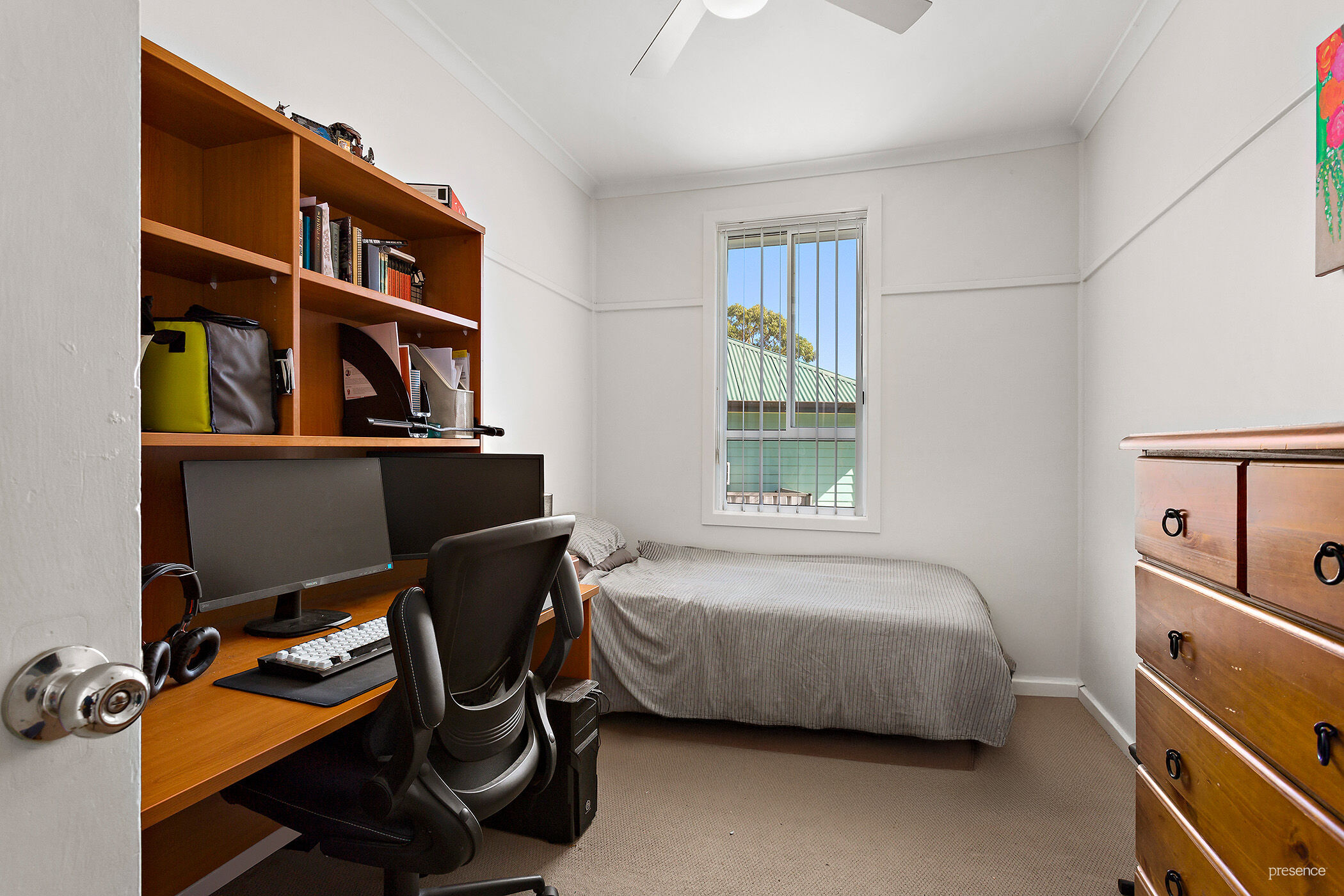 The home offers three carpeted bedrooms, each with ceiling fans for a restful night’s sleep. They share a bright central bathroom with a full-sized bath and shower, whilst a separate laundry at the rear.
