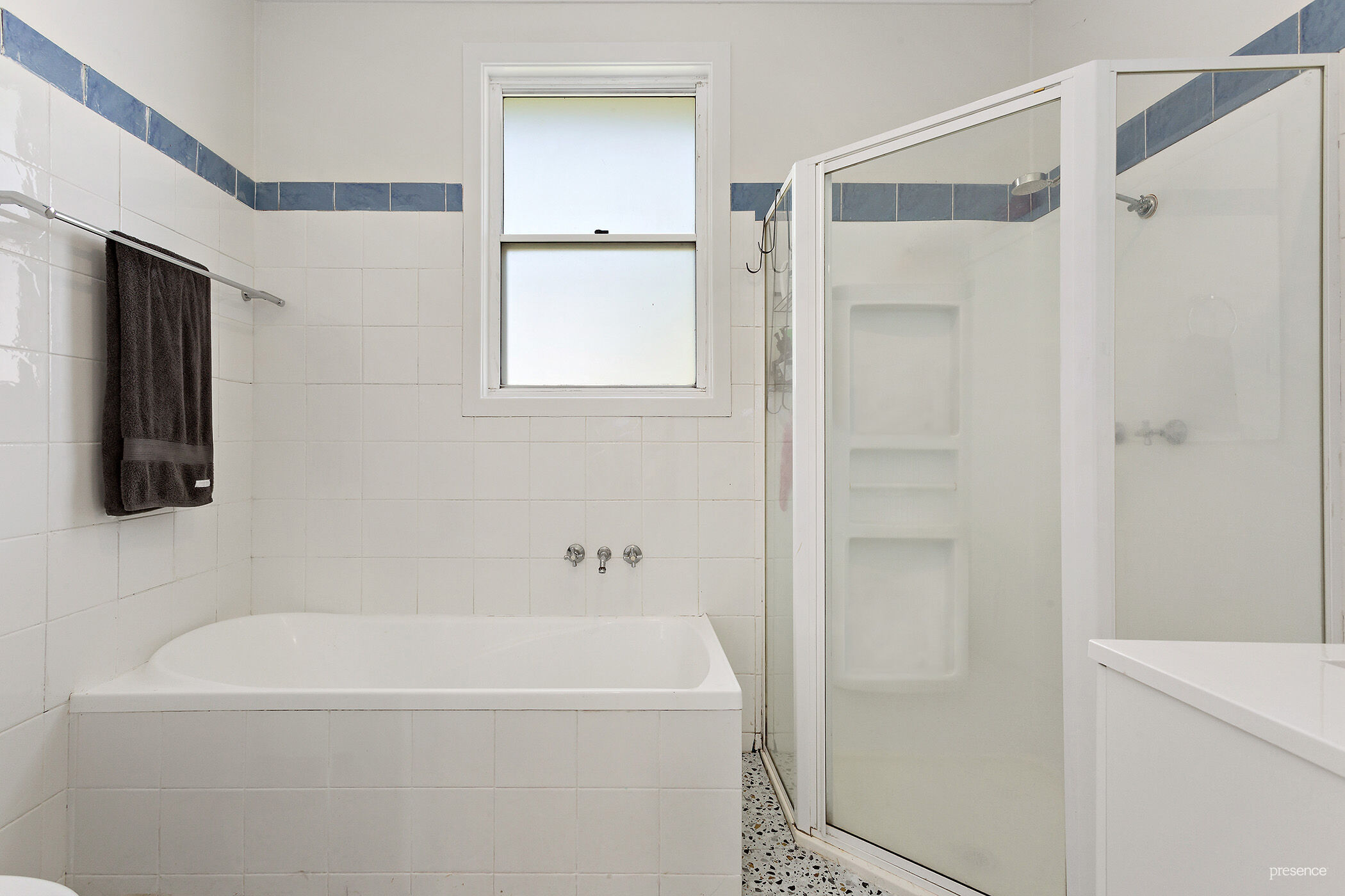 – Bright, modern bathroom with a full-sized bath and shower.