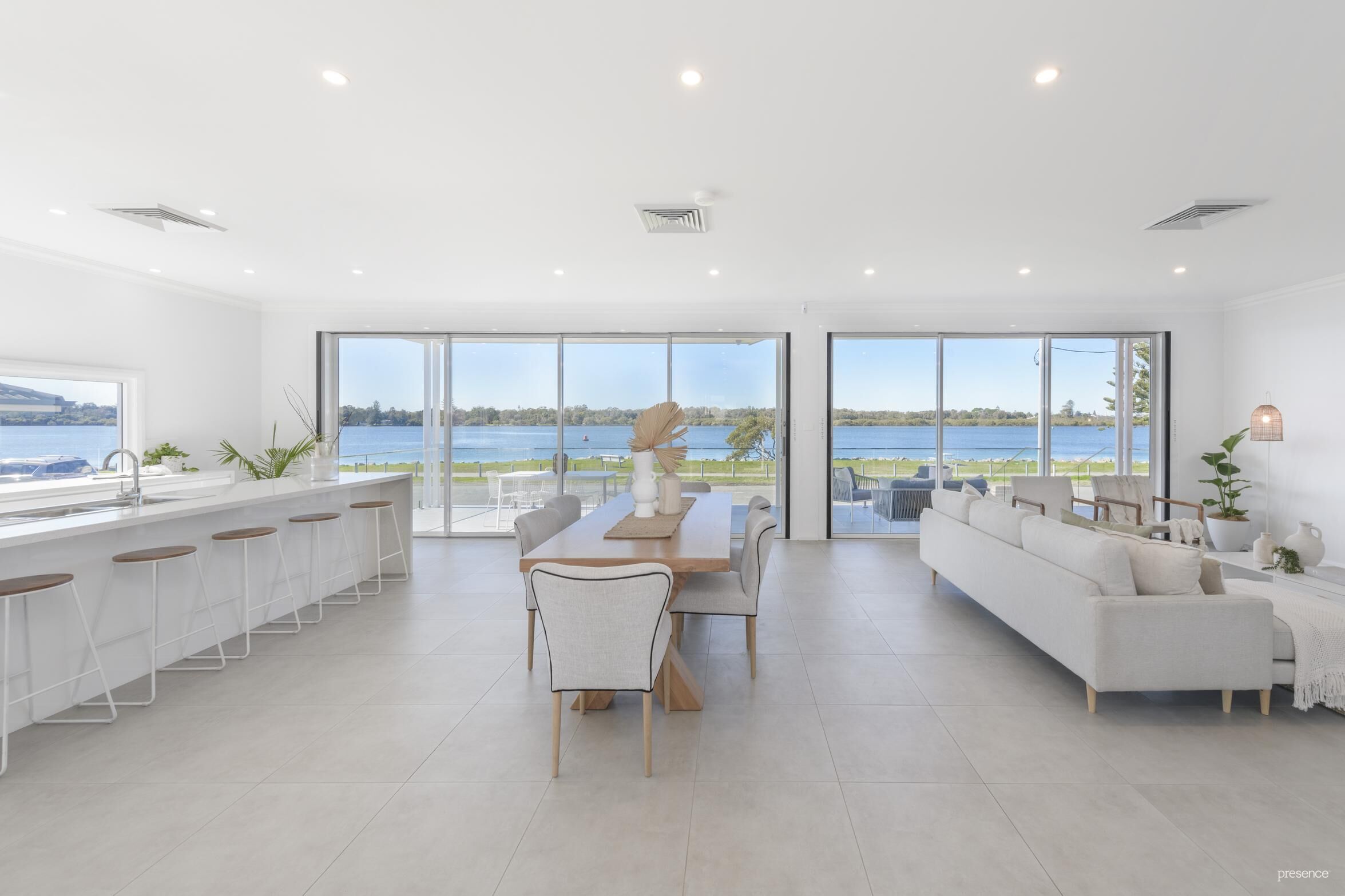 An oversized tiled verandah framed with a contemporary glass balustrade runs the length of this grand home optimising the absolute waterfront position of this truly one in a million property. Drink in the views from this deck, from the master bedroom balcony, from the third private balcony or from almost every room in the house. The grand open plan kitchen/living/dining also captures these striking views – not across the water to other homes or units – but to the serene vista of this coastal secret spot where you will only see the seabirds rising from the water and the push and pull of the tide.