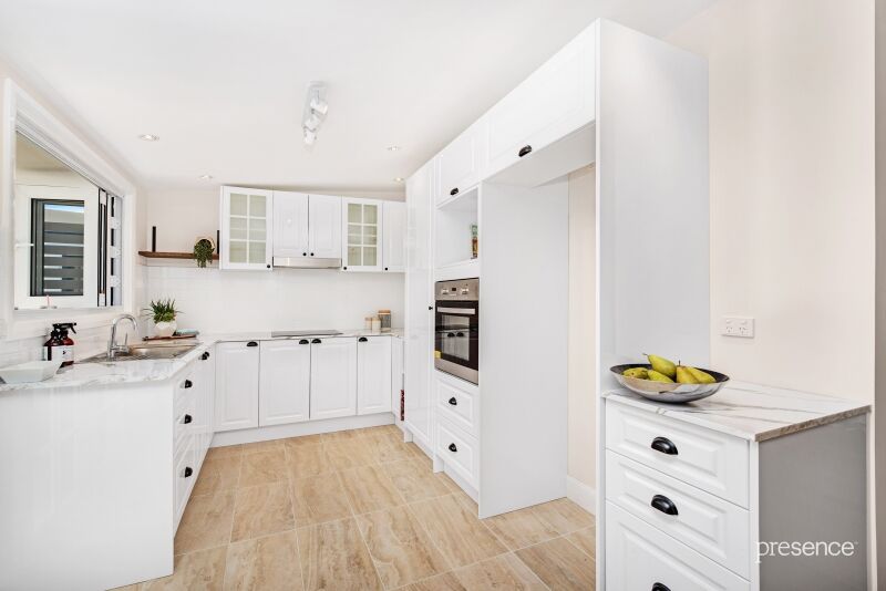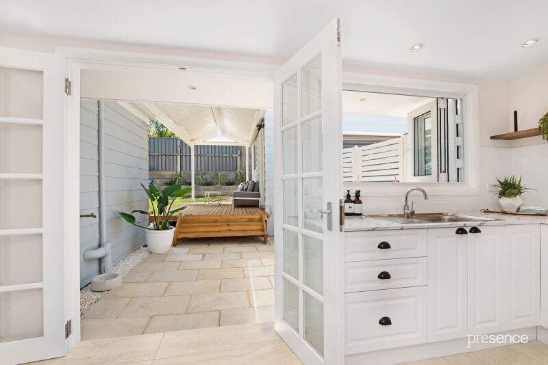 The home boasts a generous open plan living space with high ceilings and wide timber floors which spills through French doors to the paved alfresco, the covered deck and onto the private, landscaped garden. The stylish new kitchen has bi-fold windows opening to the outdoors, while the stunning bathroom features a vast glass rain shower and cast iron, claw foot tub. There are three spacious double bedrooms with ceiling fans, two of which also benefit from built-in storage.