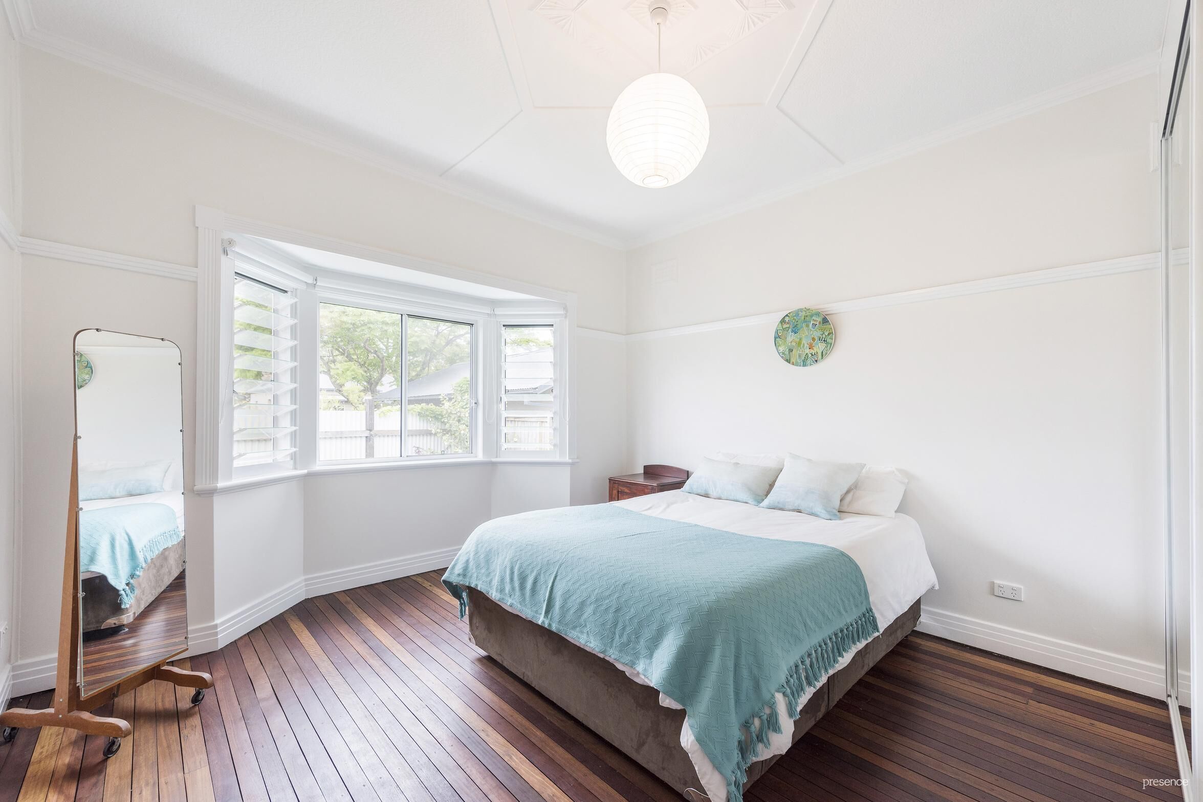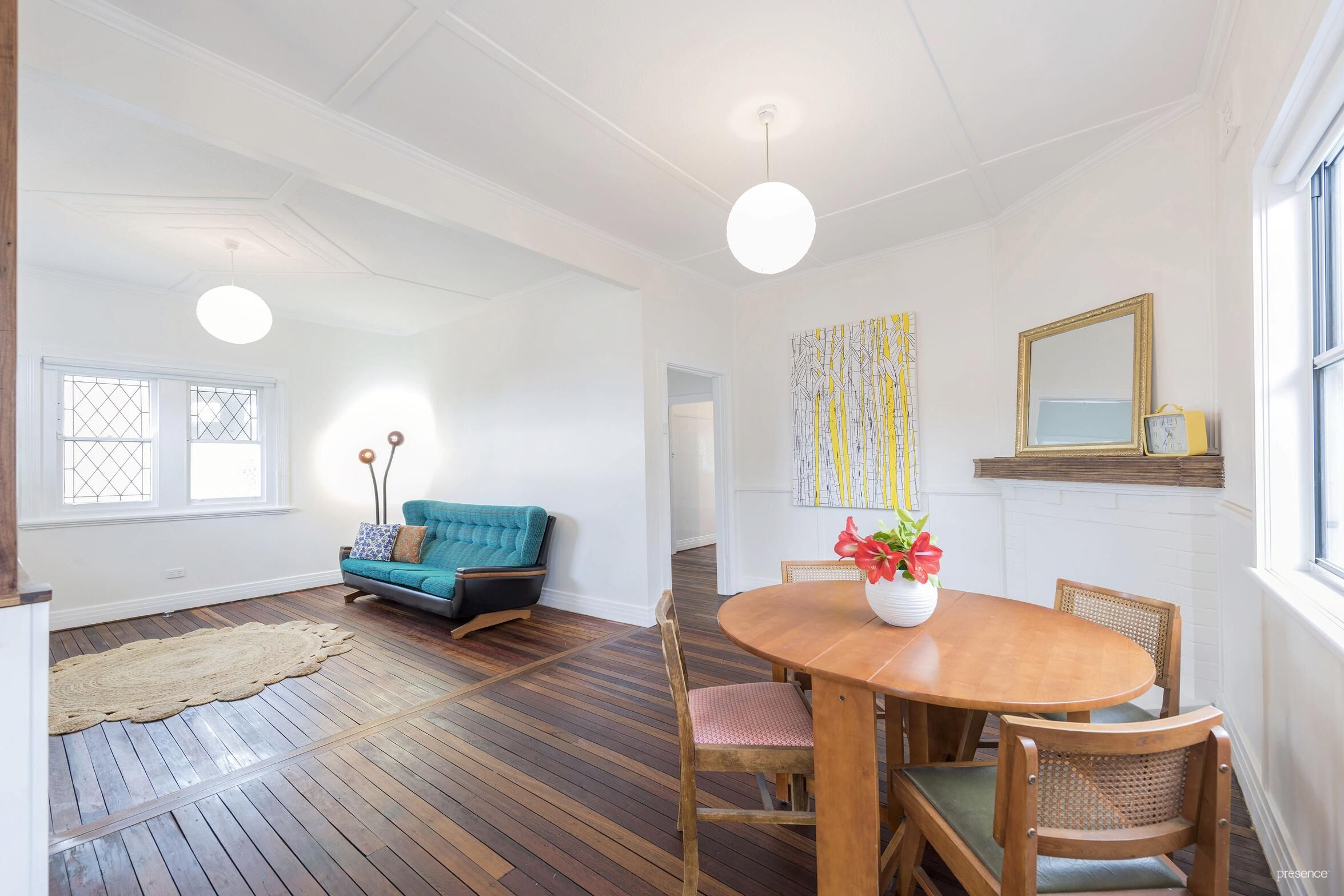 A canvas of timber floors, crisp neutral décor and timber accents highlight the home’s charming character elements of leadlight windows, picture rails and ornate ceilings. The floorplan has been opened up for modern living with free-flowing lounge and dining spaces adjoining a gas-equipped kitchen. Both of the bedrooms include mirrored built-ins, the master featuring a classic bay window with louvres providing beautiful cross ventilation. They are serviced by a spotless bathroom with shower over bath and separate w/c.