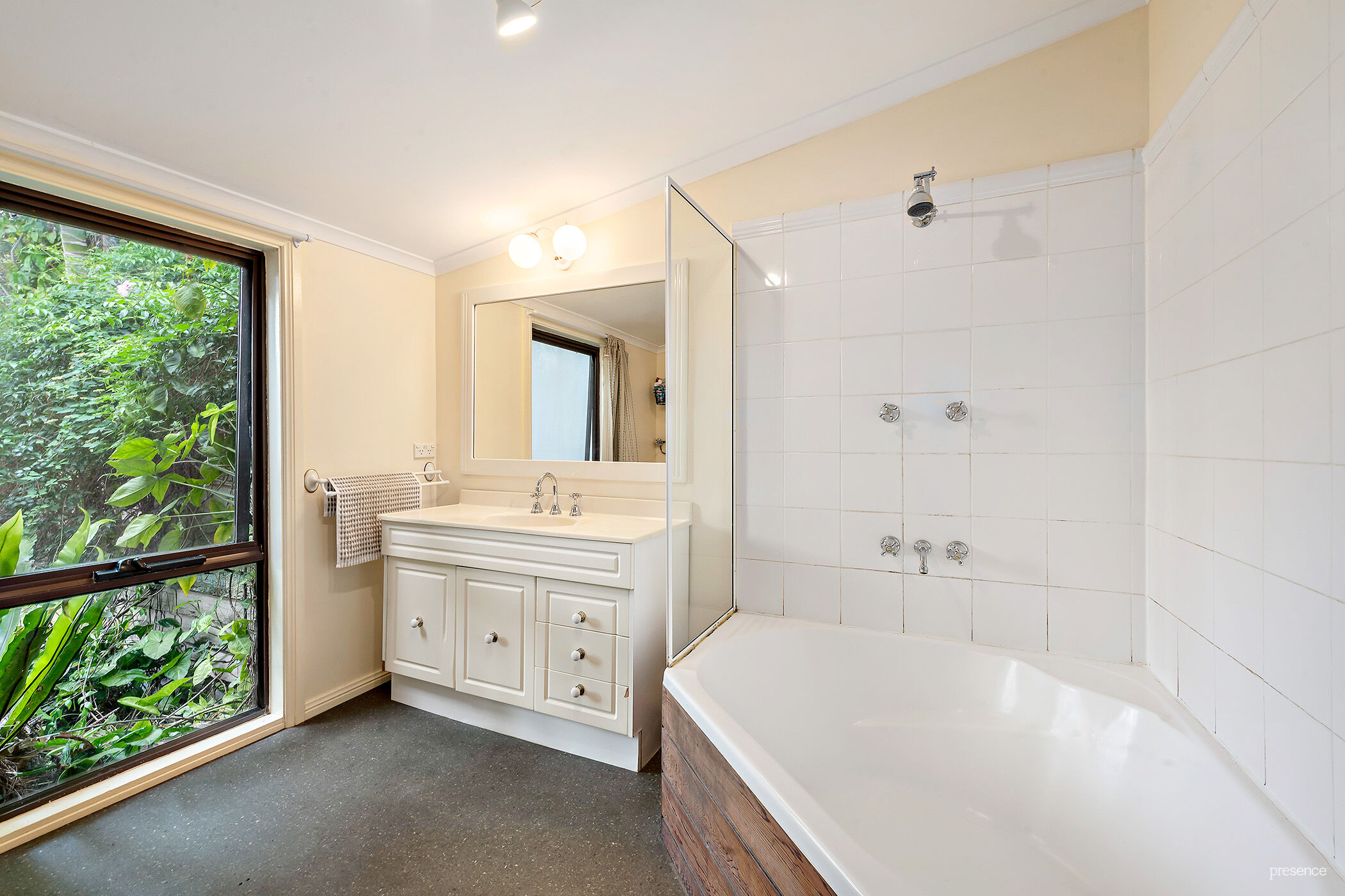 Two bedrooms, the main with a wall of built-ins, and a study sit to one side of the house adjoining a large open plan living area. The modern kitchen sits at the rear of the living area and features vaulted ceilings and glass louvres facing the backyard to further enhance the feeling of spacious living. Sliding doors from the kitchen and study open out onto a deck perfect for alfresco dining or relaxing. The backyard is a picture of tranquillity with established trees for privacy and paved pathways winding thorough low maintenance and well-loved gardens.