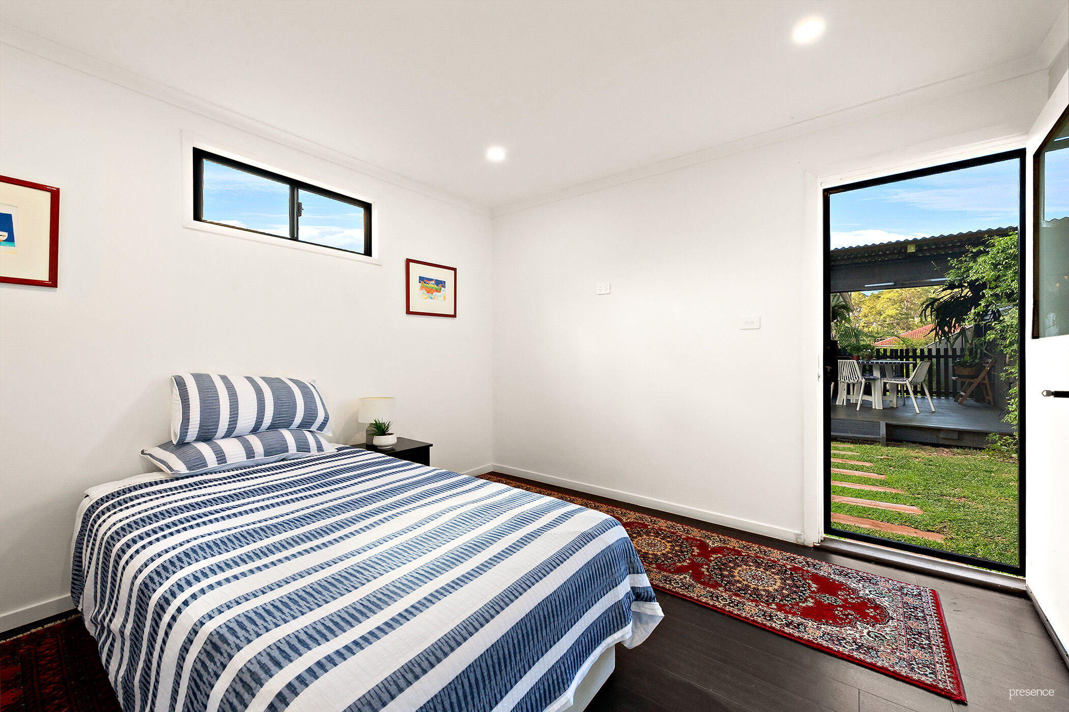 On entry you are greeted by one of two contemporary living areas, each offering a unique blend of comfort and style. The first living area introduces you to a streamlined new kitchen, boasting sleek stone benchtops, storage galore, custom cabinetry, and a twin butler’s sink that exudes timeless elegance. The second living area is generously proportioned, offering ample space for relaxation and entertaining. Complete with air-conditioning and a fan, as well as a warm wood heater for those chilly nights to come, this space is designed for the ultimate in year-round comfort. From here, charming French doors open out onto the expansive alfresco deck, inviting the outdoors in and offering a seamless flow for indoor-outdoor living. Imagine hosting gatherings or simply unwinding amidst the treetop vistas of the surrounding reserve, enjoying the serenity of nature from your own back deck.