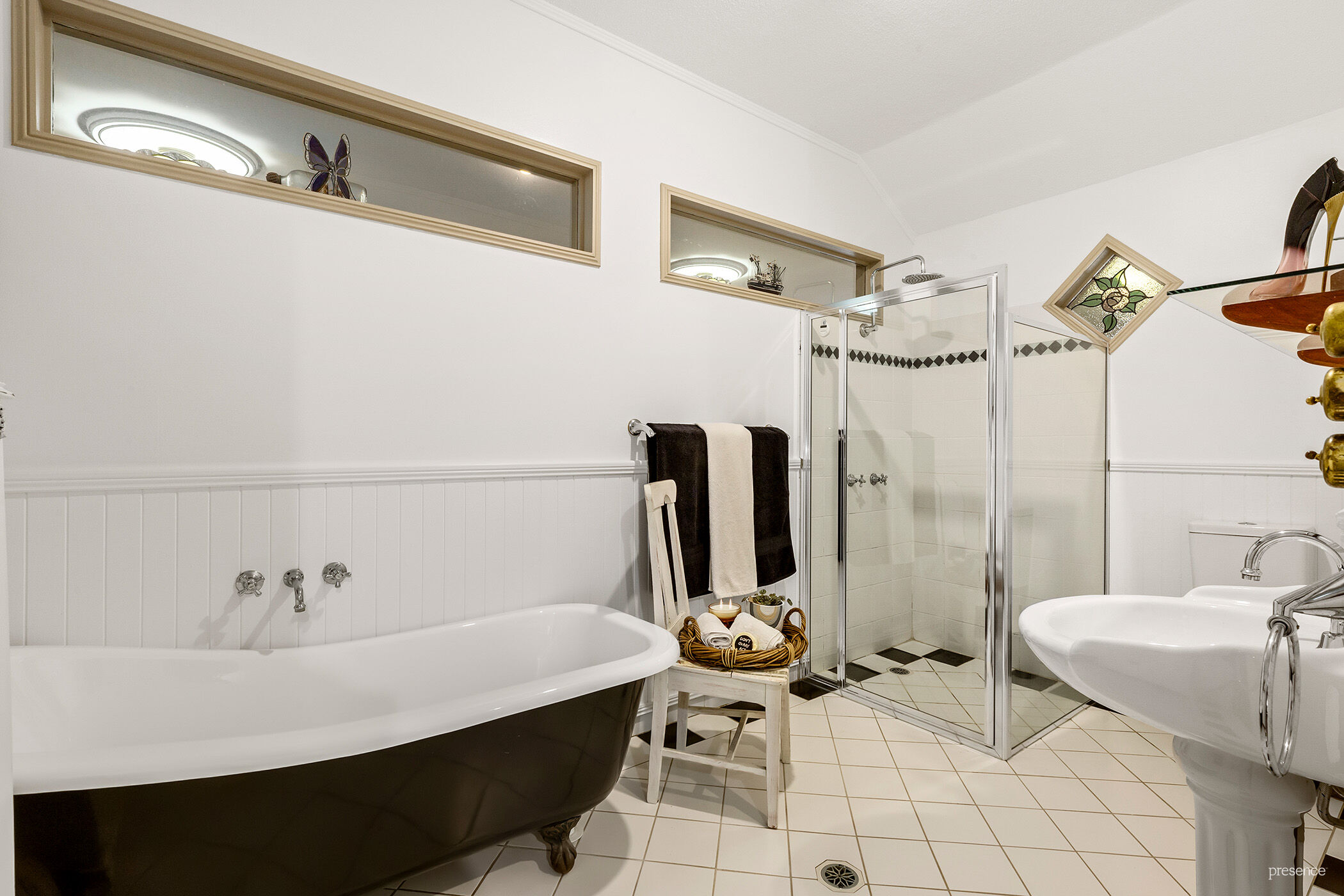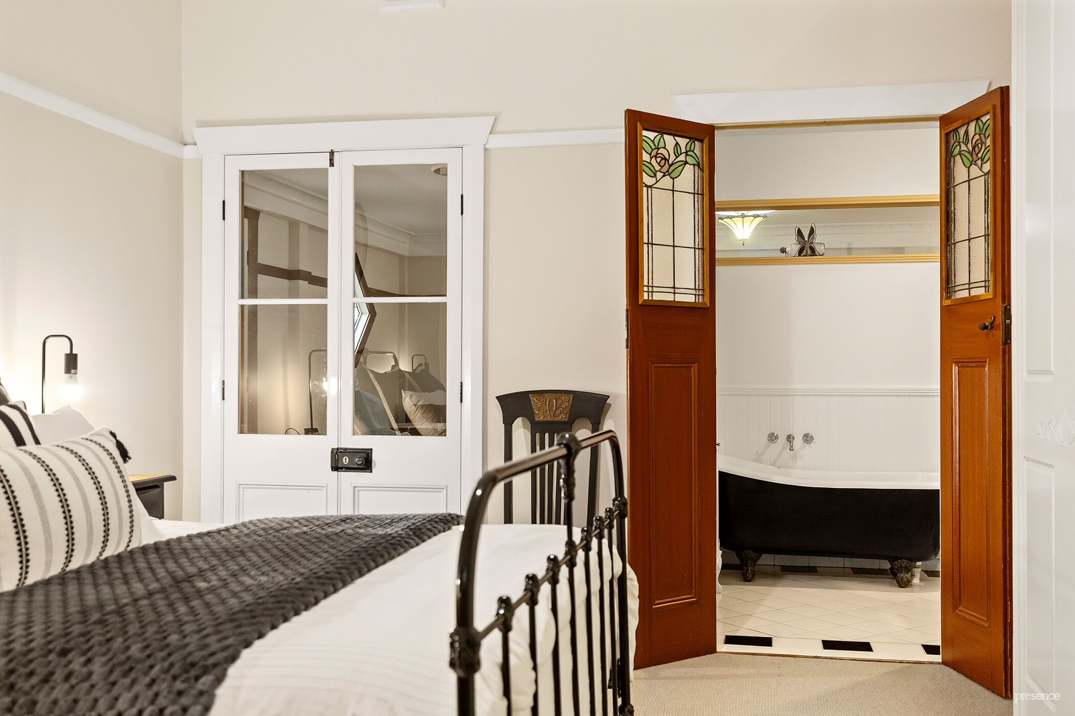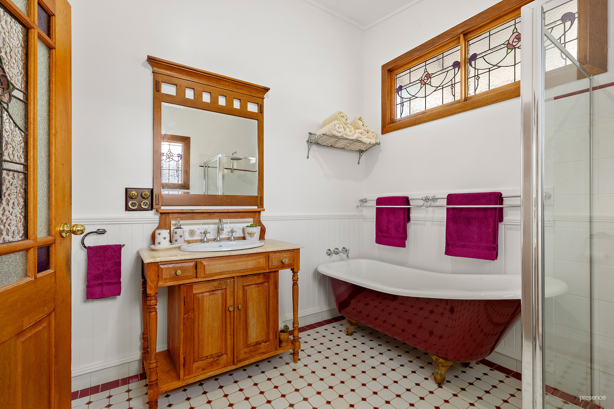 – Two elegant bathrooms, each featuring a clawfoot tub, separate shower, stylish timber vanities, and heritage tiling.