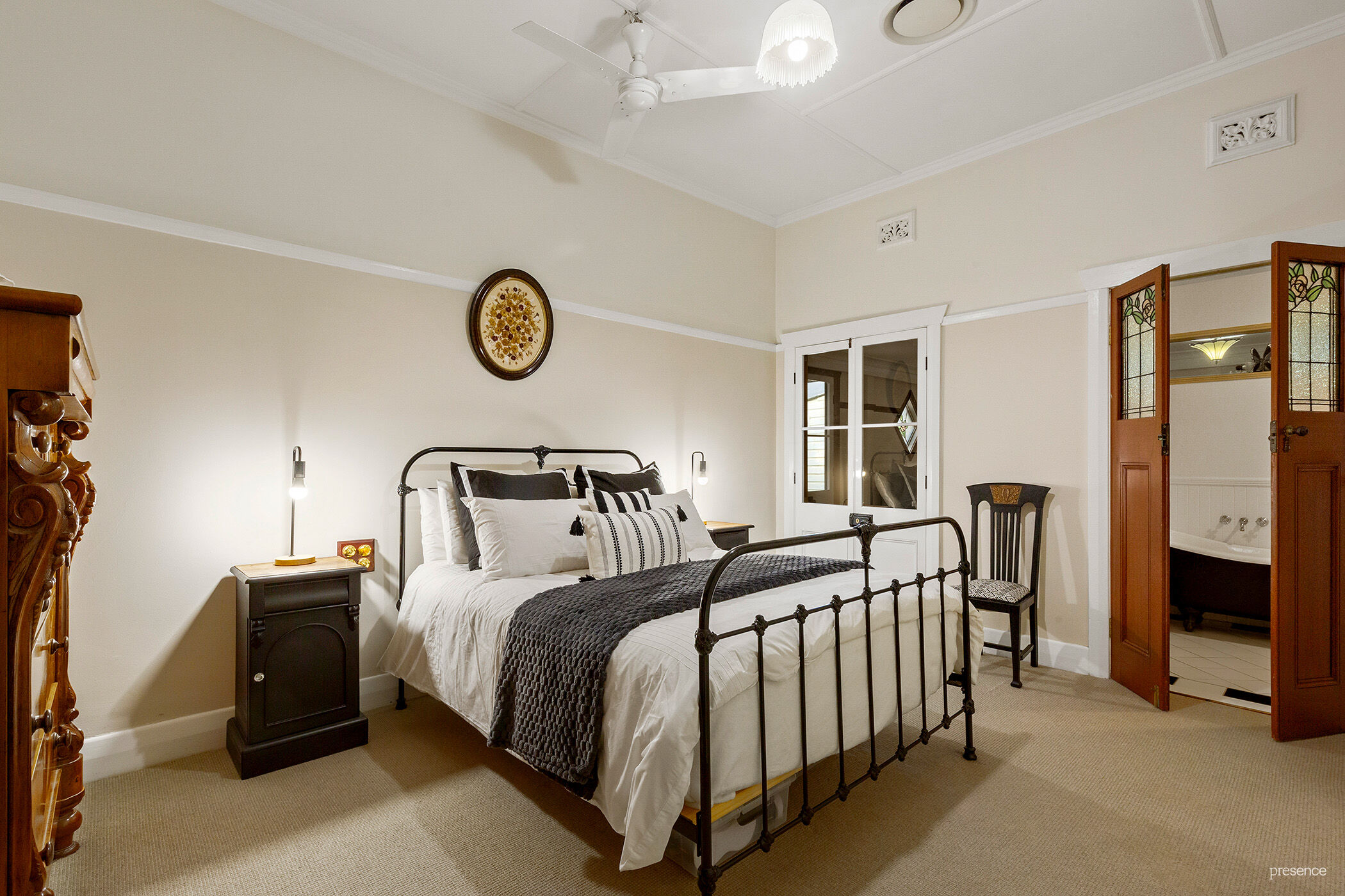 Step through the ornate leadlight front door and be instantly awed by the rich character details, including soaring 3.2m ceilings adorned with intricate plasterwork and ceiling roses, tall sash windows, and polished timber floors providing a warm and elegant welcome. Graceful timber fretwork frames the wide central hallway, which flows to four generously sized bedrooms, three with ample built-in storage and the fourth offering flexible use as a bedroom or inviting second living space, complete with a striking original fireplace. The master bedroom boasts its own ensuite and opens via French doors to a stunning enclosed verandah – a versatile space currently serving as a serene retreat with a cozy sitting area and study space. Both bathrooms are beautifully appointed in keeping with the home’s vintage elegance, featuring classic clawfoot baths, character vanities and timeless tiling.