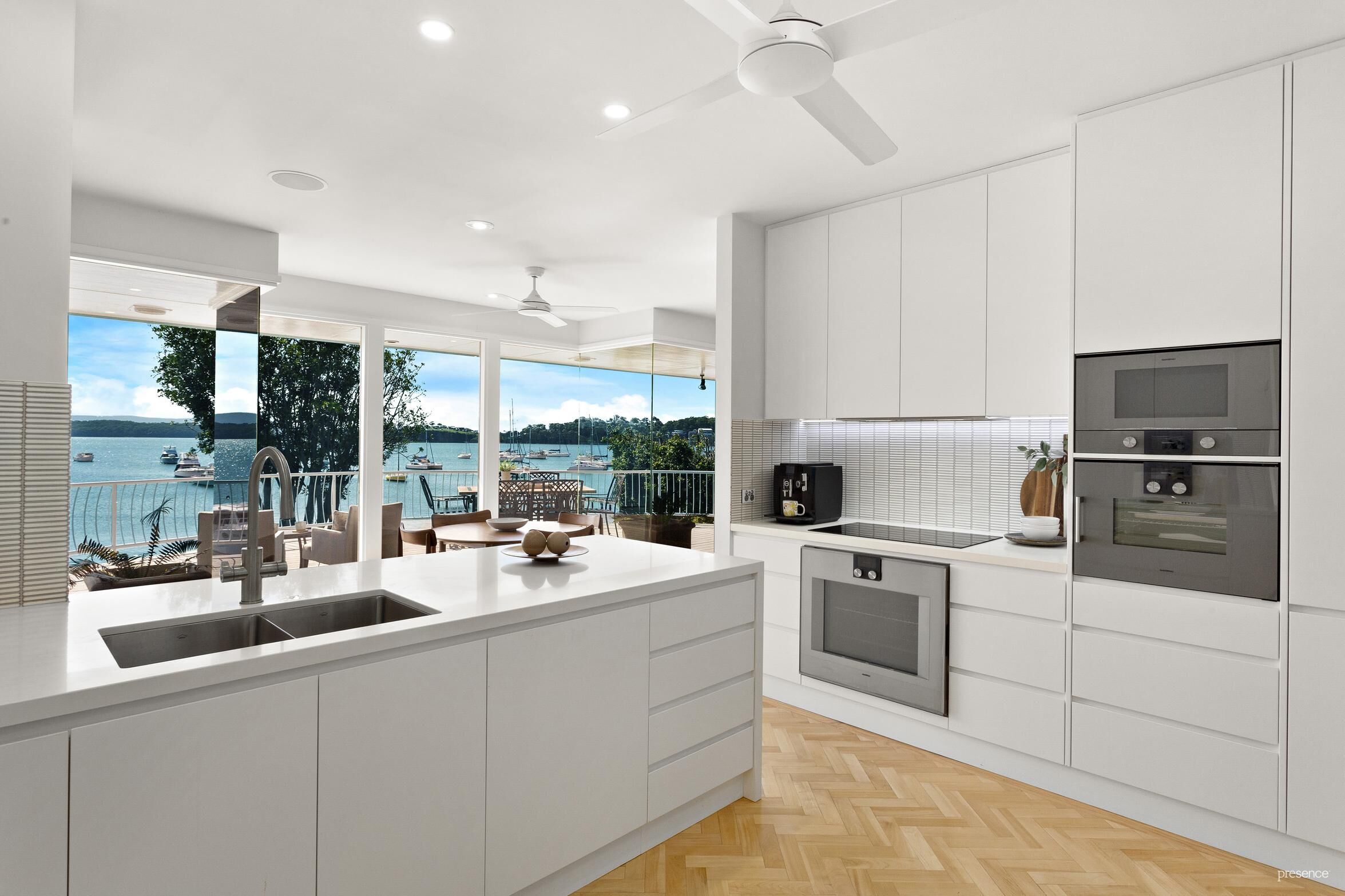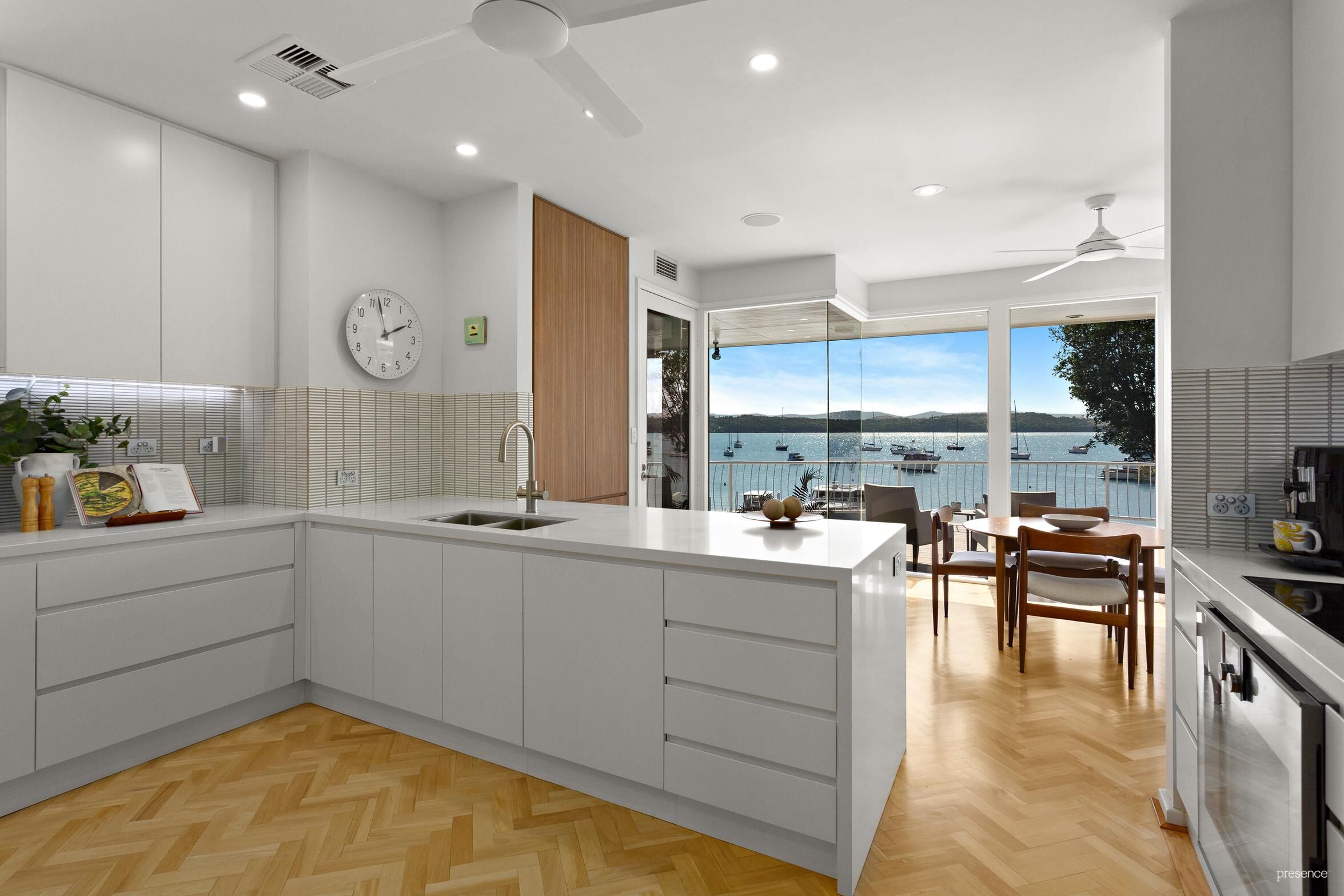 The home unfolds over three levels, with the top floor dedicated to a private master suite where morning views are enjoyed from bed—shutters open, yacht in sight. The main level boasts an open plan living space bathed in natural light, with easy access to the front gardens or the circular deck offering stunning lake views. The updated kitchen is a delight to cook in, equipped with top-tier Miele and Gaggenau appliances, and backdropped by those views. Also on this level are a cosy lounge room, two bedrooms, and the main bathroom.