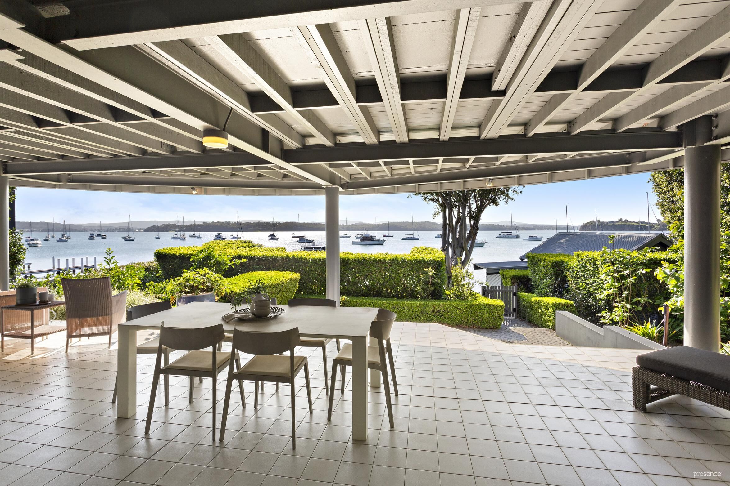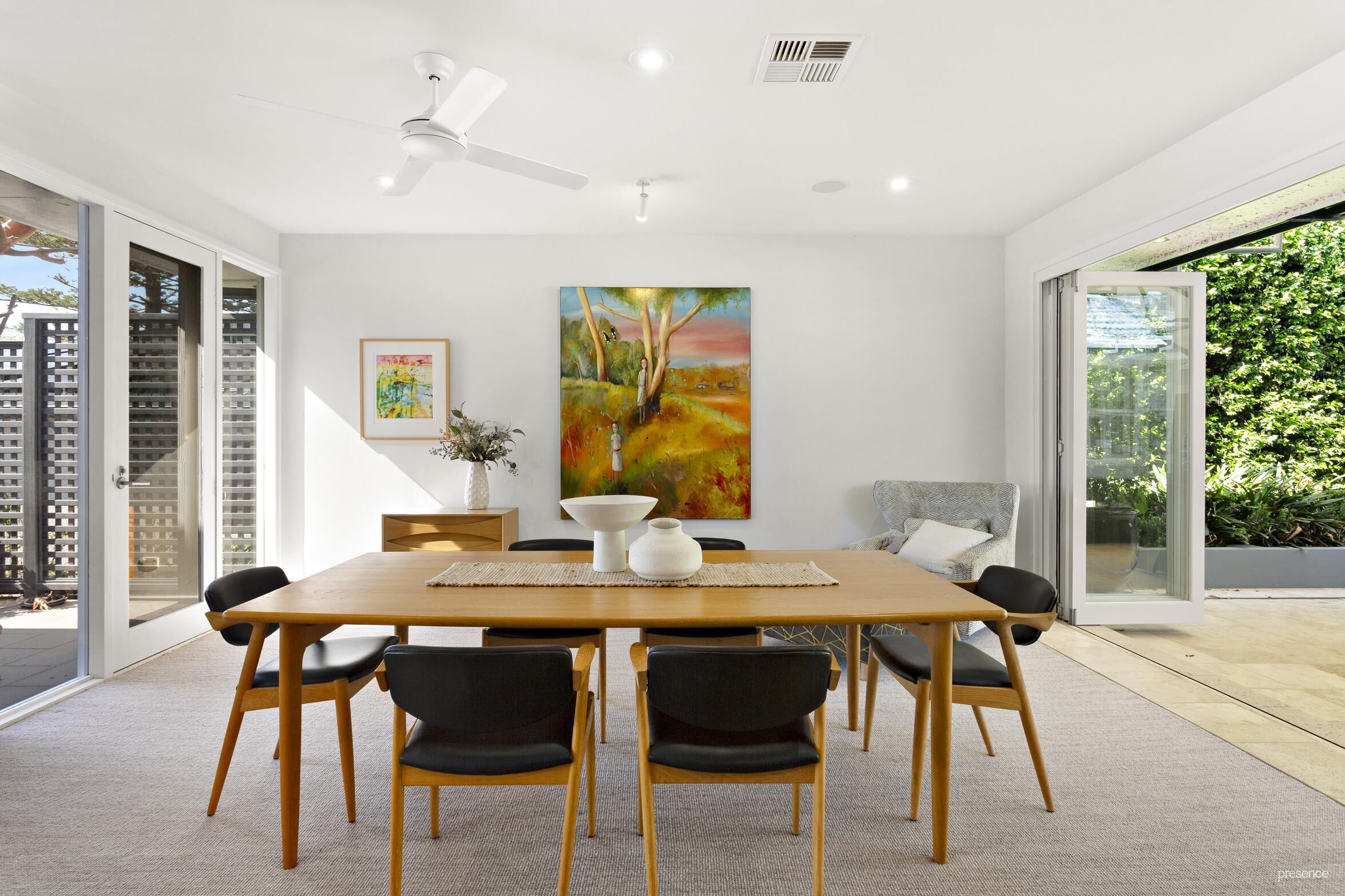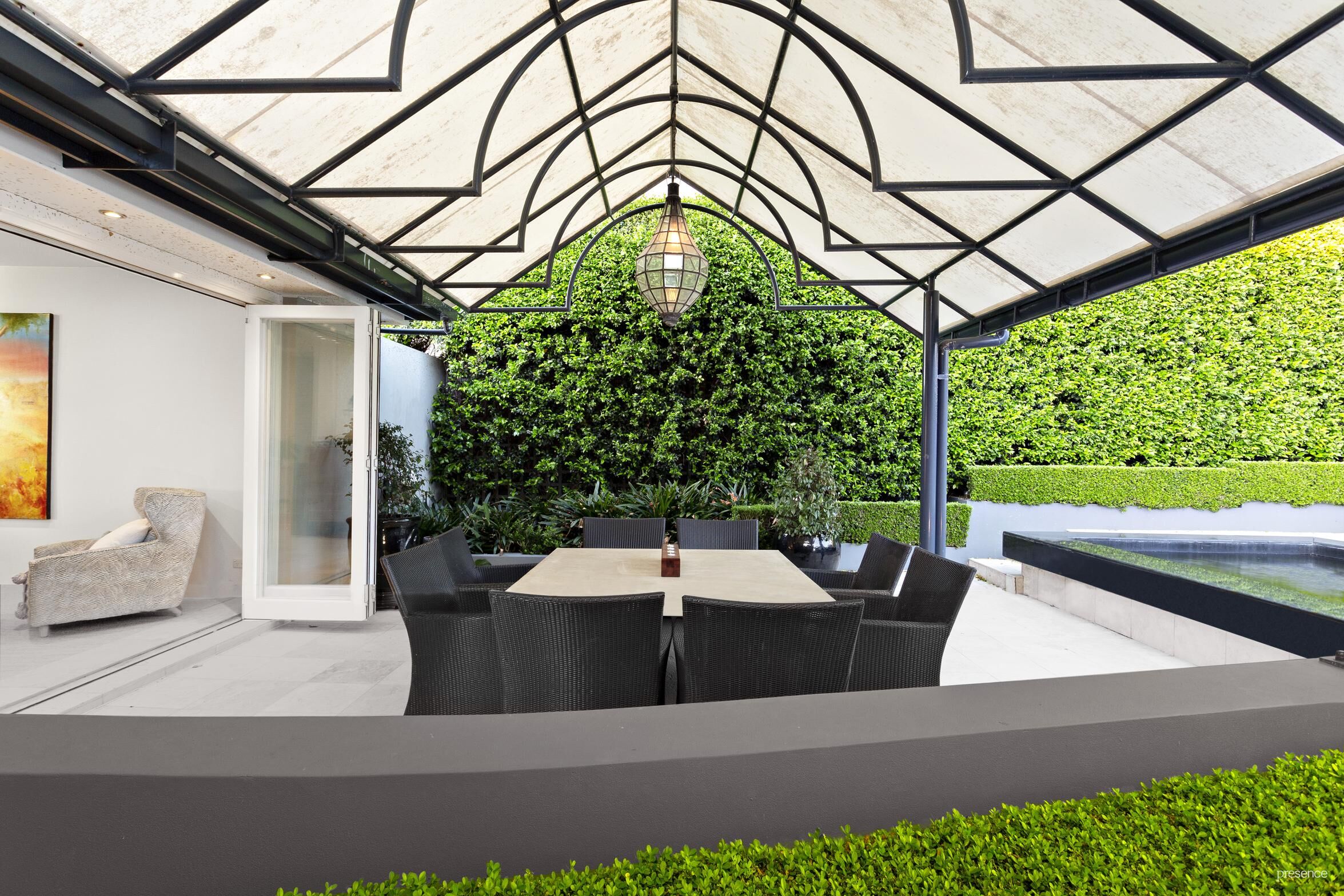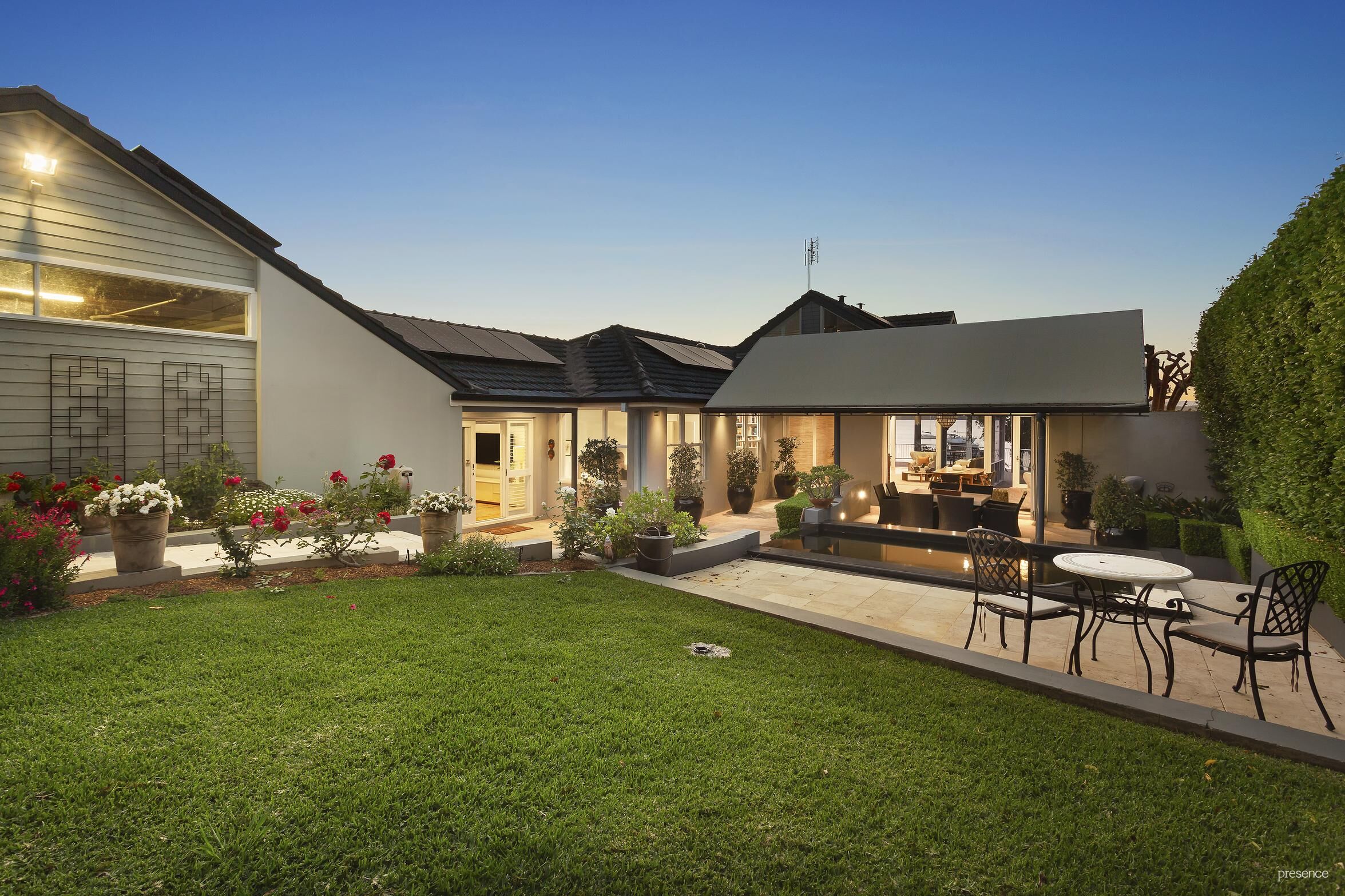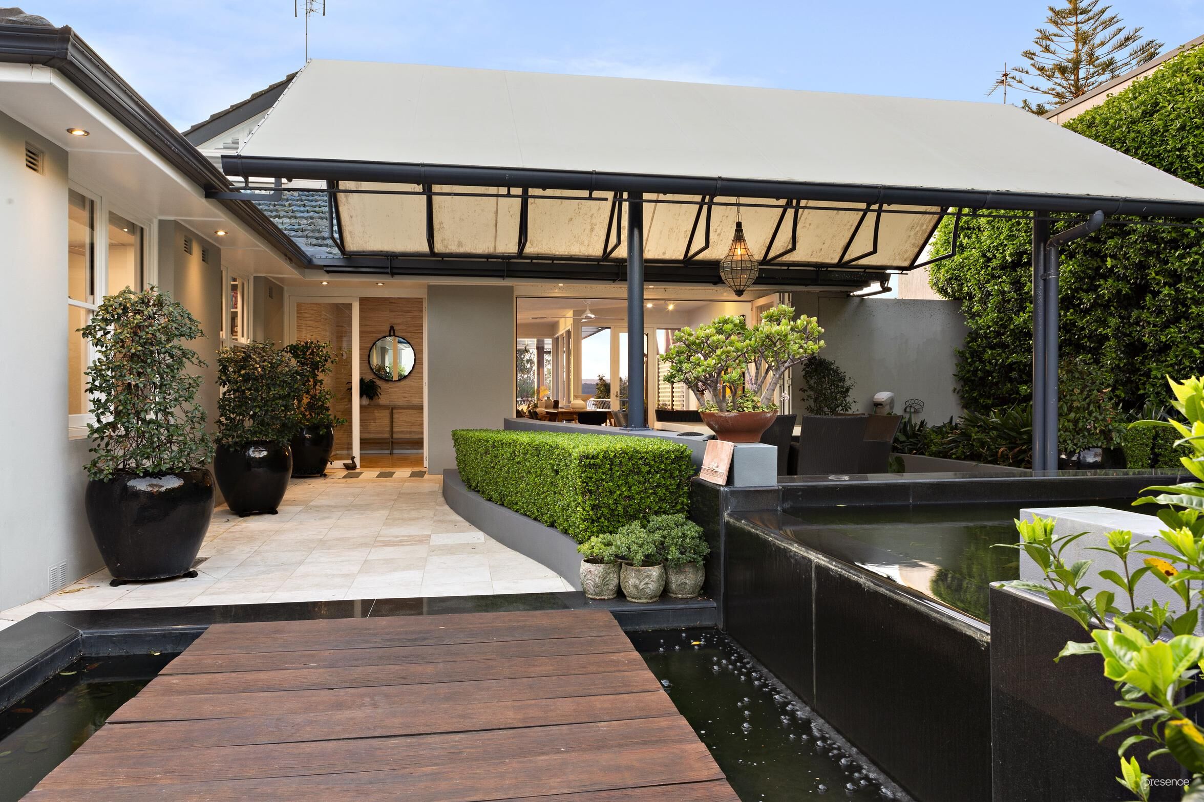 Recently architecturally renovated, this sanctuary is discreetly set back from the street, its entrance marked by lush gardens, tall hedging, travertine pavers, and a serene tranquillity pond. The expansive alfresco area is perfect for everything from intimate soirees to grand parties.