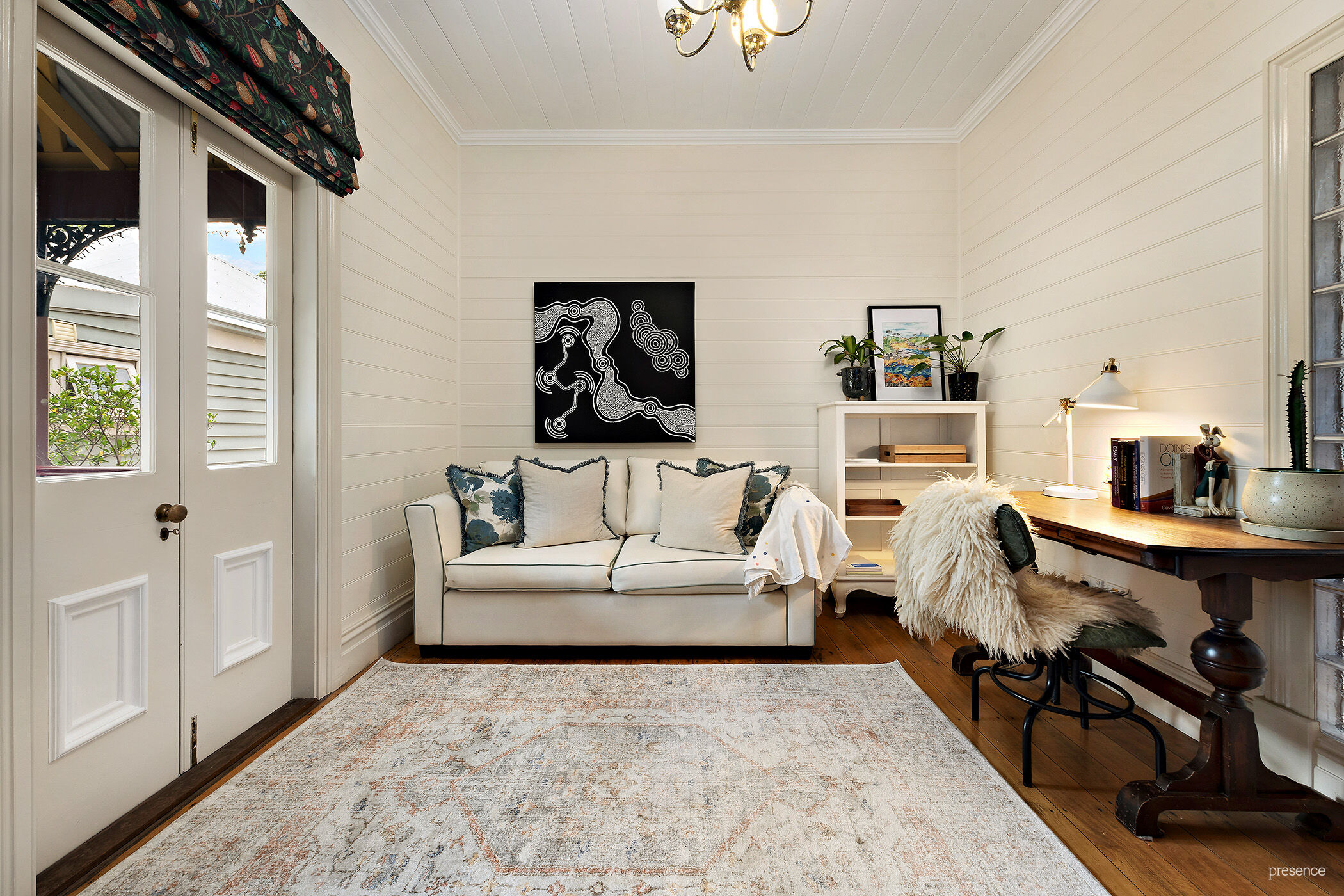 – Cosy formal lounge room with gas fire and French doors opening to study