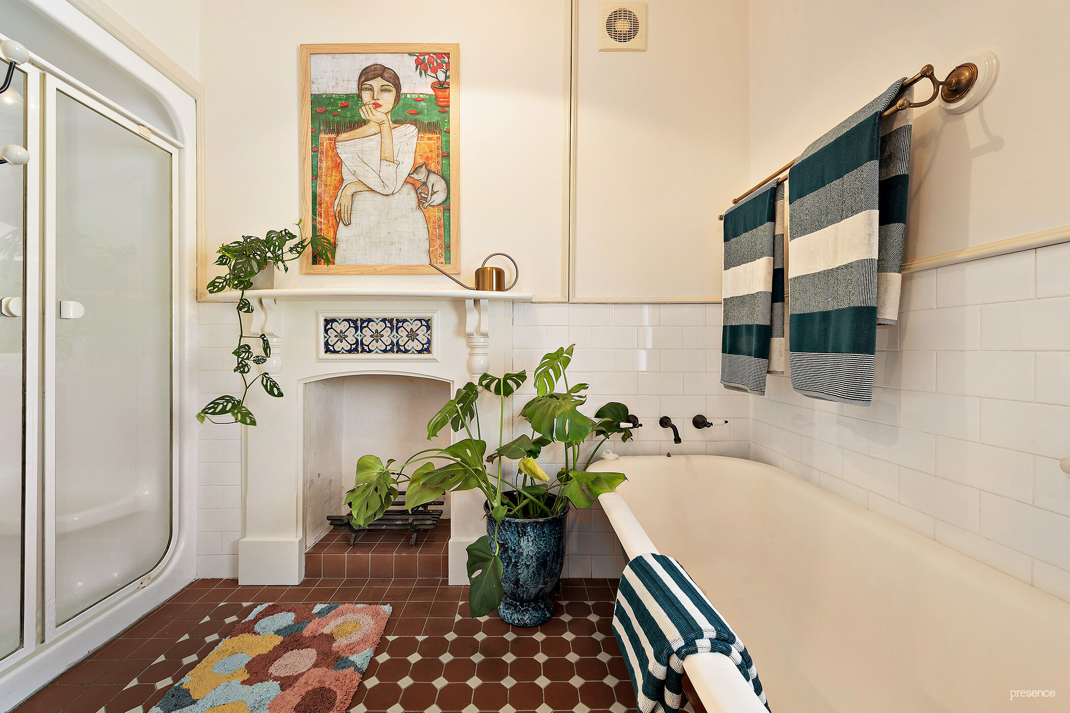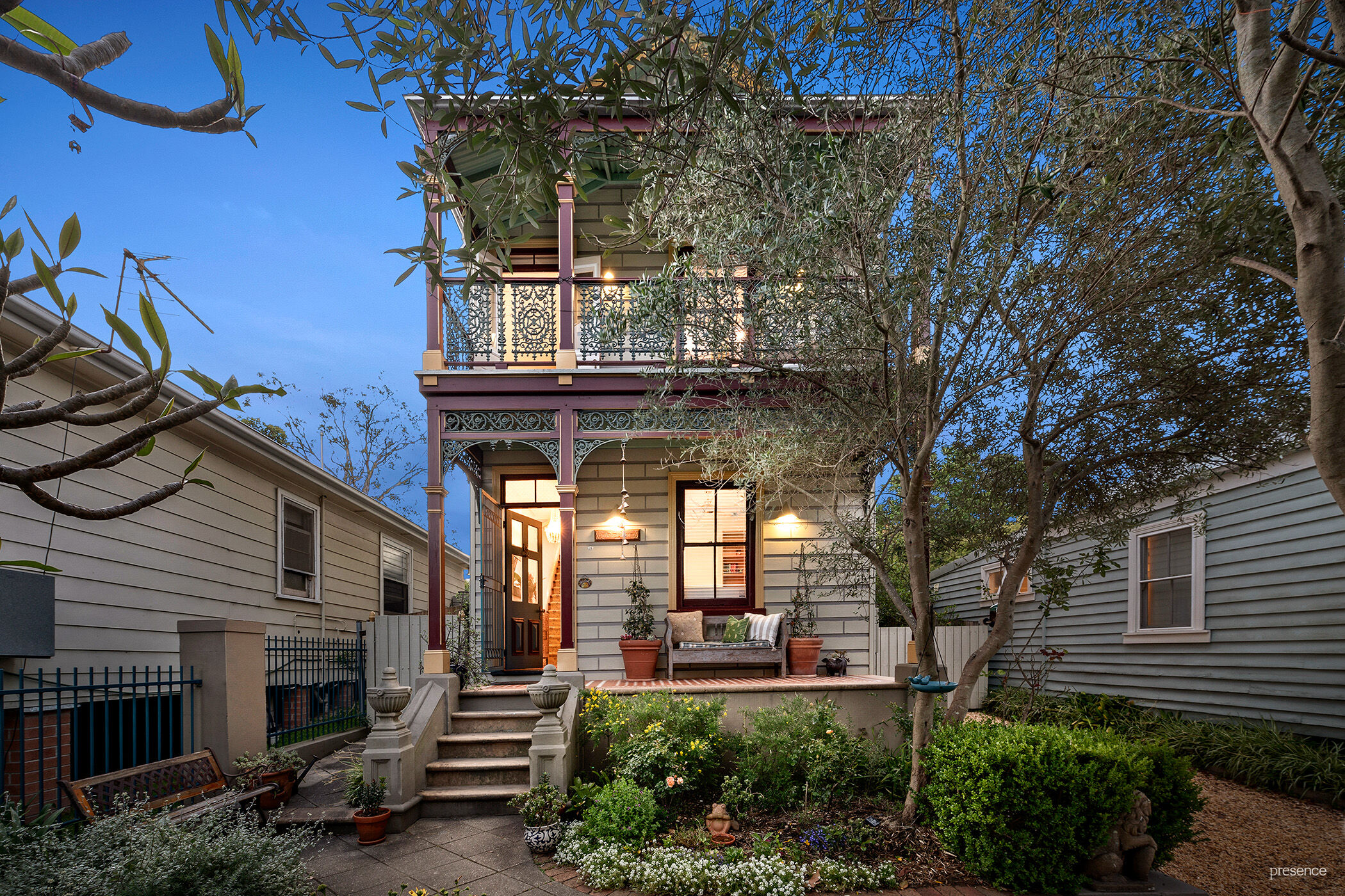 Two flourishing olive trees, a stately heritage-coloured façade, and sandstone steps provide a fitting front yard for this nineteenth century property, while a brick chimney stack and