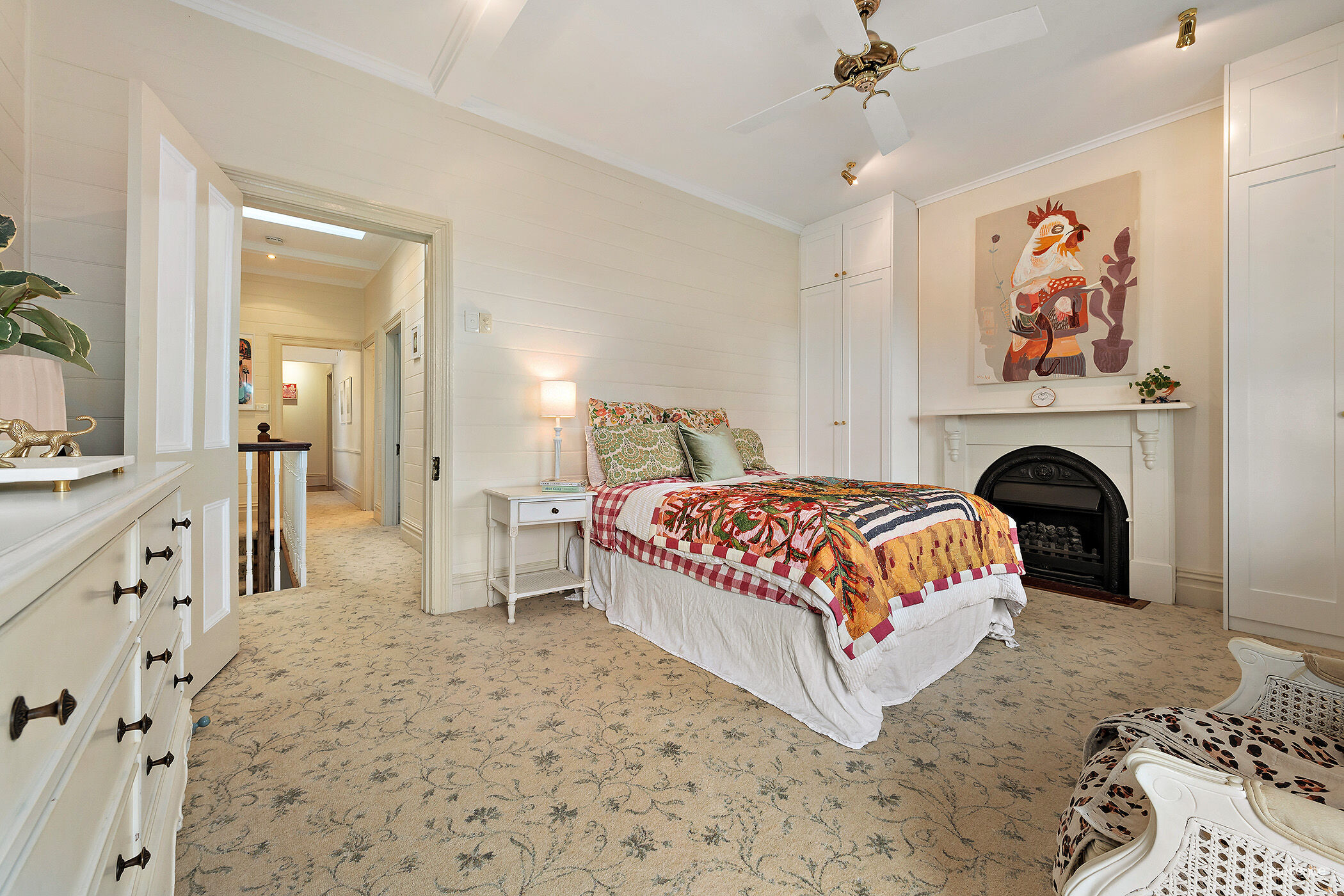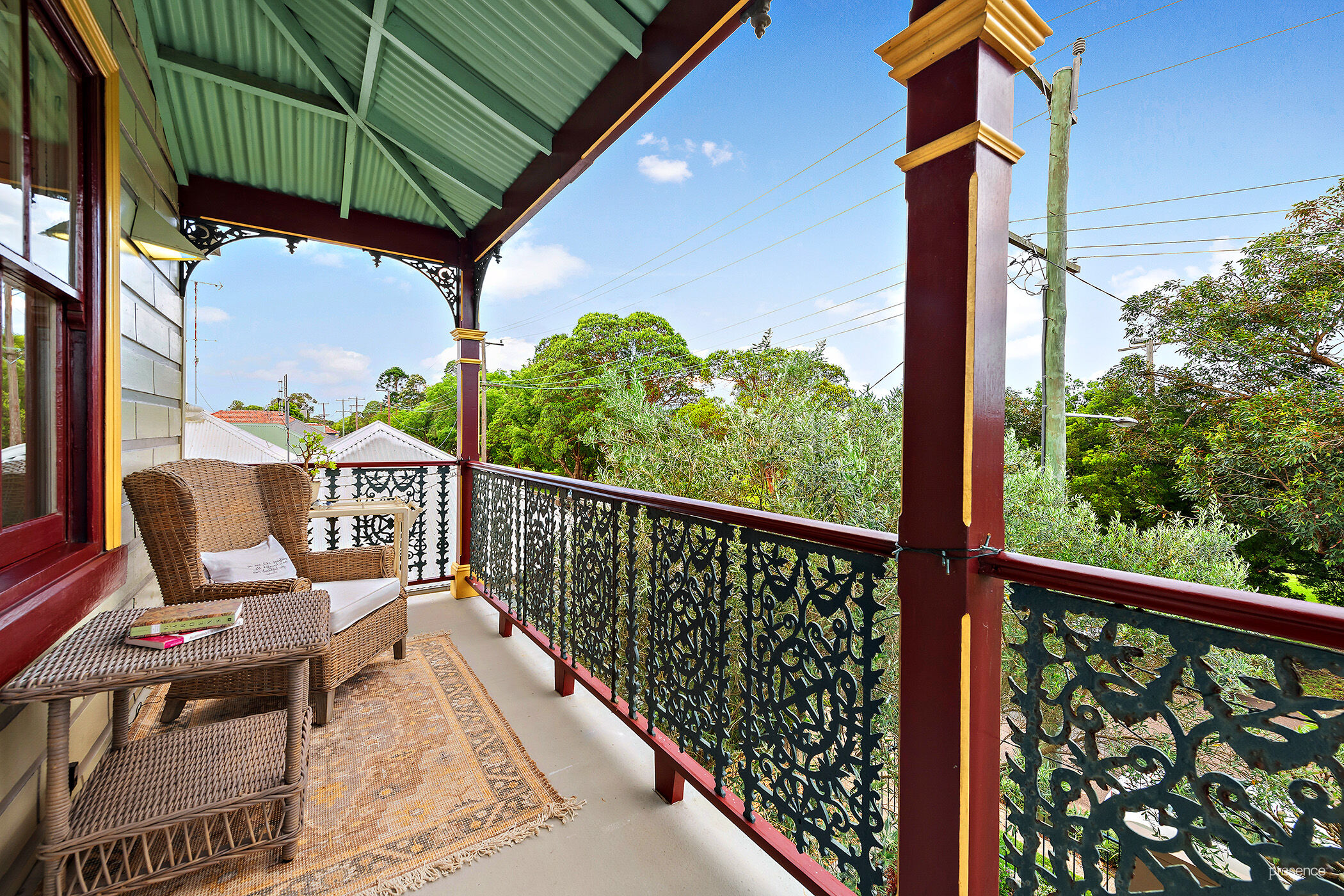 – Three upper-level bedrooms all with built-in robes, one opens to lacework verandah with park outlook, served by three-way bathroom with clawfoot bath