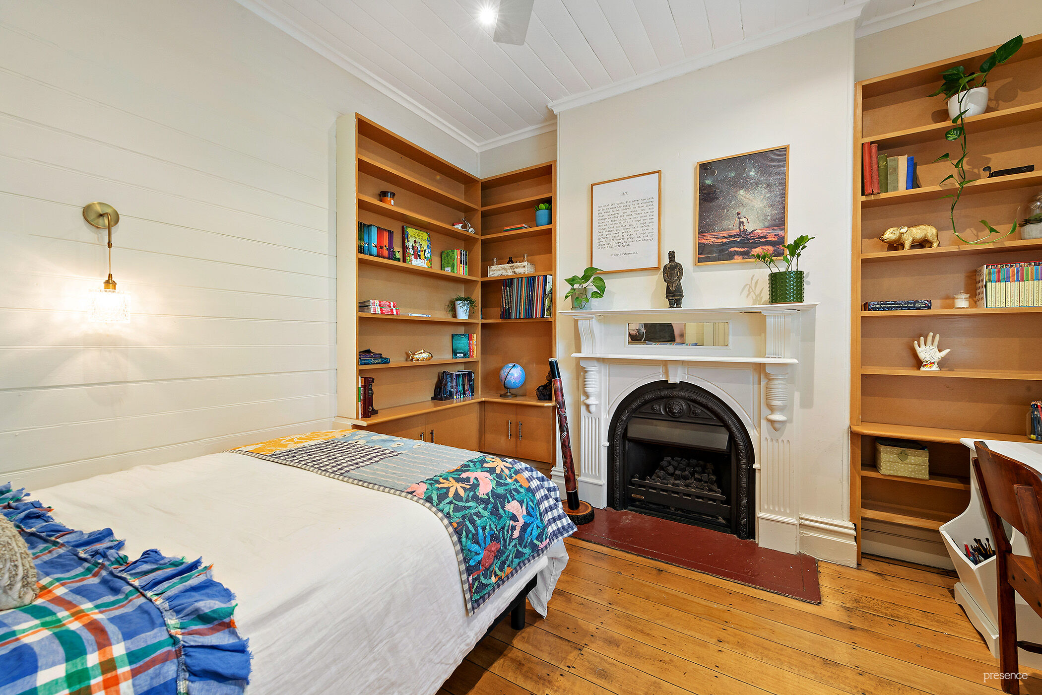 The terrace has a luxurious yet homely feel that is both warm and inviting with an elegant ensemble of timber floors, plush Axminster carpet, Velux skylights, etched glass doors, timber lined ceilings and walls, and gas fires in original timber surrounds. A ground floor bedroom fitted with split system a/c and bookcases offers versatility as an office for those still working from home, while the remaining trio of bedrooms rest in a zone of their own along with the family bathroom upstairs.