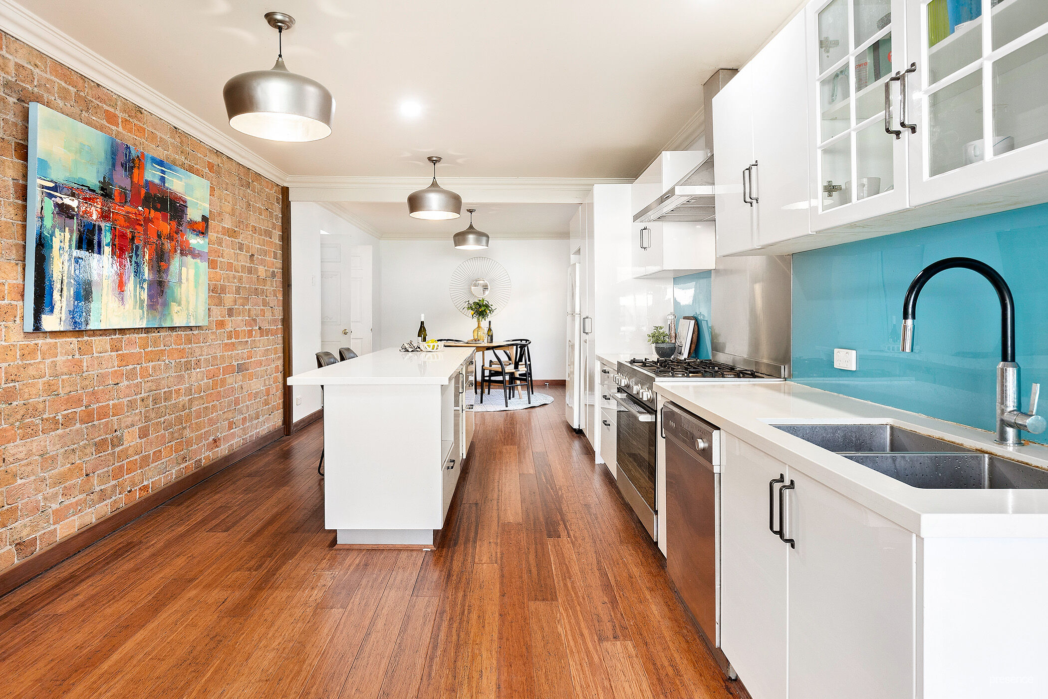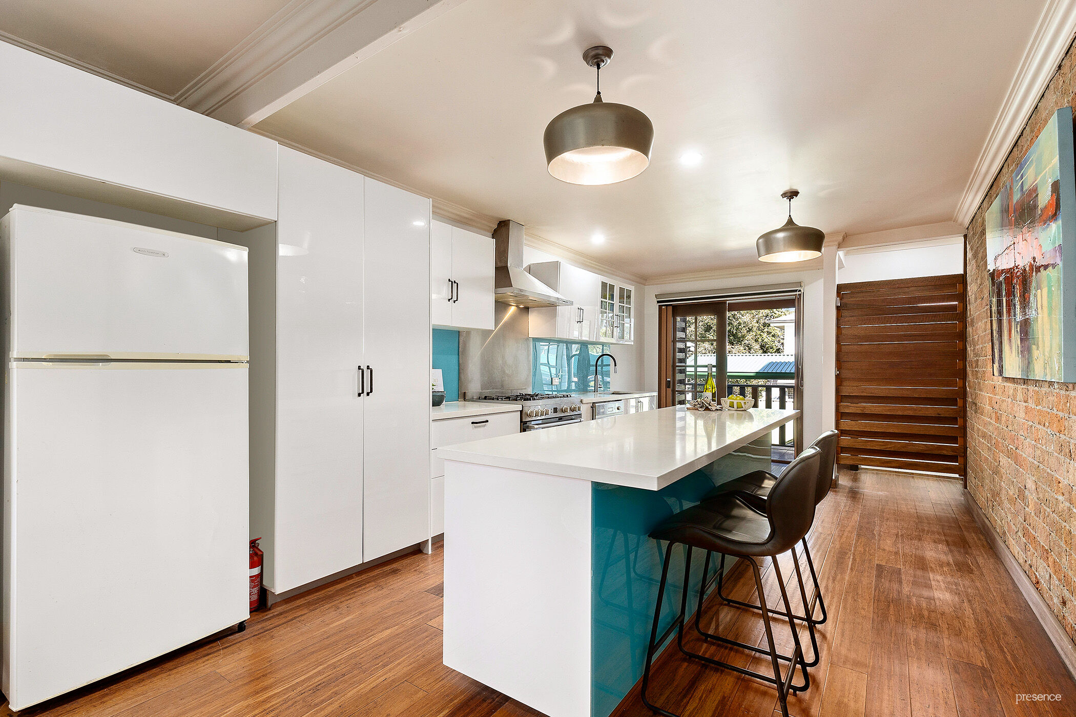 – Modern kitchen with stone counter tops, azure blue splashback and stainless steel appliances including 900mm Euromaid range, additional kitchenette upstairs