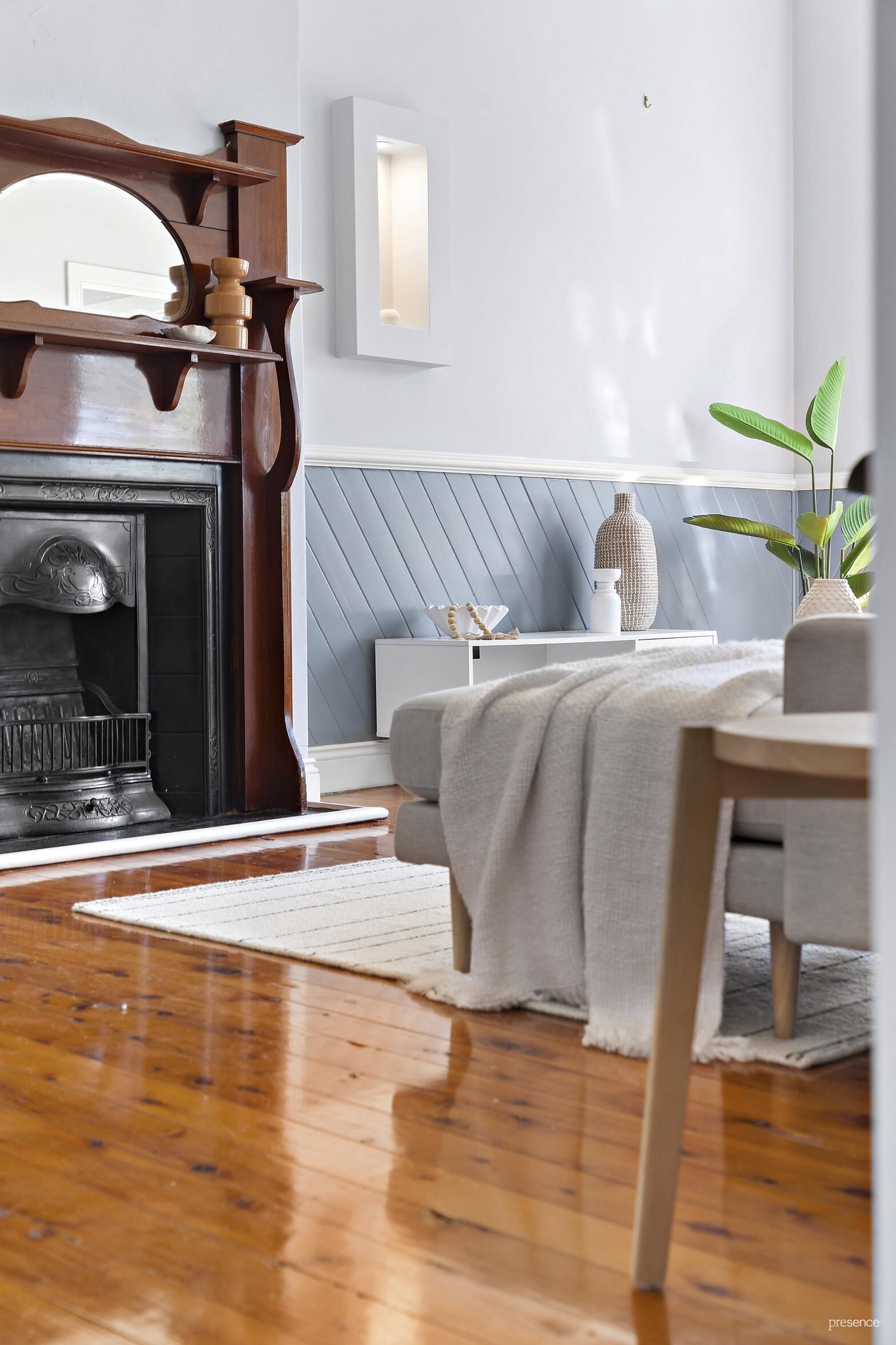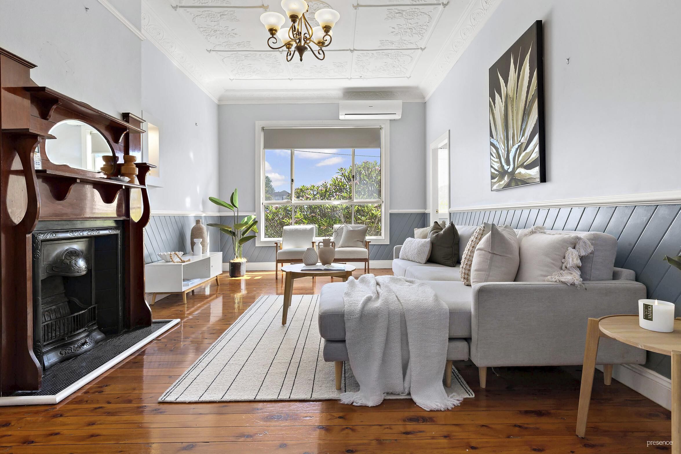 • Expansive air-conditioned lounge room showcasing charming character features such as intricate plasterwork, ceiling roses, ornate cast iron fireplace with timber mantle, and attractive dado-panelling.