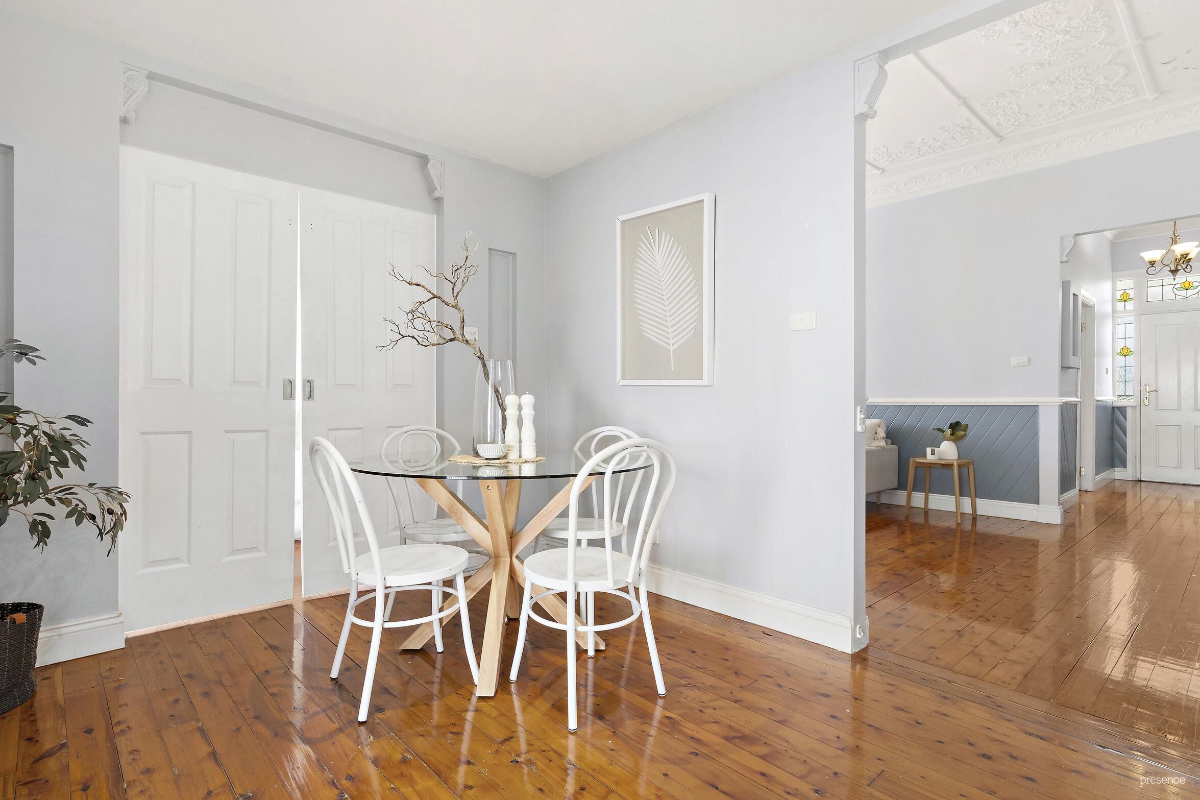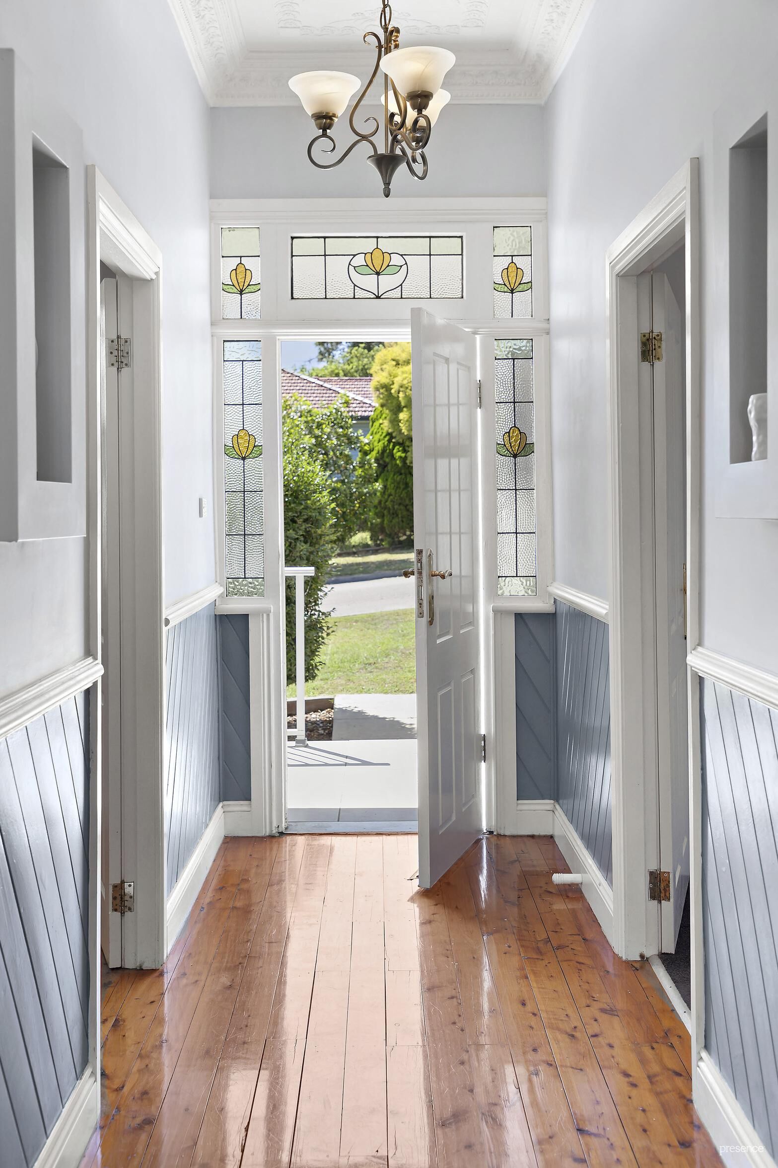 A captivating original garden, with lush camellia and murraya hedging, frames the charming facade and bids you welcome. Stepping up to the front porch – a tranquil space to start the day with your favourite cuppa – you enter via an ornate leadlight-framed front door. Inside, a wide hallway brimming with character awaits where honey polished boards complement the soaring ceilings, adorned with decorative plasterwork. This hallway reveals two expansive bedrooms – on the left, a huge master with a spacious walk-in robe and ensuite, and opposite, another large bedroom with sizeable built-in robe.