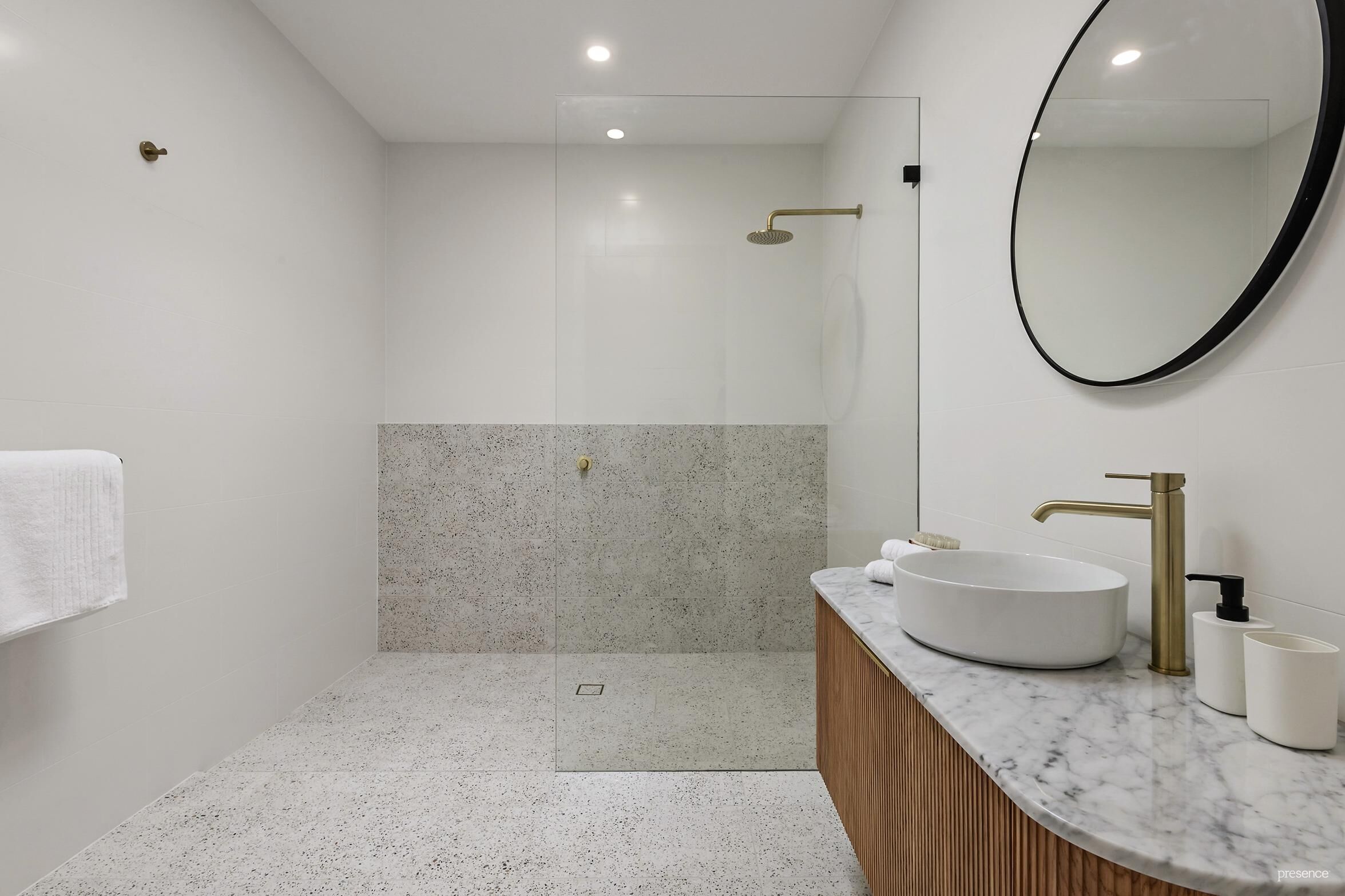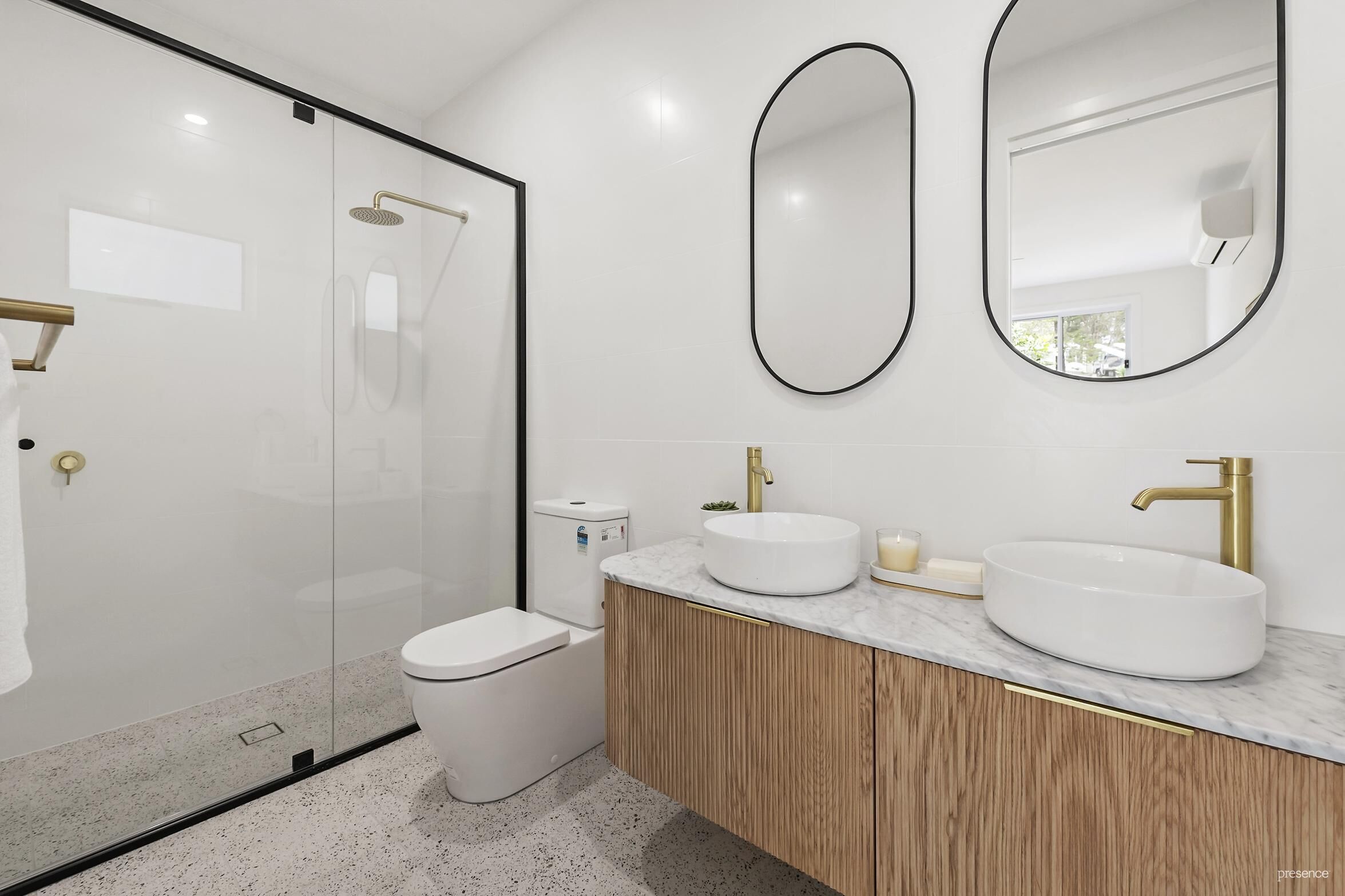 – Quality fixtures and finishes throughout for a luxe living experience, including brushed brass tapware, chic cabinetry and vanities, hybrid waterproof flooring and striking stone benchtops in the bathrooms, kitchen and laundry