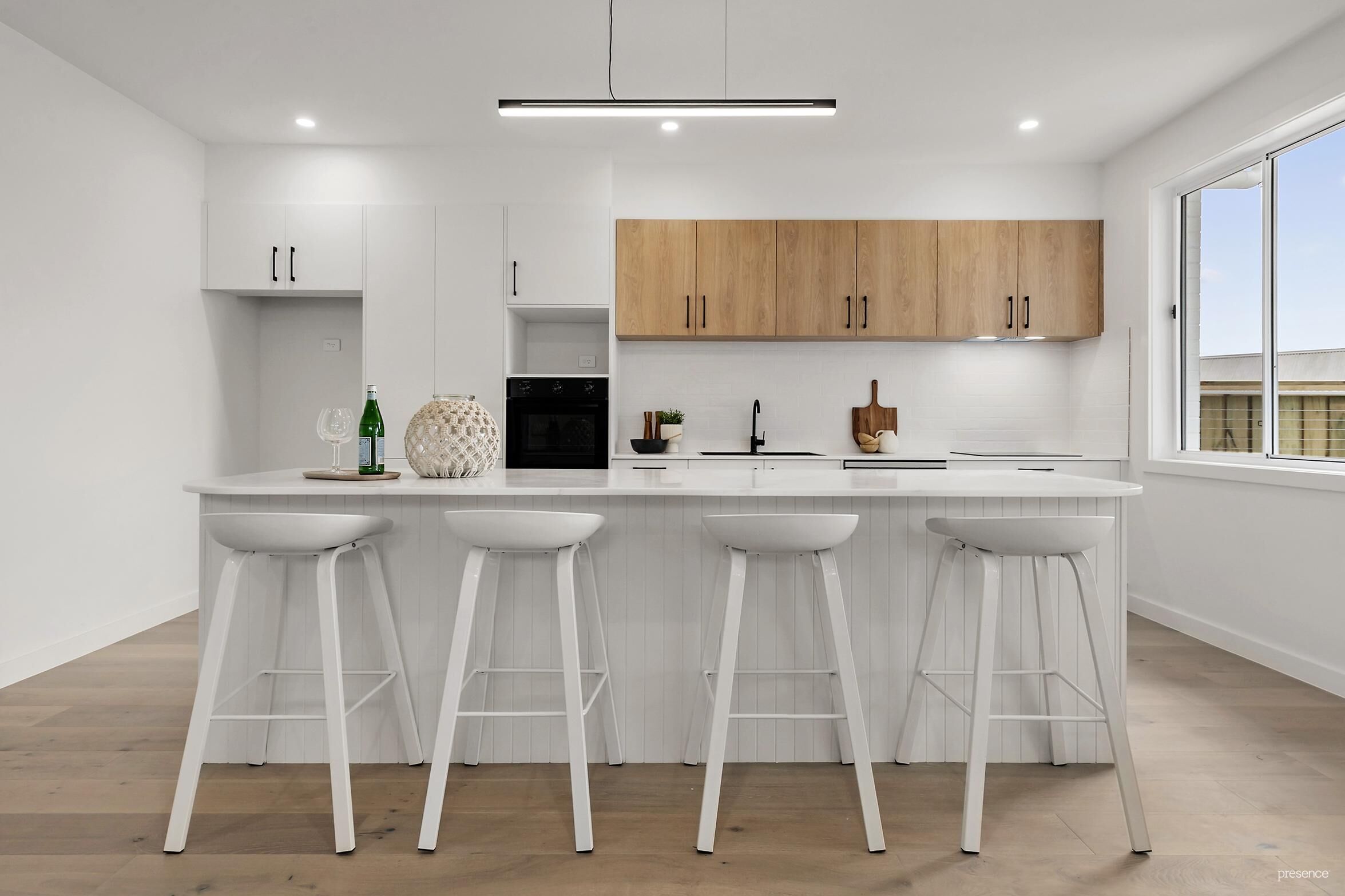 The bright and airy open-plan living, dining and kitchen areas are connected by attractive (and waterproof) hybrid flooring. With split system air conditioning and seamless access to the covered outside terrace, this is a great space for entertaining or relaxing. The chic contemporary kitchen features a striking stone island/breakfast bar, quality Haier appliances, and dual sinks, making it tailor-made for cooking up a storm. Outdoors, your private terrace is the perfect place for hosting a BBQ or taking in the lovely views over lush lawn, gardens and the nearby lake. Combined with a roomy internal laundry and a single-car garage with an extra car space, everything about this new build allows for effortless living.