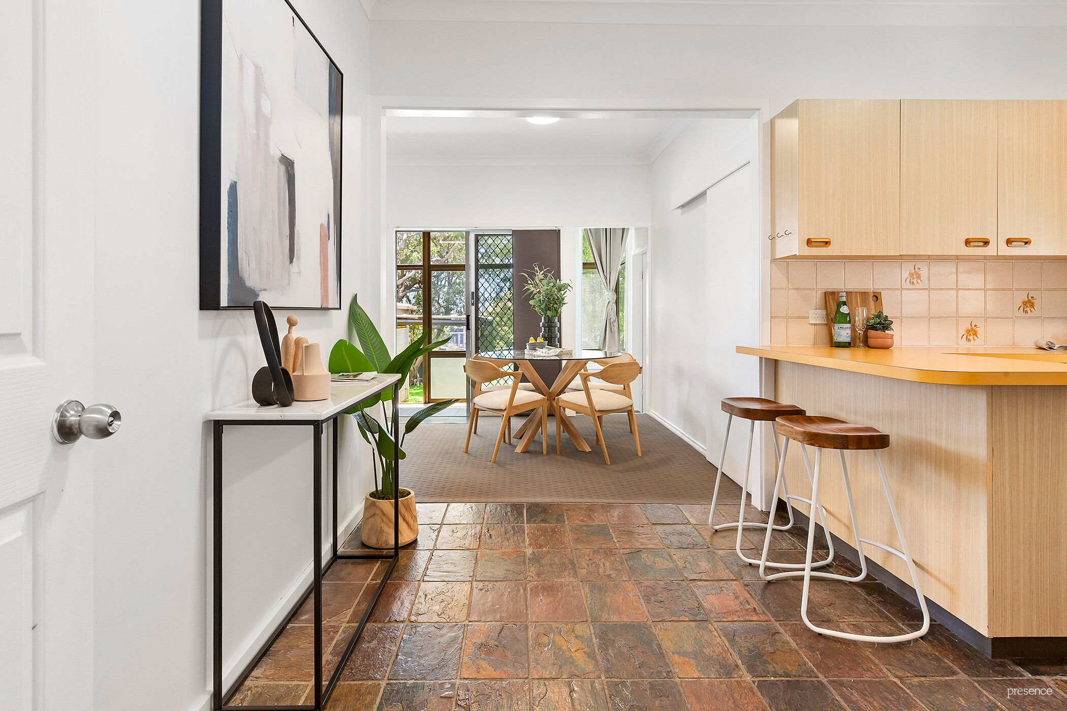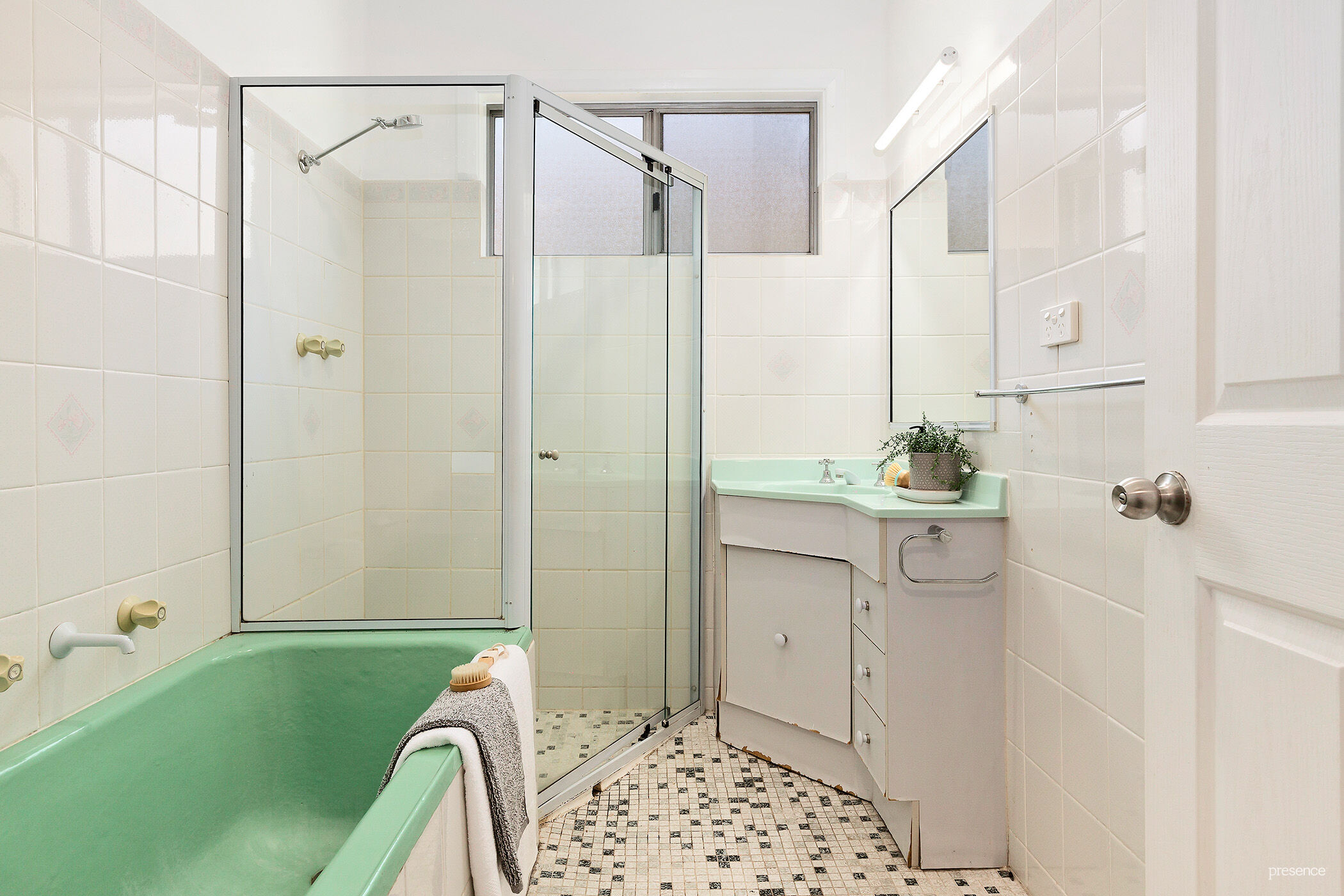 As you enter from the wide, covered patio, you will discover three large bedrooms, each sporting built in robes and fans, while the master provides an extra layer of comfort with its own AC. These rooms are serviced by a well-equipped retro bathroom featuring mosaic flooring, a deep enamel cast-iron bath, a separate shower and corner vanity unit. An adjacent linen closet and large laundry with tall cupboards add convenience and plenty of storage.