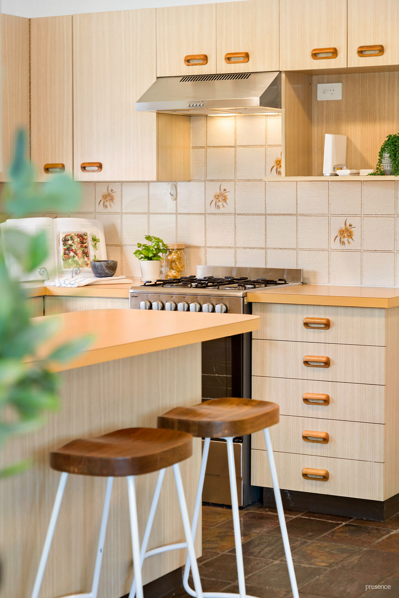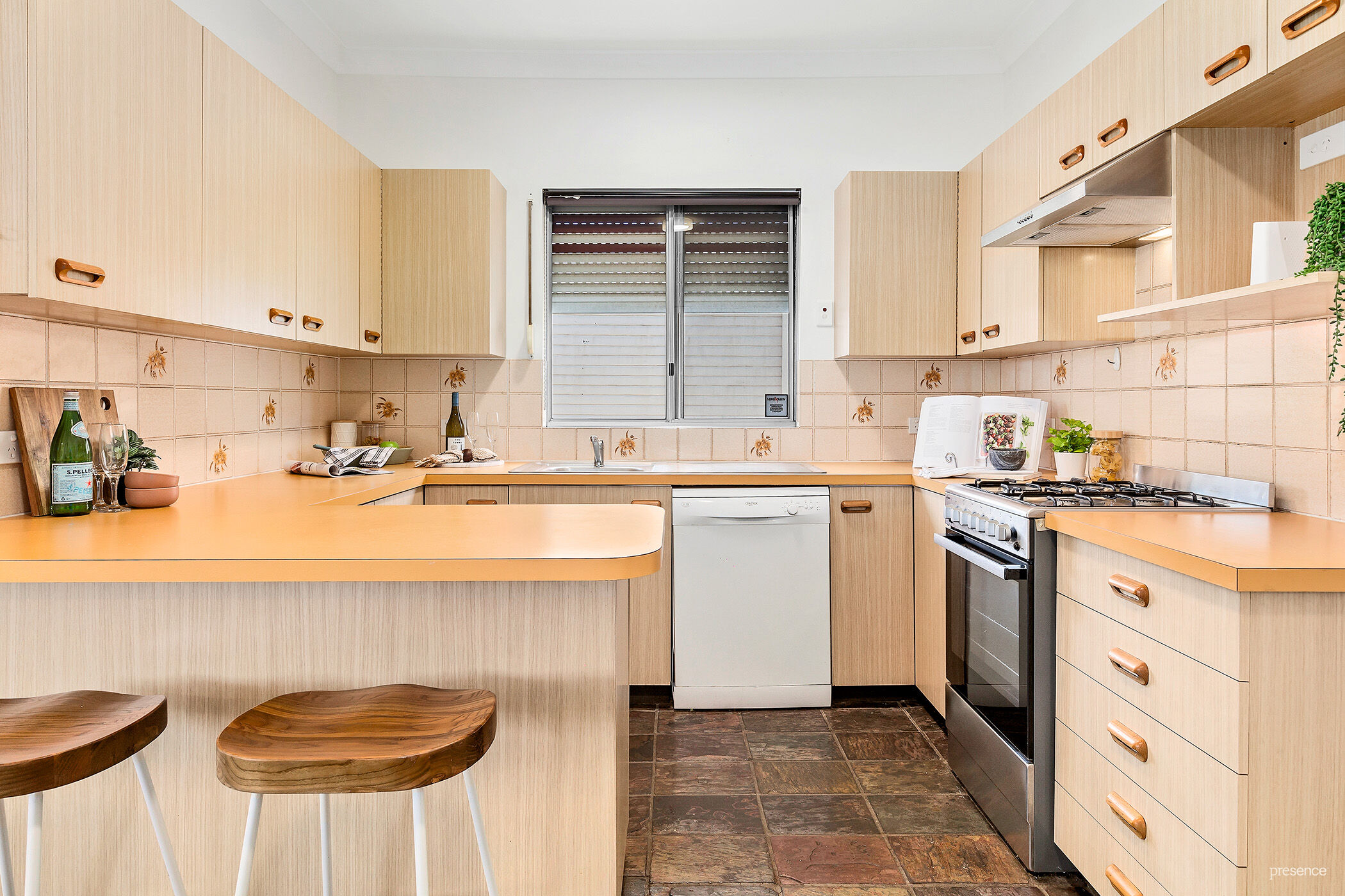 – Retro, orange-topped kitchen – well constructed and offering every amenity – including stainless steel cooker and rangehood, dishwasher, cupboards and benchspace galore, including breakfast bar.
