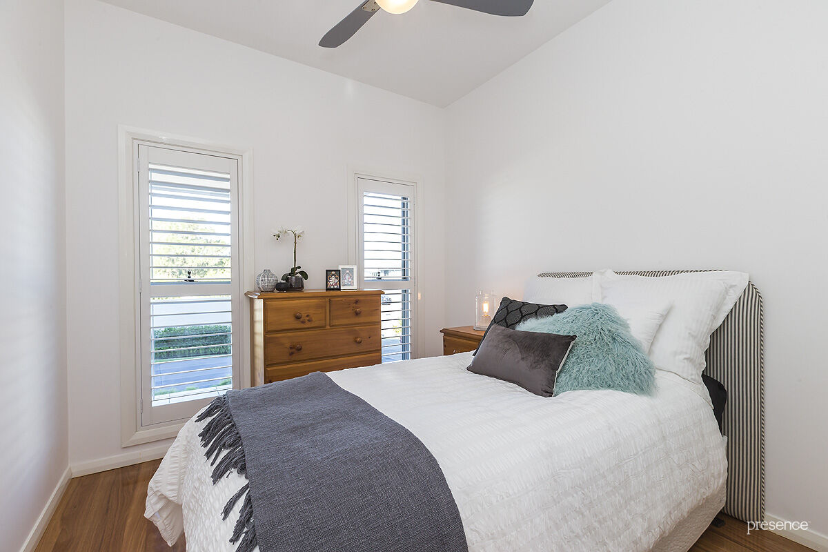 The home’s clever floorplan sees the main living expanse and master bedroom, ensuite and lake view alfresco dining up top, while a sought-after second living space, two secondary bedrooms and family bathroom sits below and flows seamlessly out to the backyard. The open plan design of the lounge and dining area facilitates relaxed family living, and the island kitchen offers premium appliances, a huge amount of stone bench space and clever cabinetry. All bedrooms are appointed with built-in robes, ceiling fans and plantation shutters and are served by two fully tiled bathrooms, both styled to perfection with contemporary fittings. A single garage ties the bow while the expansive driveway provides additional parking for a boat or motorhome