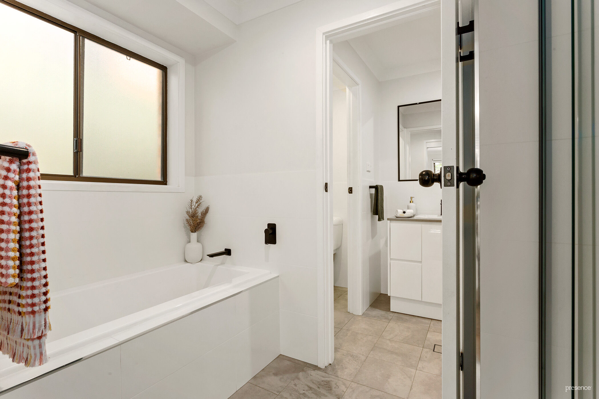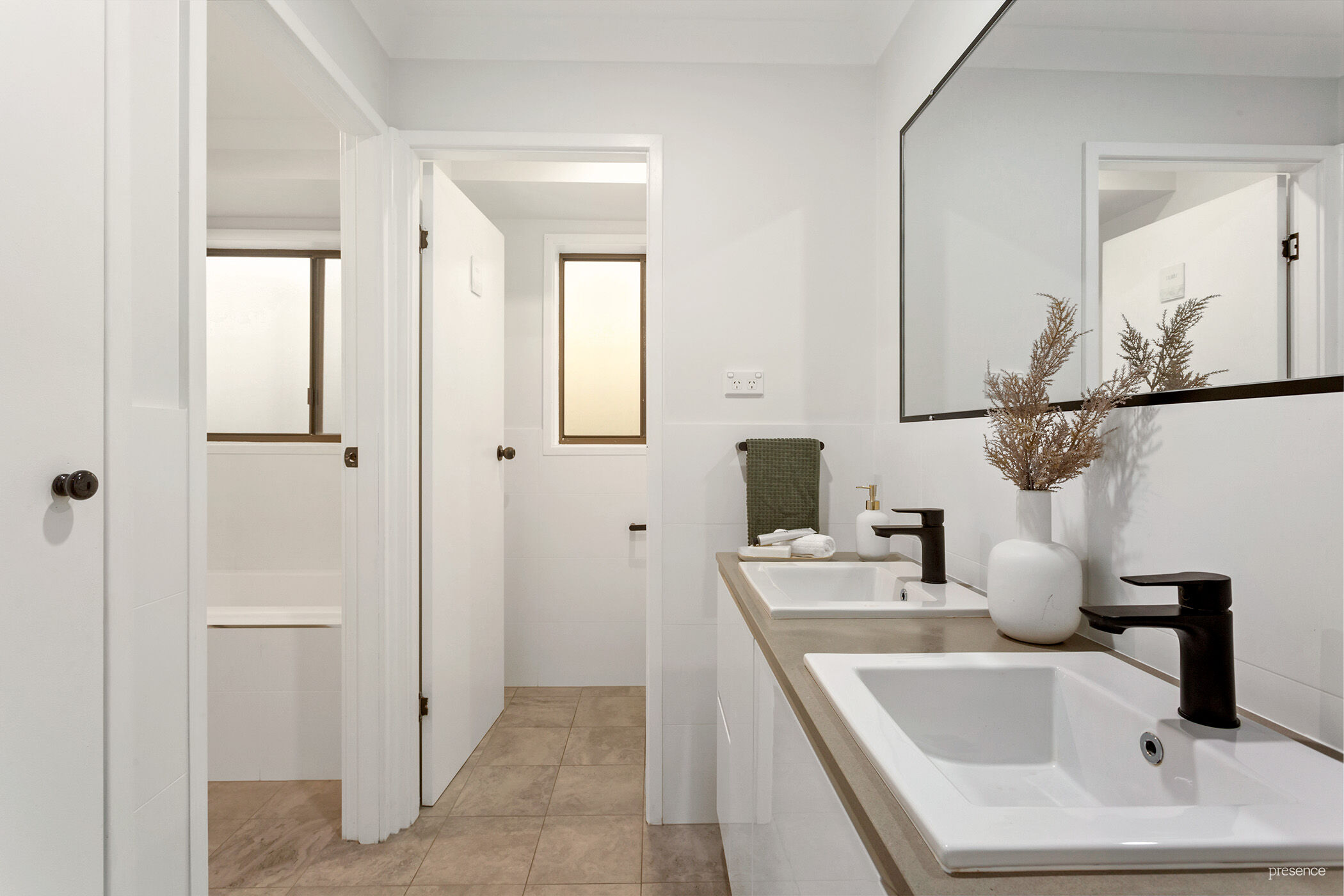 – Two-way renovated bathroom with twin vanity unit, shower, bath, and separate toilet.
