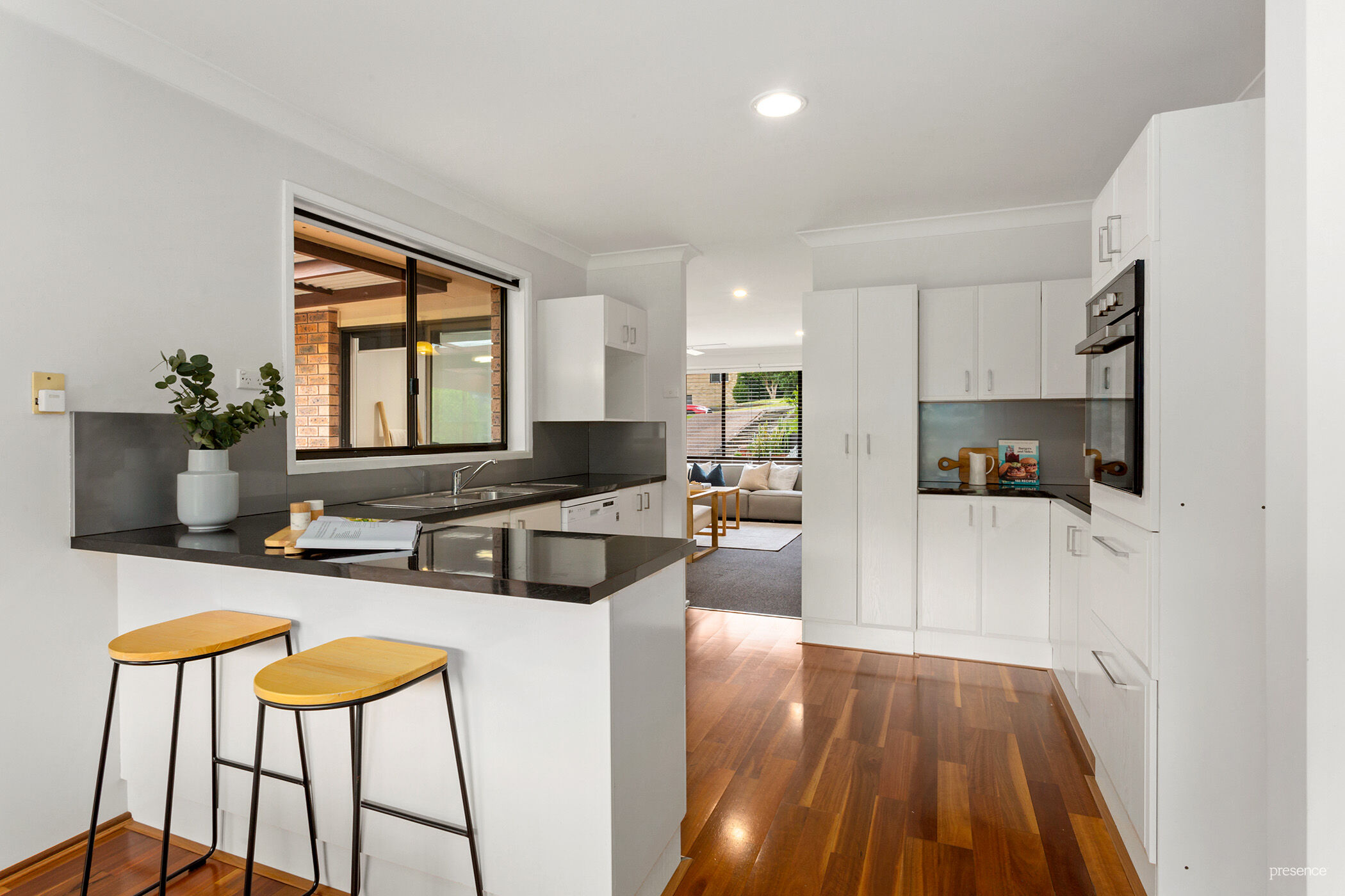 – Timeless black and white kitchen with dishwasher, double pantry, a breakfast bar, and loads of benchspace and storage.
